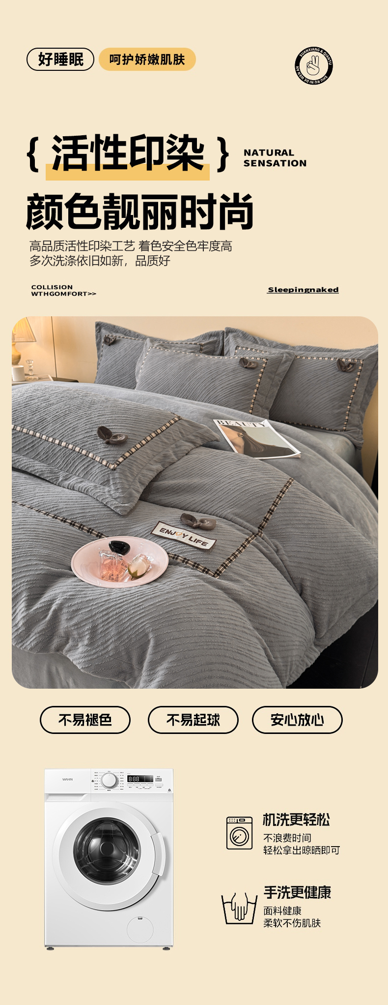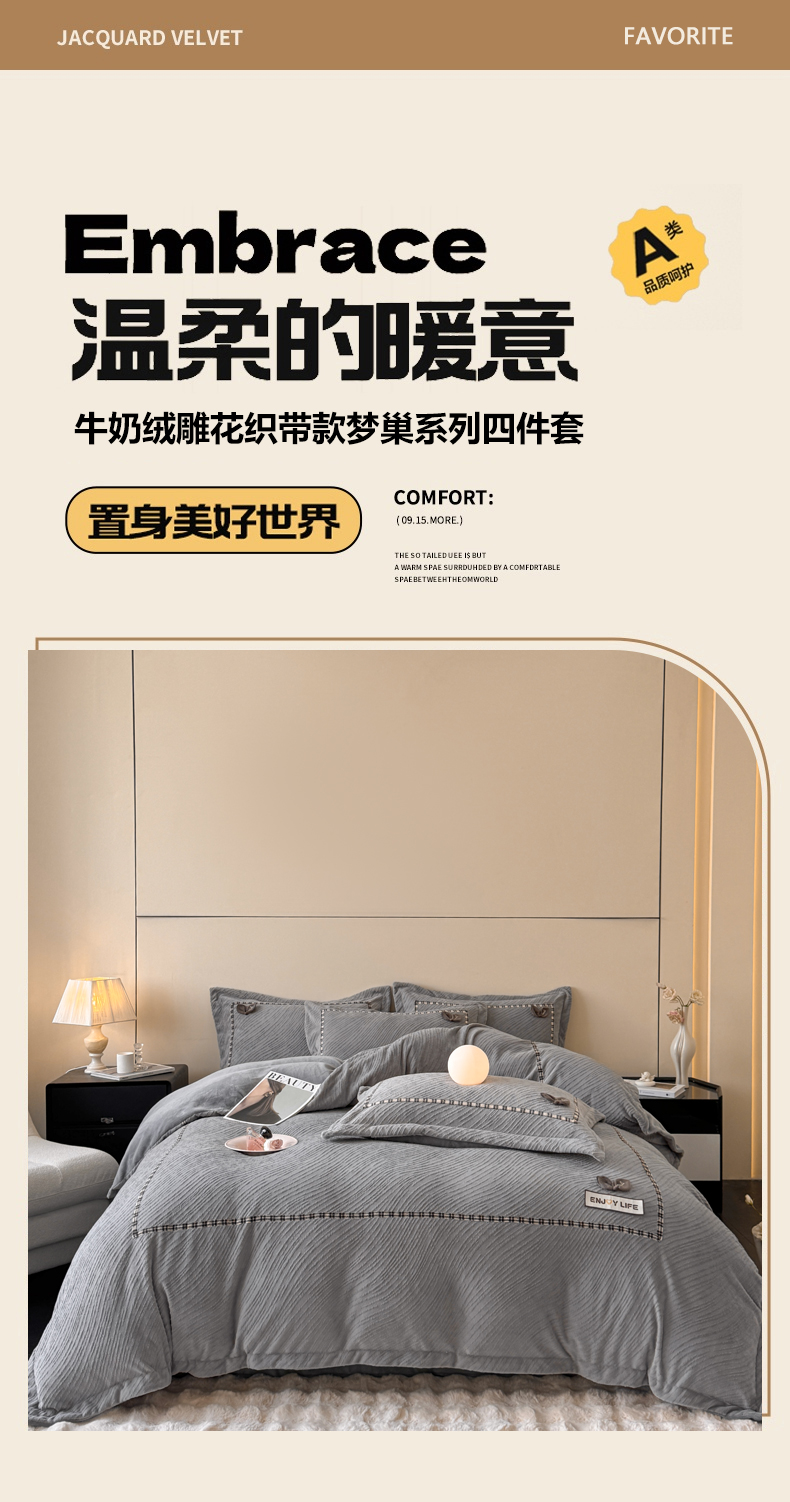 (总)叠派家纺 2025新款高克重高端牛奶绒雕花织带工艺款梦巢系列四件套(直播热款)提供买家秀,梦巢-星空蓝,梦巢-金典灰,梦巢-麦卡其,梦巢-玉粉,送精美手提包装
