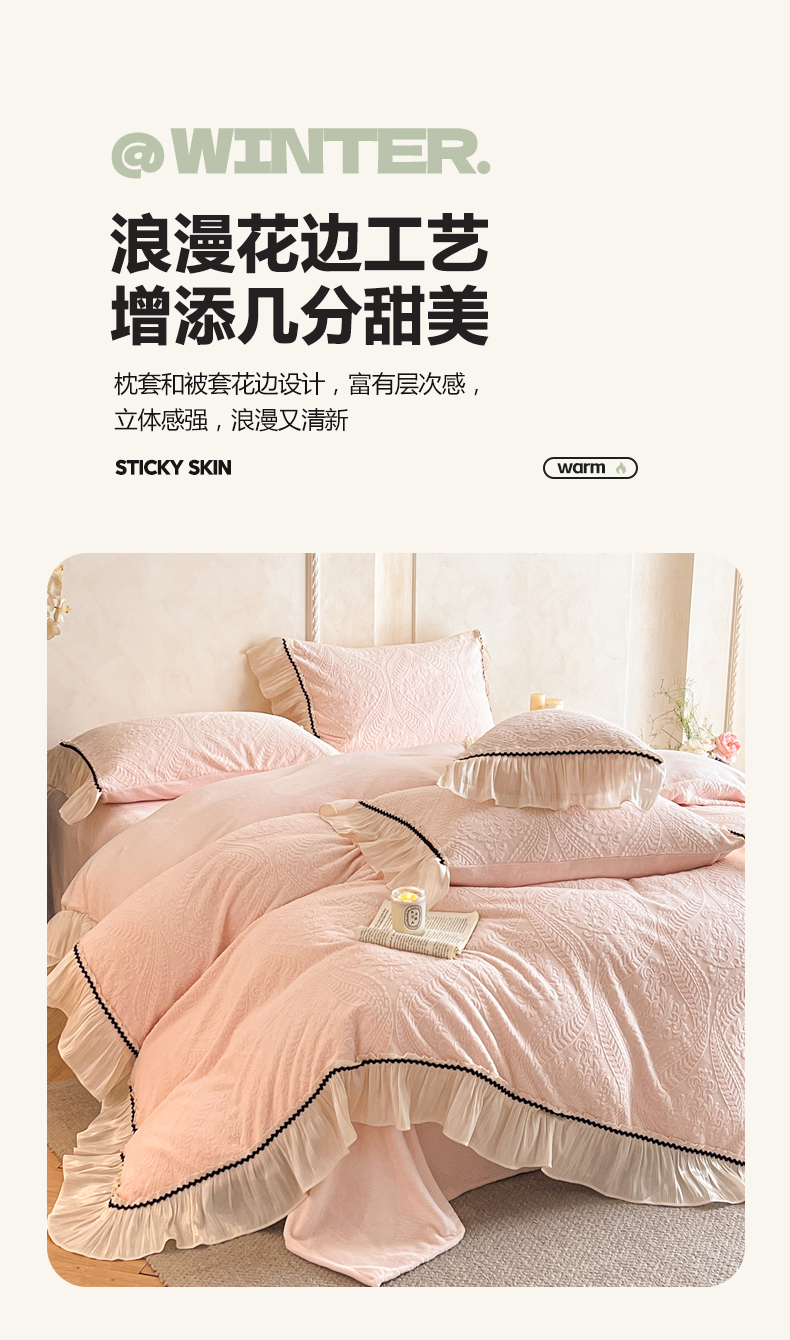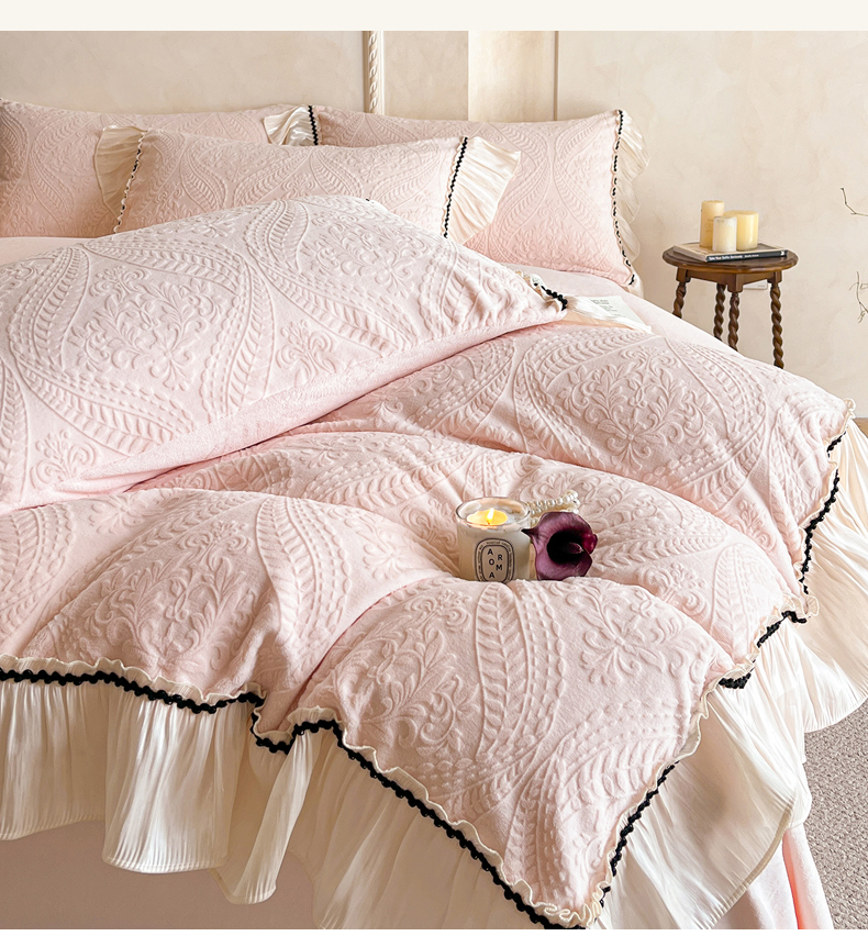 商品名称:叠派家纺 2025新款高克重高端牛奶绒雕花欧式花边工艺款巴洛克系列四件套(直播热款)提供买家秀 巴洛克-千禧粉