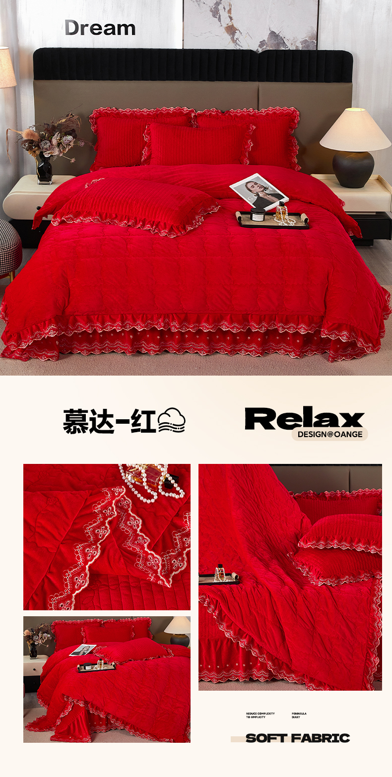 (总)默忆 2025新款宝宝绒蕾丝刺绣花边四件套,浪漫粉,秋日橙,珊瑚红,水晶紫,洋气红,云雾蓝