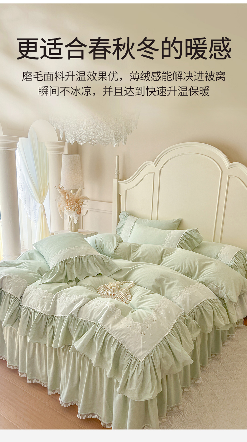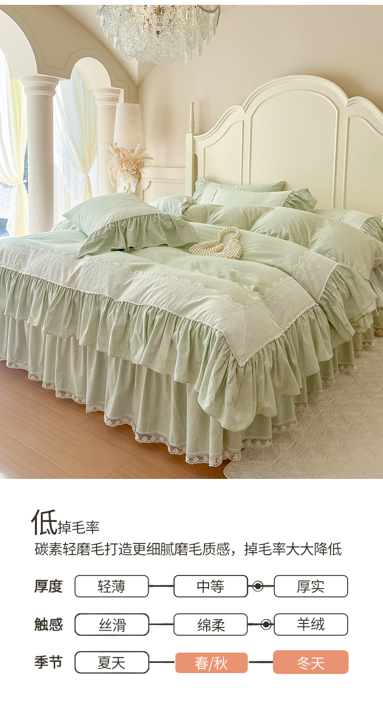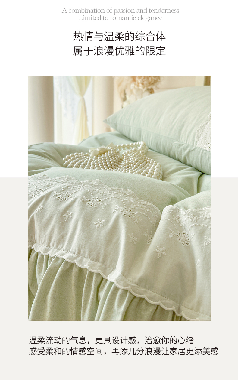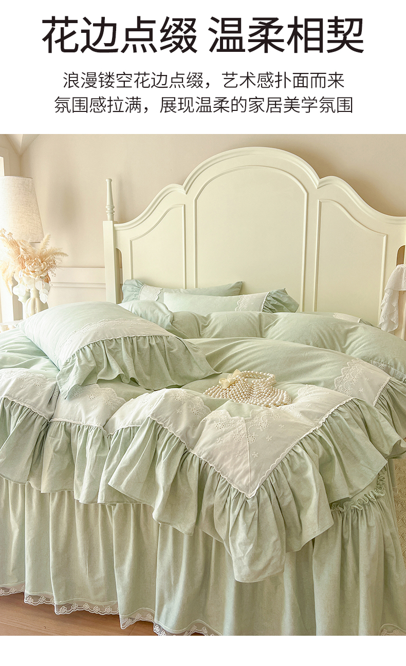 网红馆(ck家纺) 2025新款全棉磨毛蕾丝边花边四件套--梵妮系列 梵妮-牛油果绿