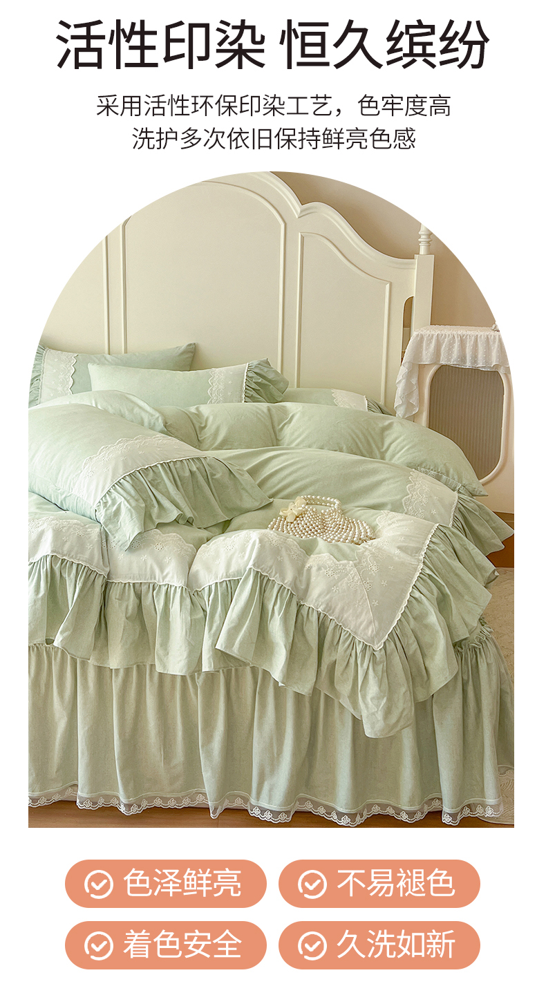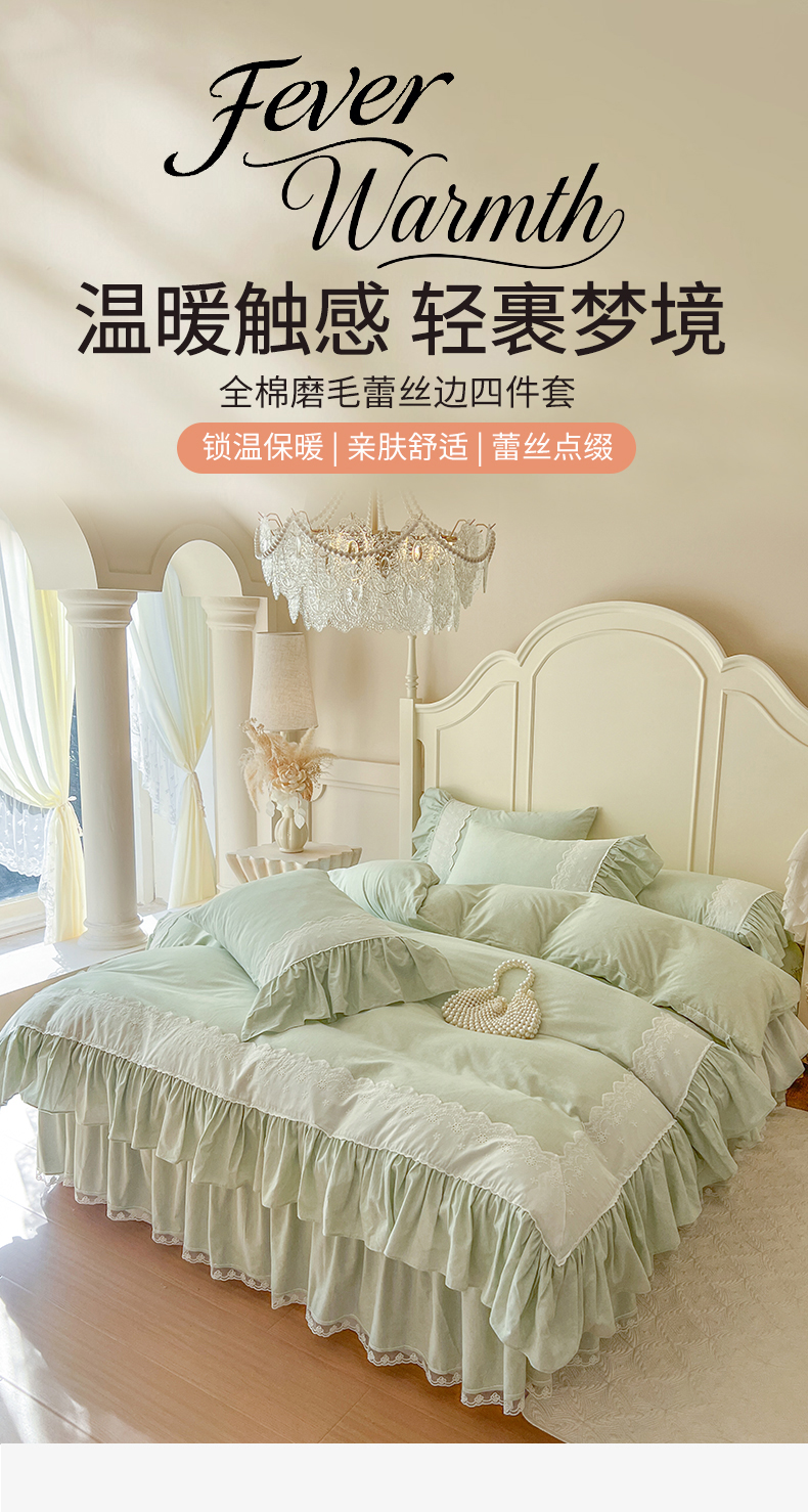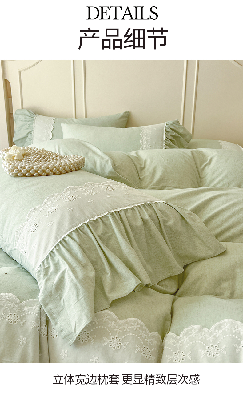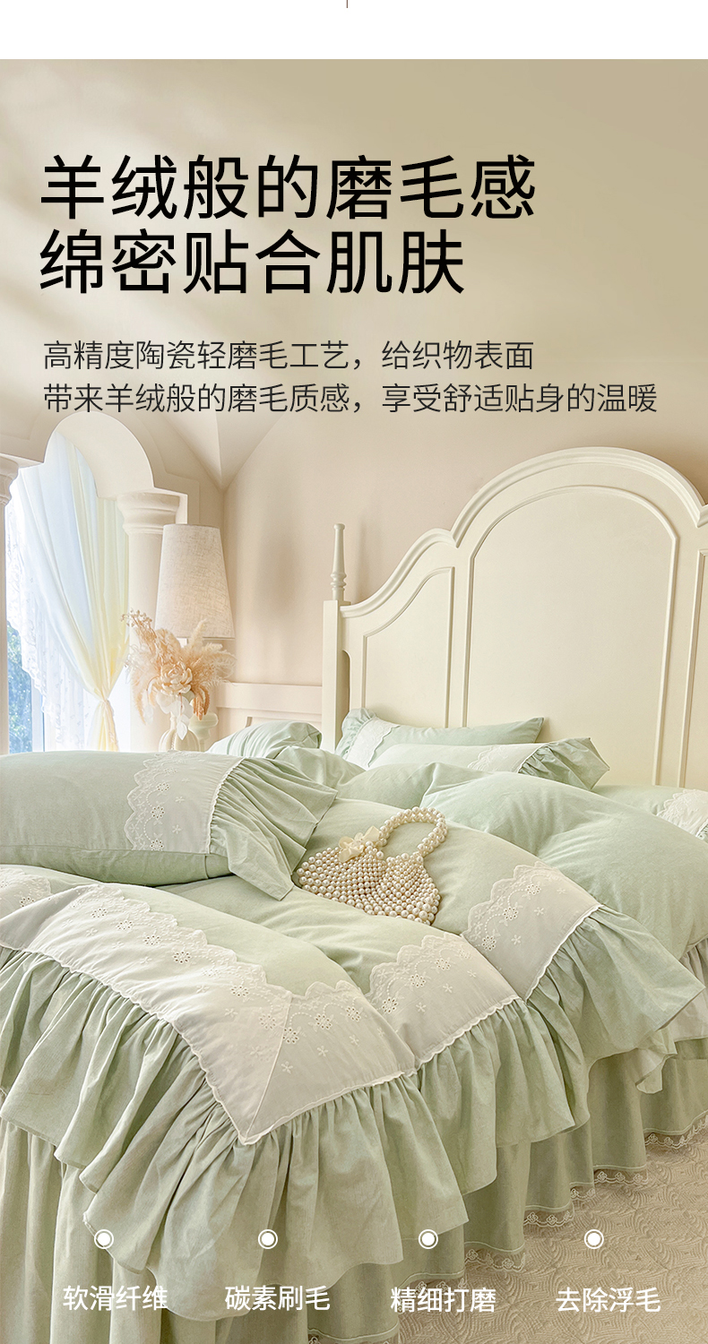 网红馆(ck家纺) 2025新款全棉磨毛蕾丝边花边四件套--梵妮系列 梵妮-牛油果绿