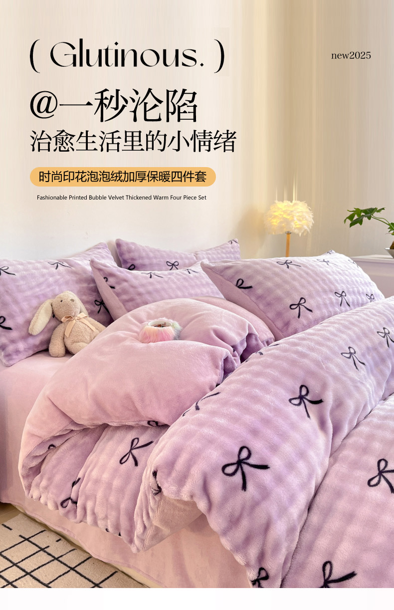柒月家居 2025新款时尚印花泡泡绒加厚保暖四件套套件 蝴蝶结紫