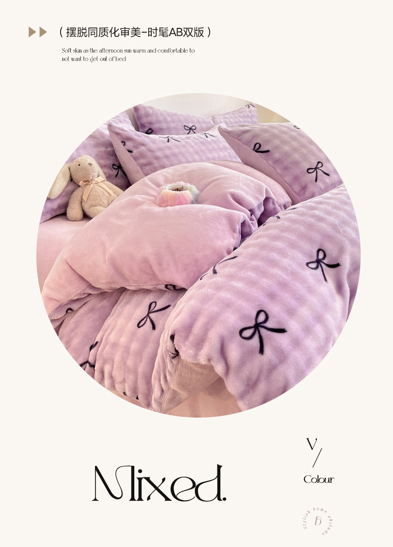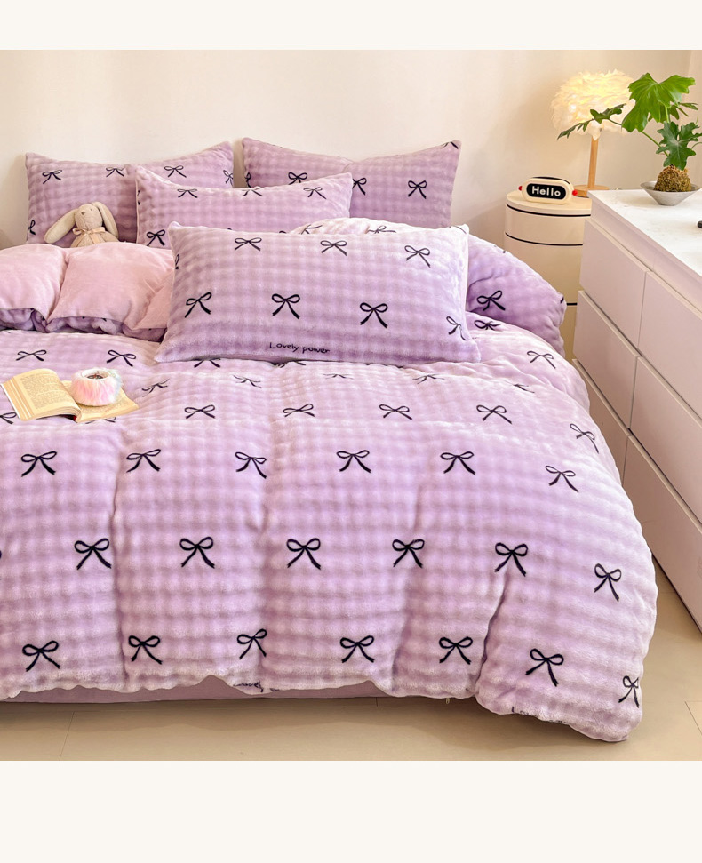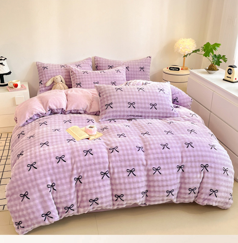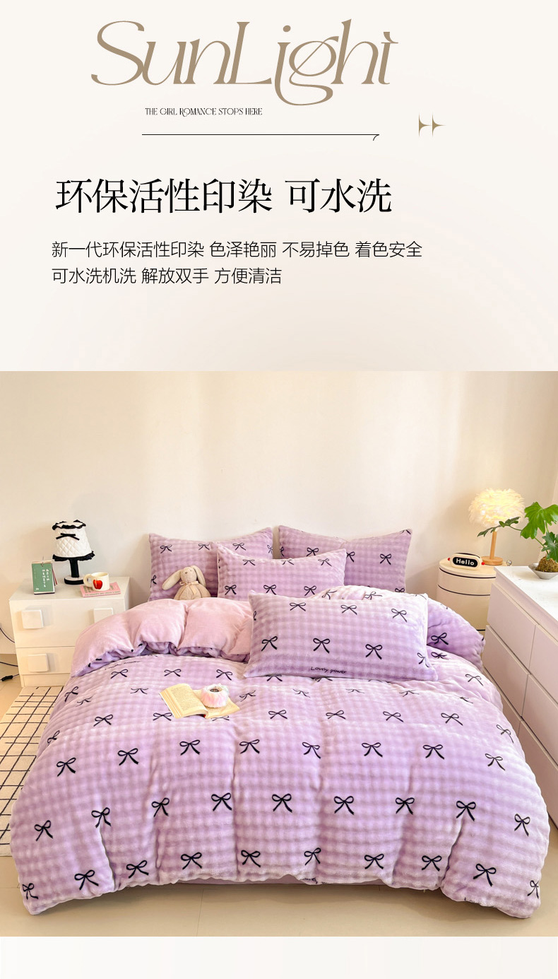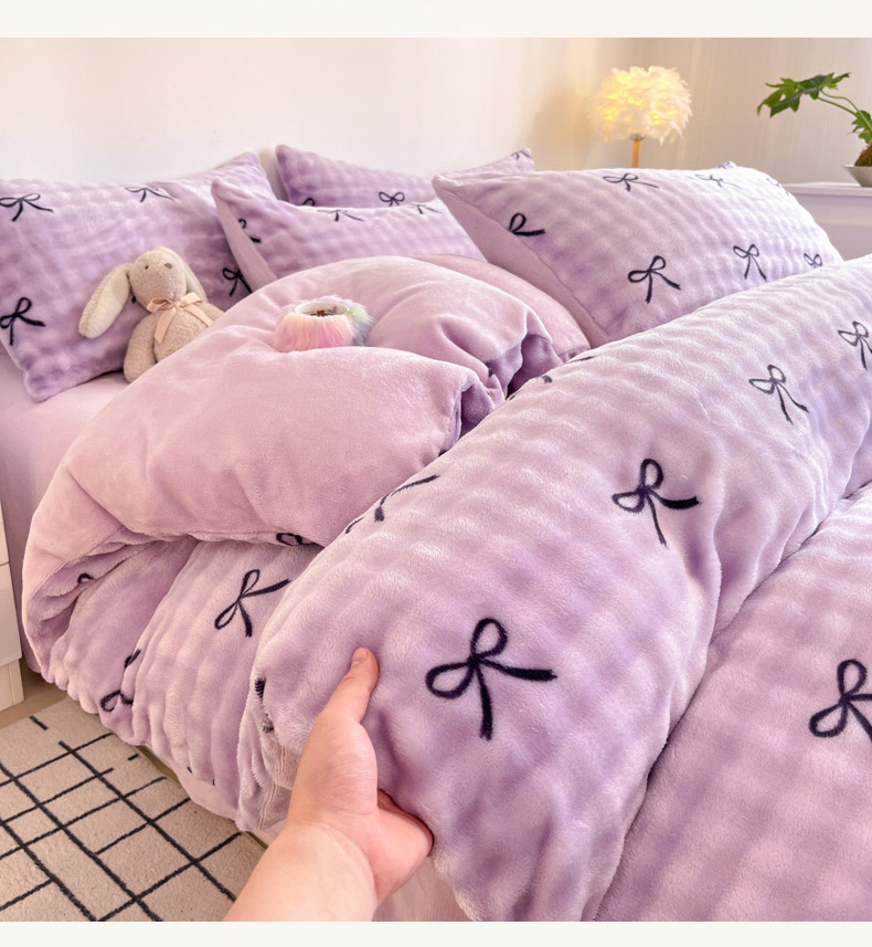 商品名称:柒月家居 2025新款时尚印花泡泡绒加厚保暖四件套套件 蝴蝶结紫