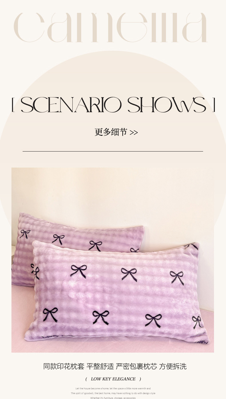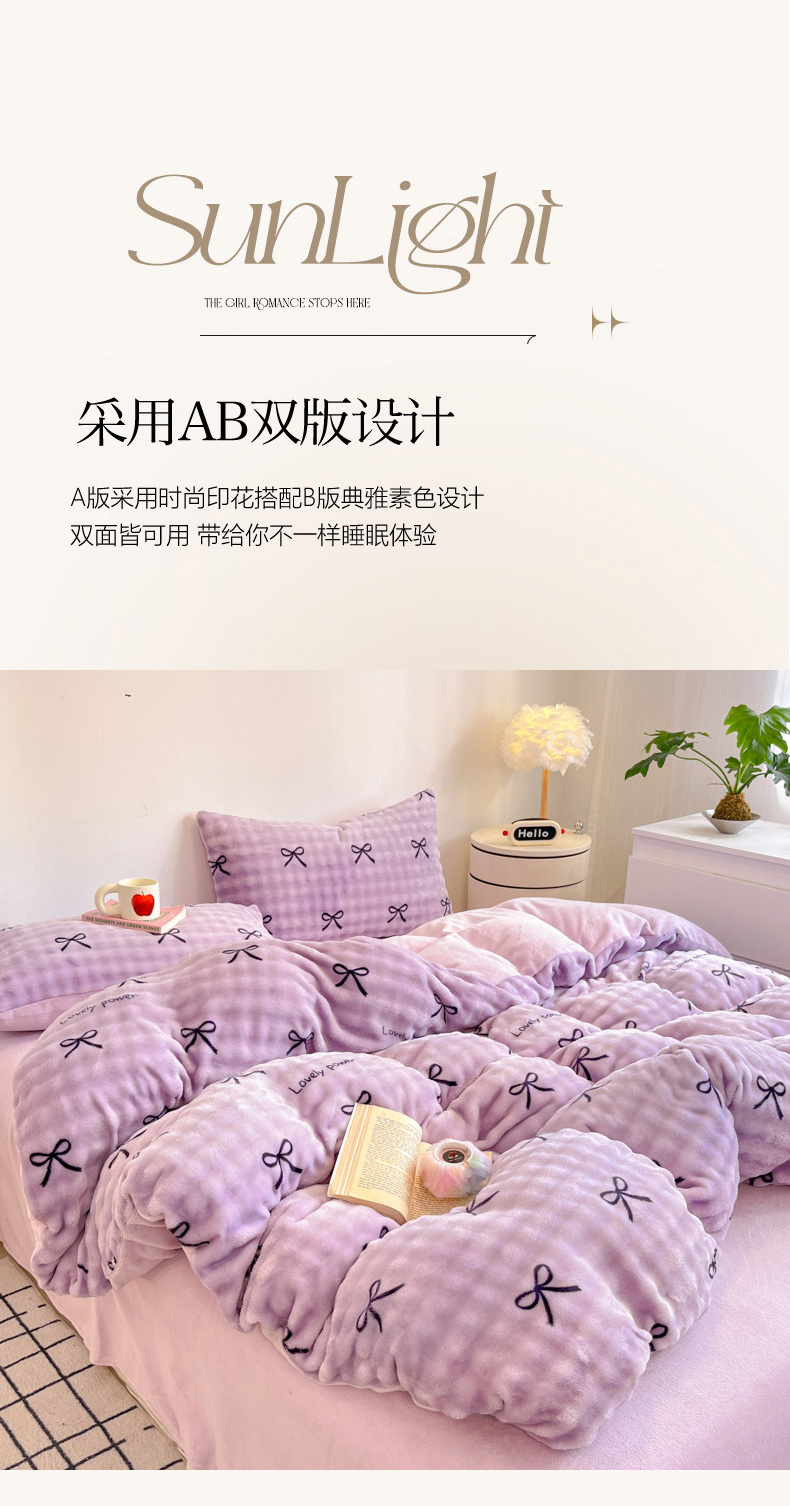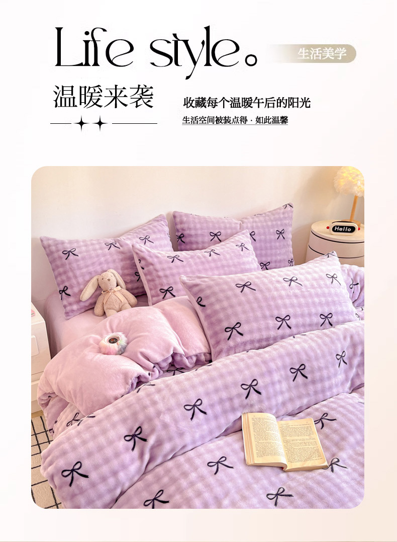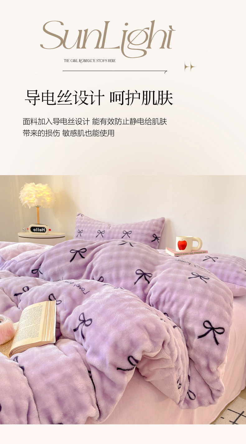 商品名称:柒月家居 2025新款时尚印花泡泡绒加厚保暖四件套套件 蝴蝶结紫
