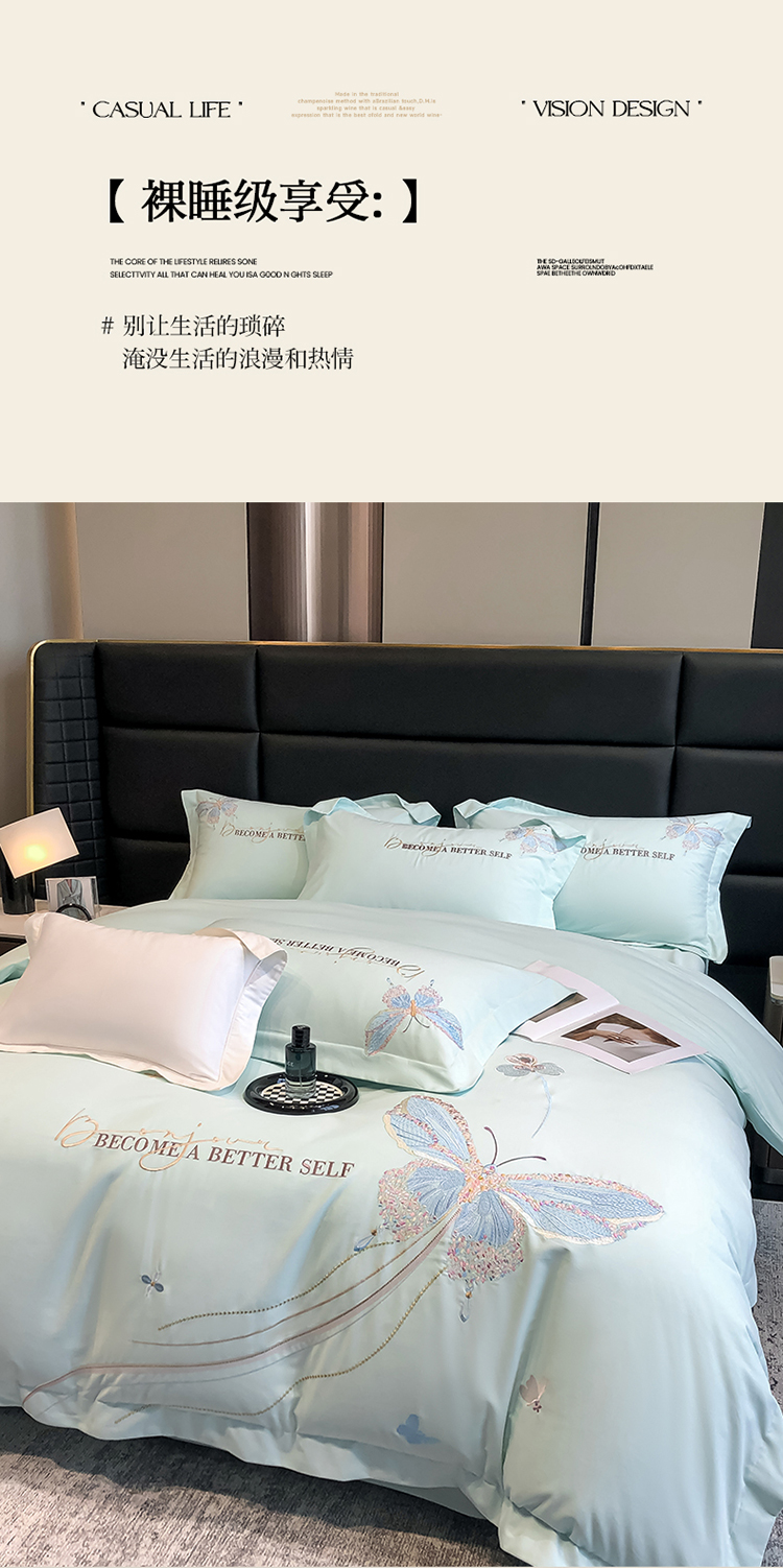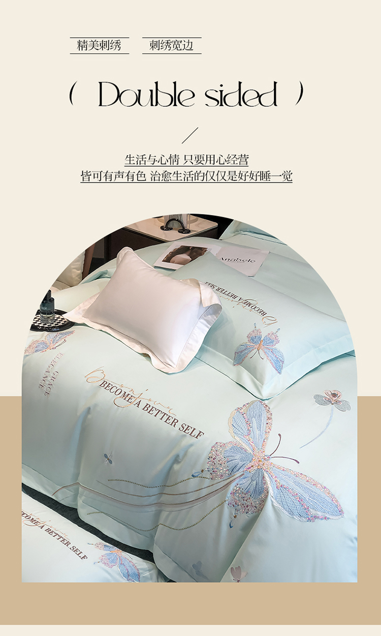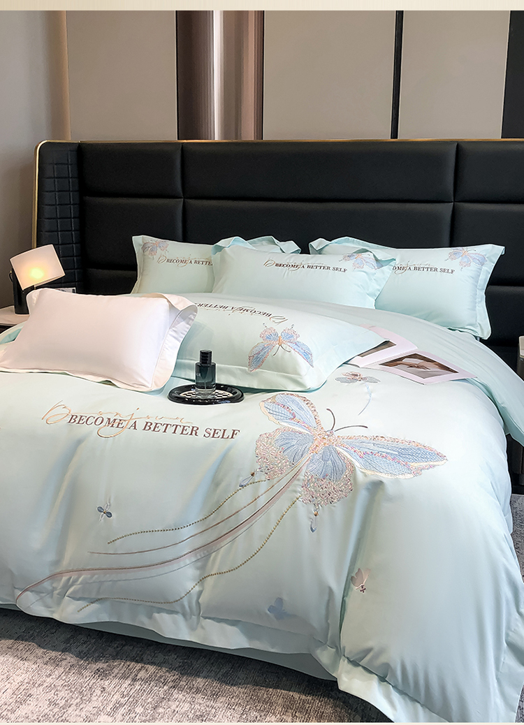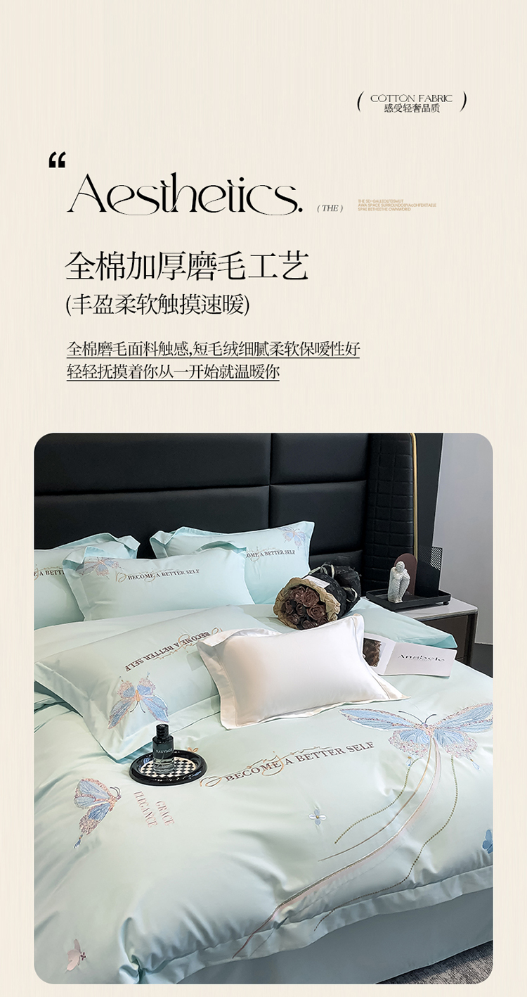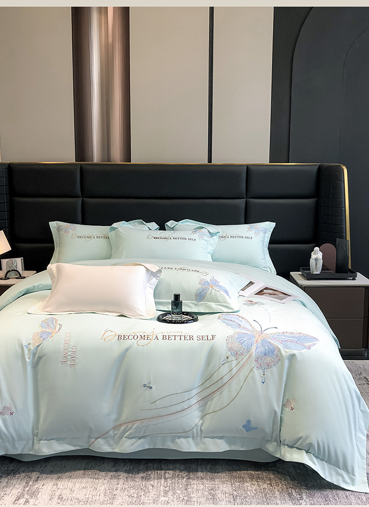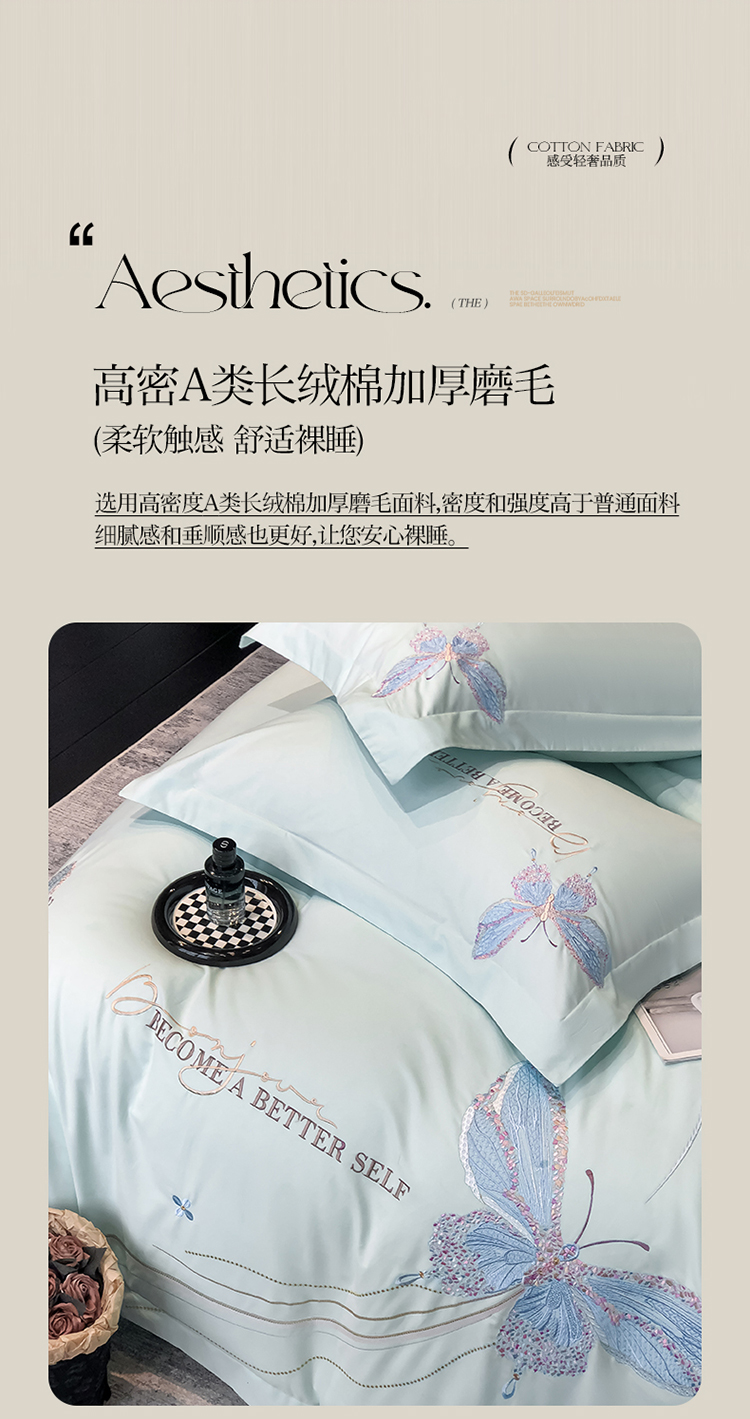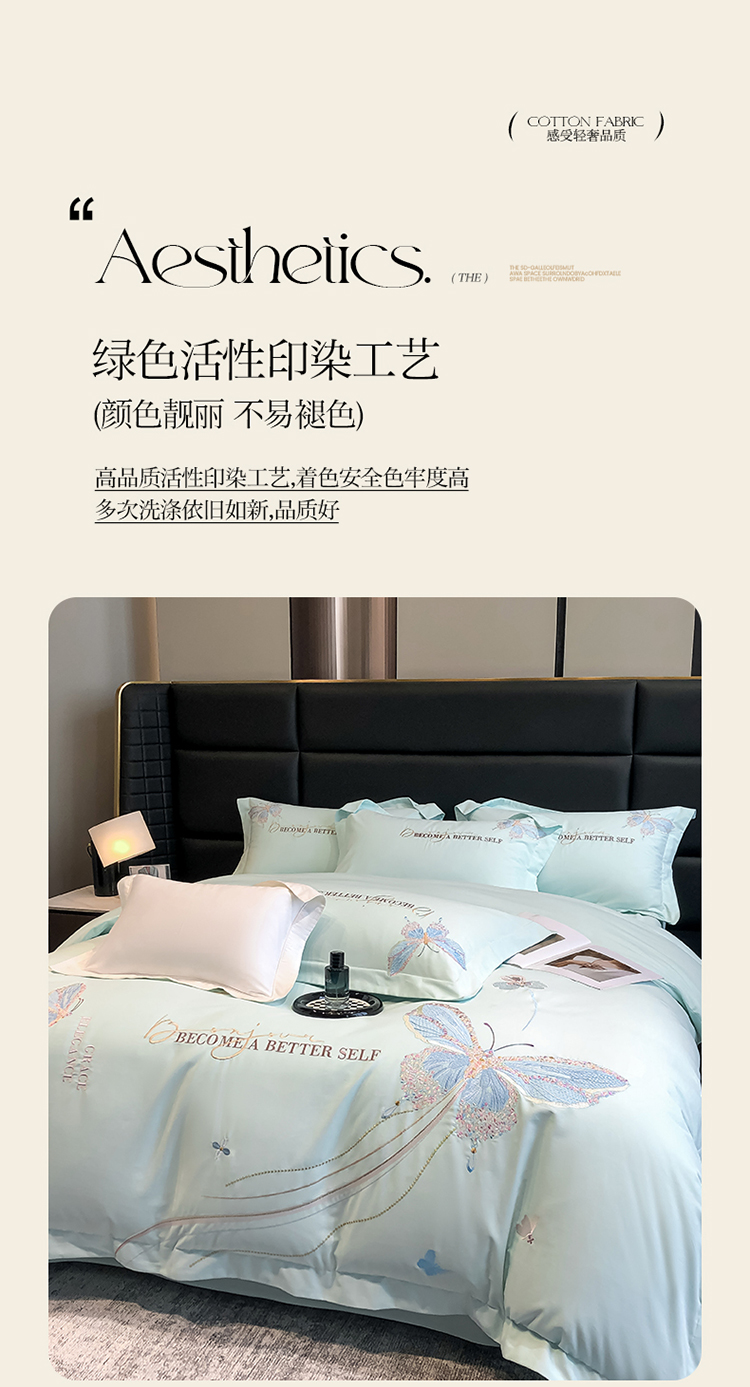 当前位置: 91家纺网 > 商品网购 > 床品套件 > 四件套 > 长绒棉四件套 > 高档礼盒装超细旦超柔长绒棉磨毛刺绣四件套秋冬加厚100%纯棉全棉床品 绮蝶-淡湖绿-A类超细旦长绒棉磨毛