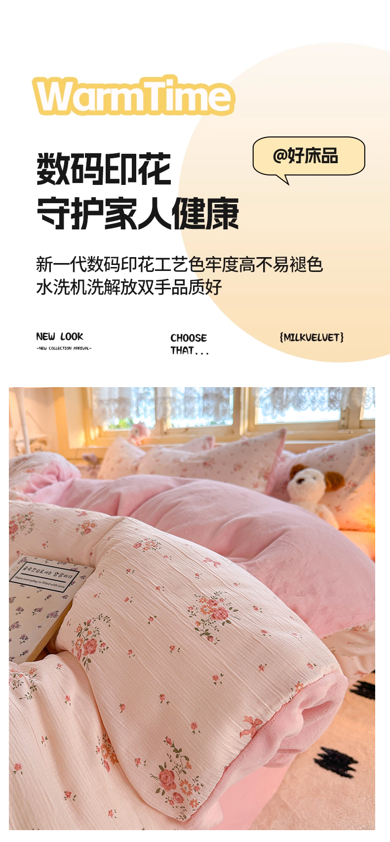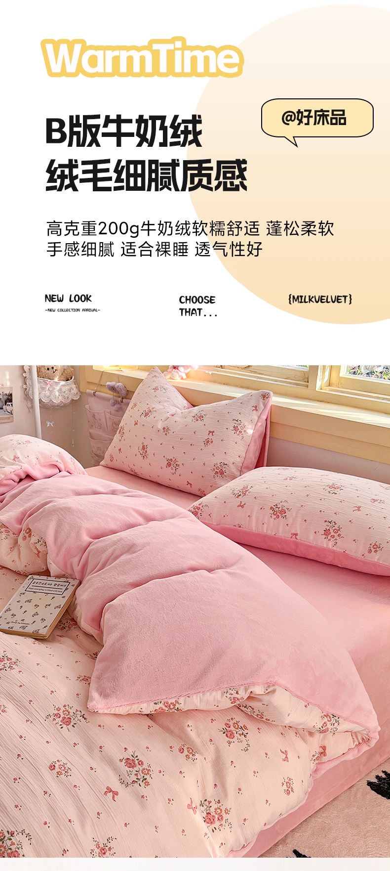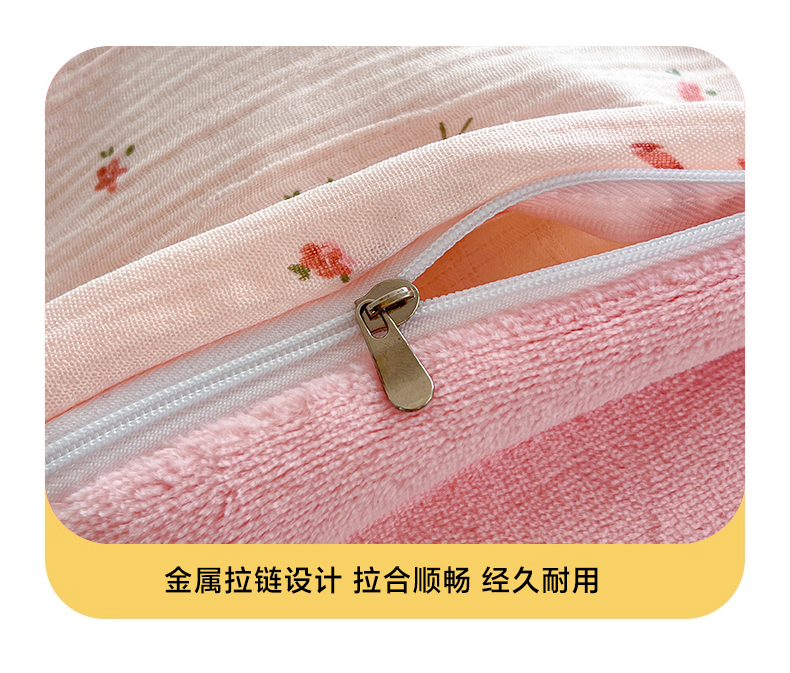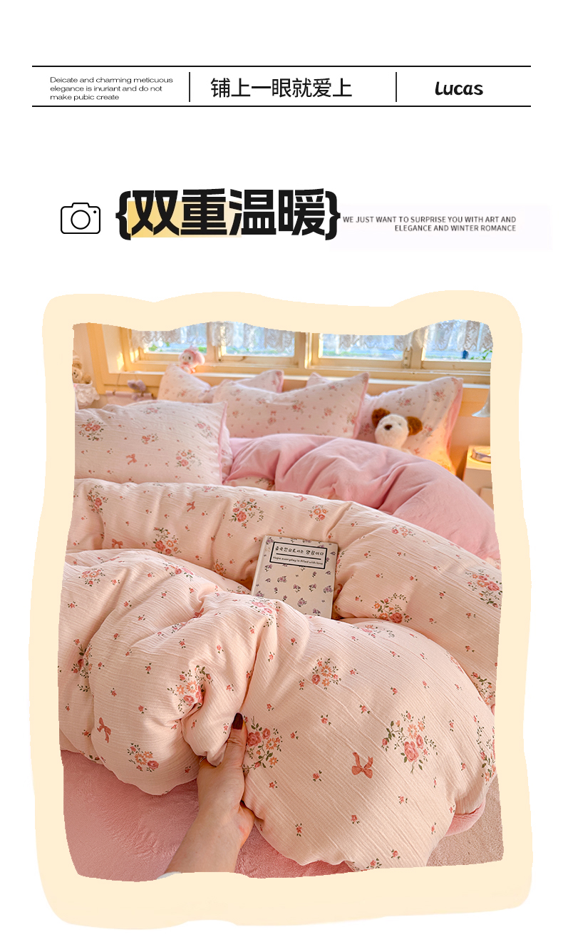 商品名称:玉海棠家纺 2025新款A版三层纱B版牛奶绒四件套系列 粉黛