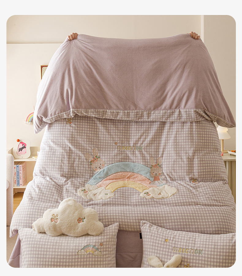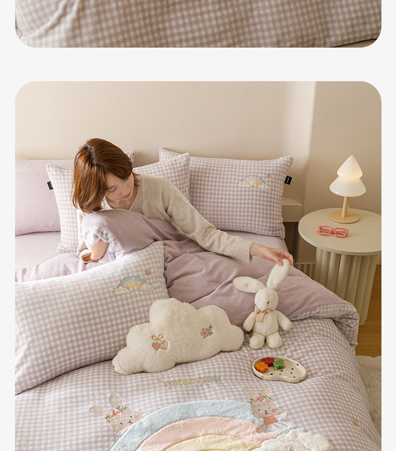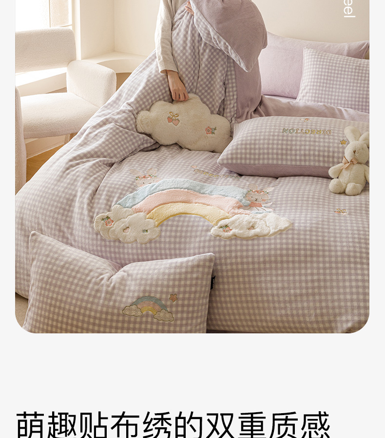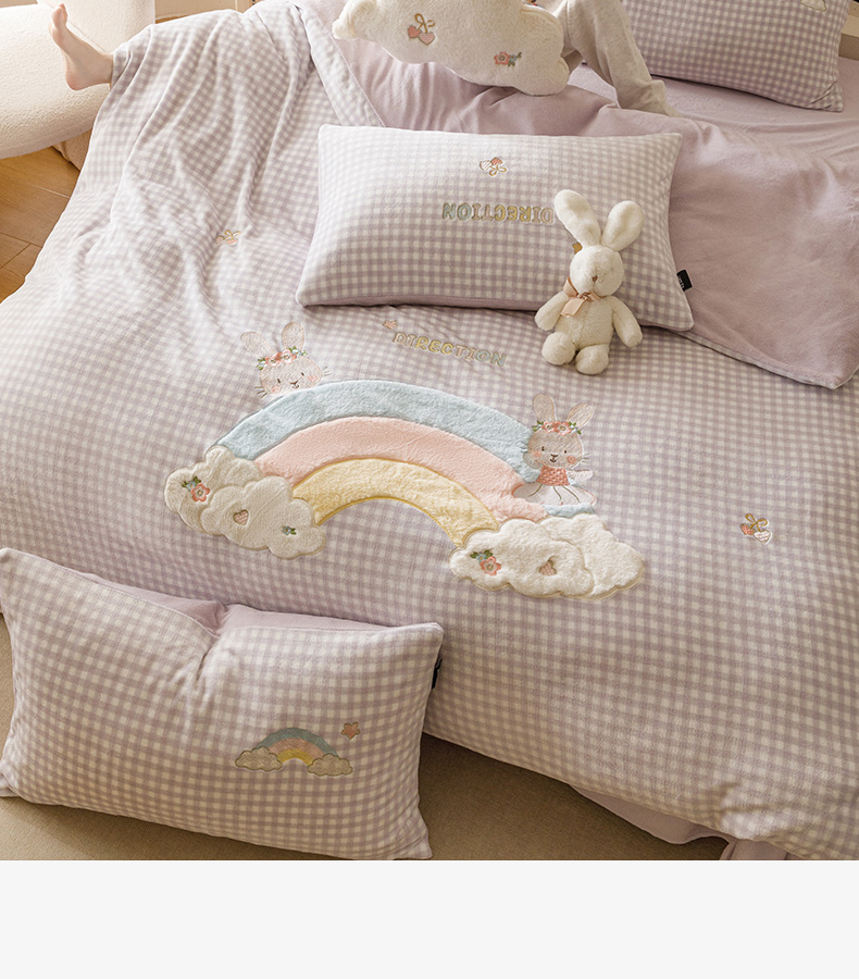 商品名称:卡姿家纺 2025秋冬德国奶芙绒萌趣贴布绣— 彩虹兔 彩虹兔-紫格
