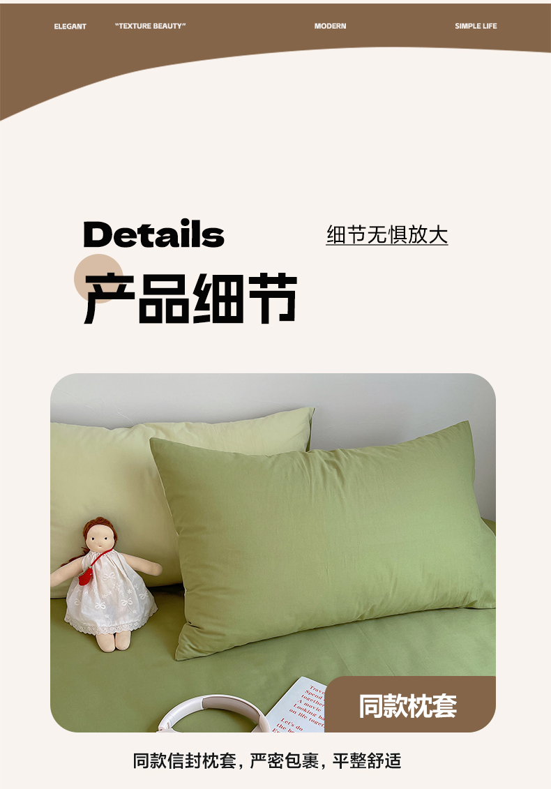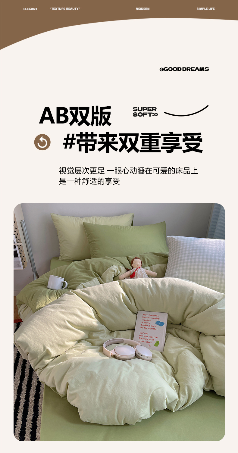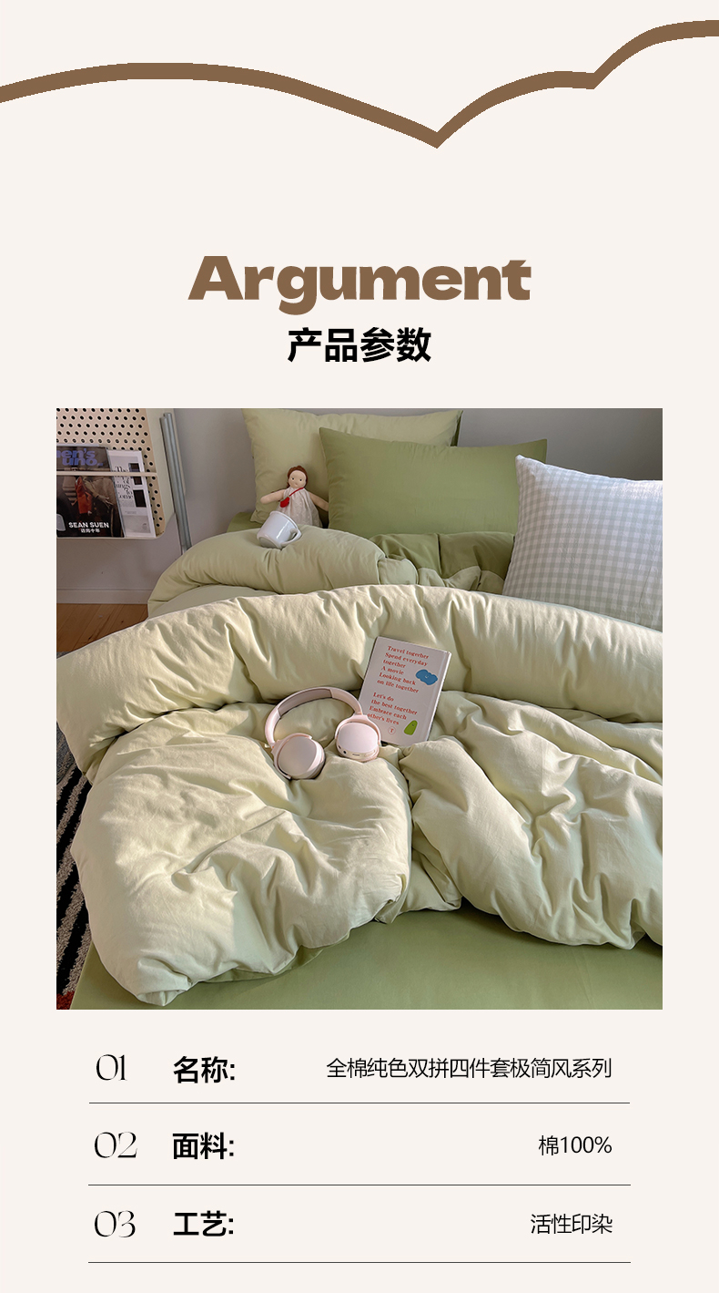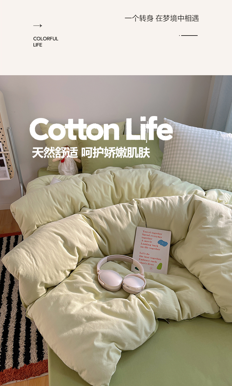 商品名称:三朵家纺 2026新款ins风全棉纯色双拼水洗棉四件套极简风系列 抹茶奶黄