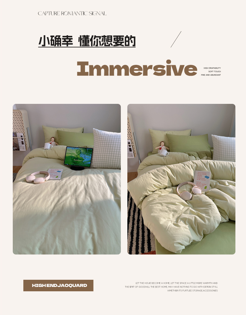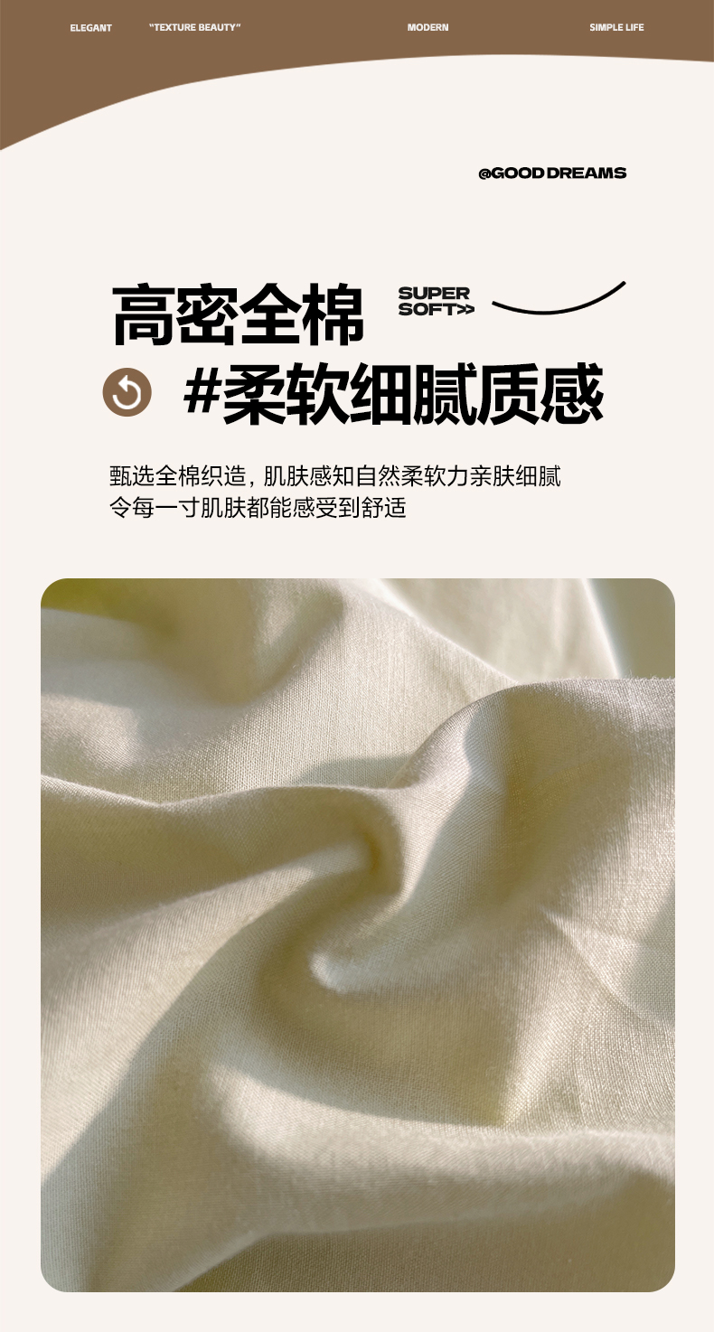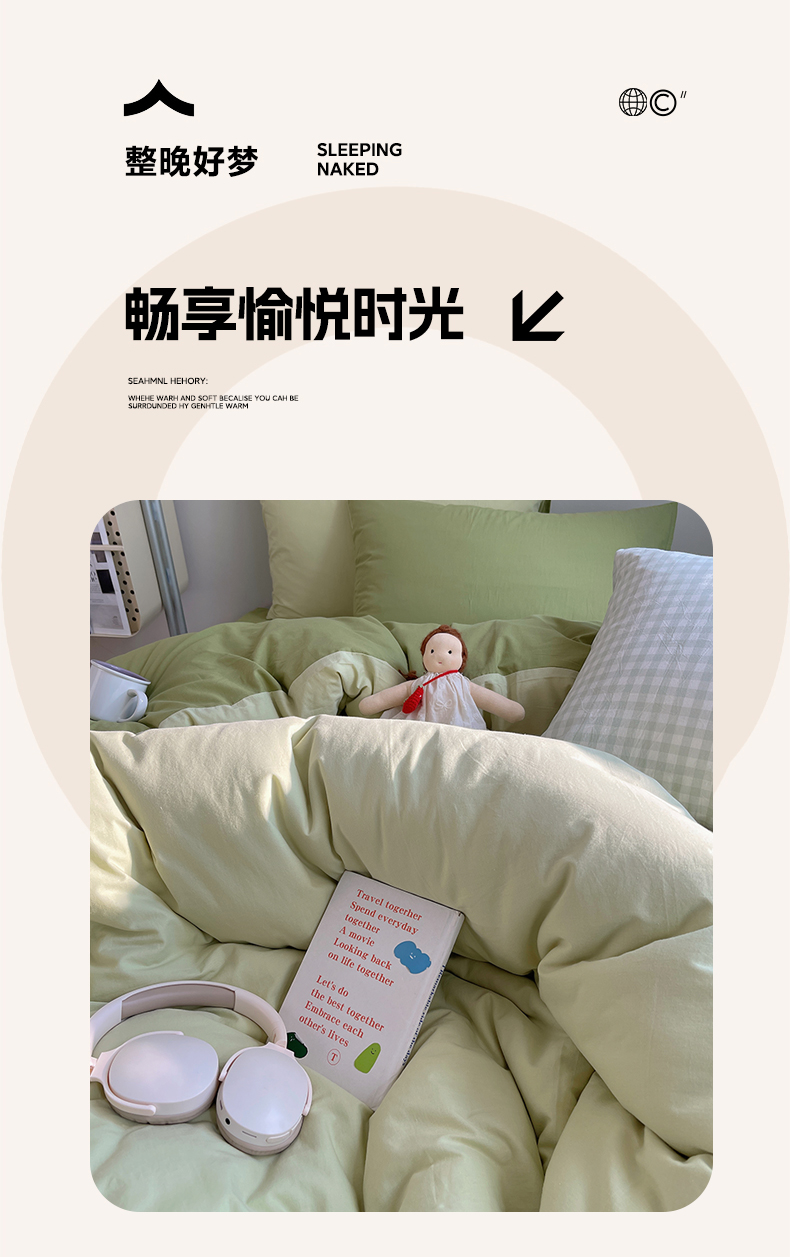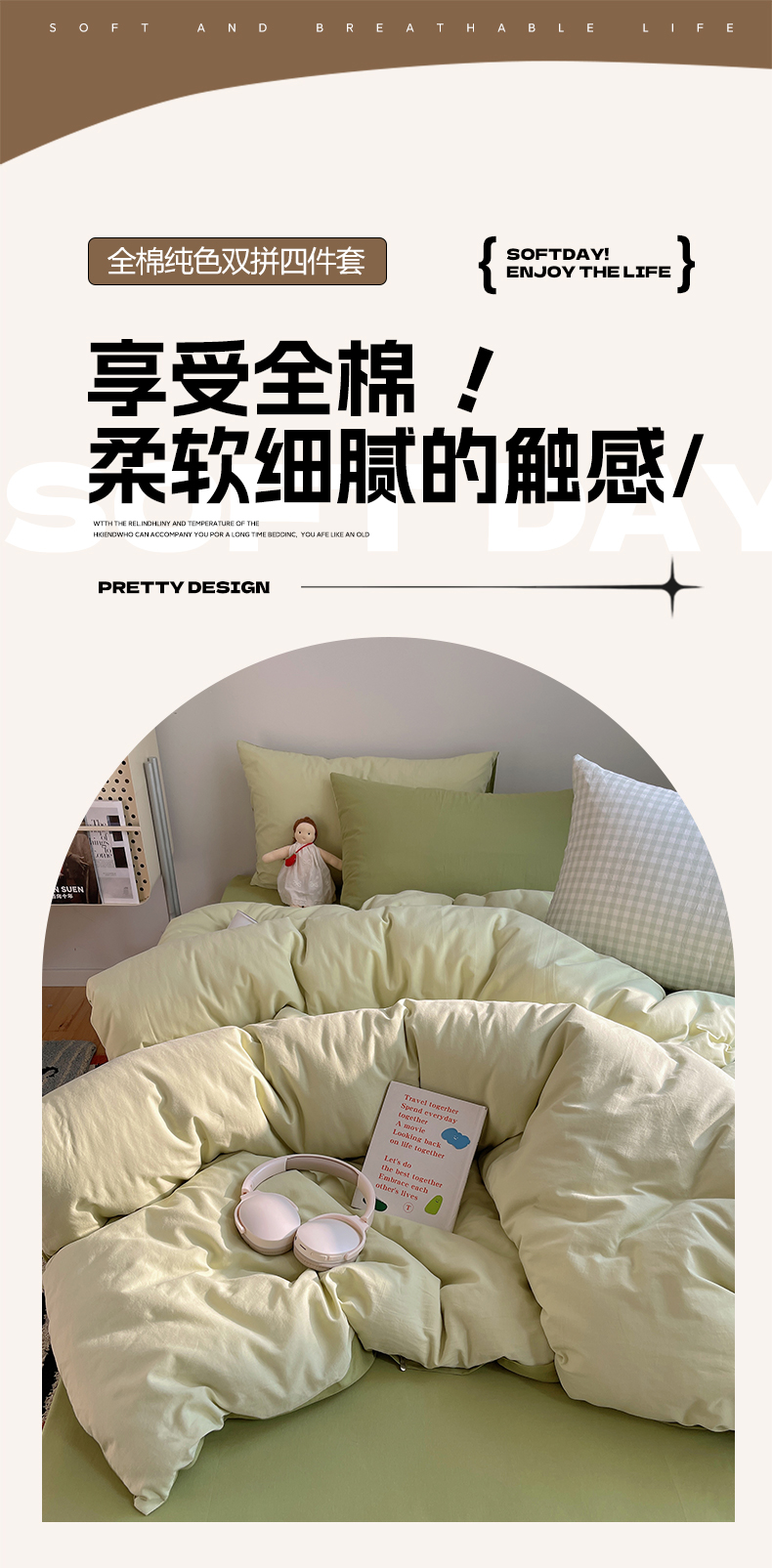 商品名称:三朵家纺 2026新款ins风全棉纯色双拼水洗棉四件套极简风系列 抹茶奶黄