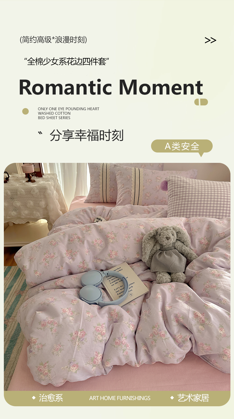 (总)三朵家纺 2026新款A类云柔水洗棉韩版法式花边云朵棉四件套,春夕集,罗逸维绿,如漫,惜花灰绿,赫拉