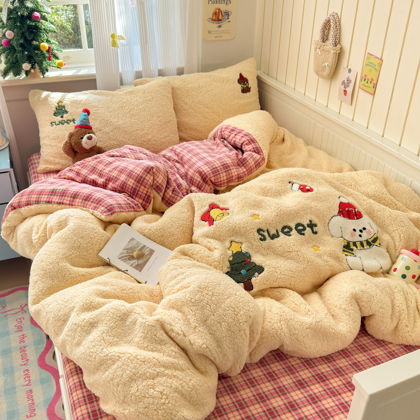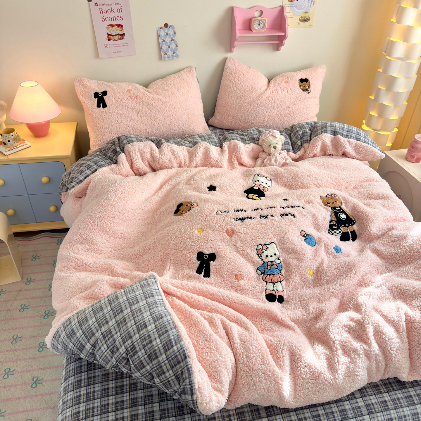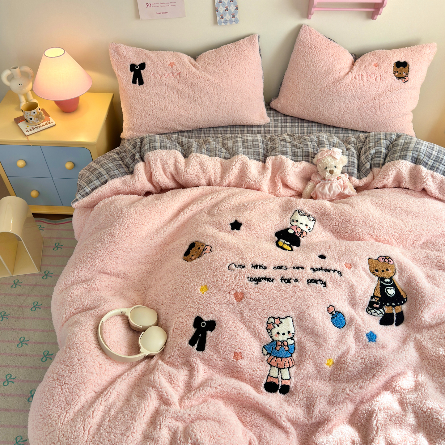 一霖家纺 2025新款高克重羊羔毛毛巾绣四件套 羊羔毛-苹果猫