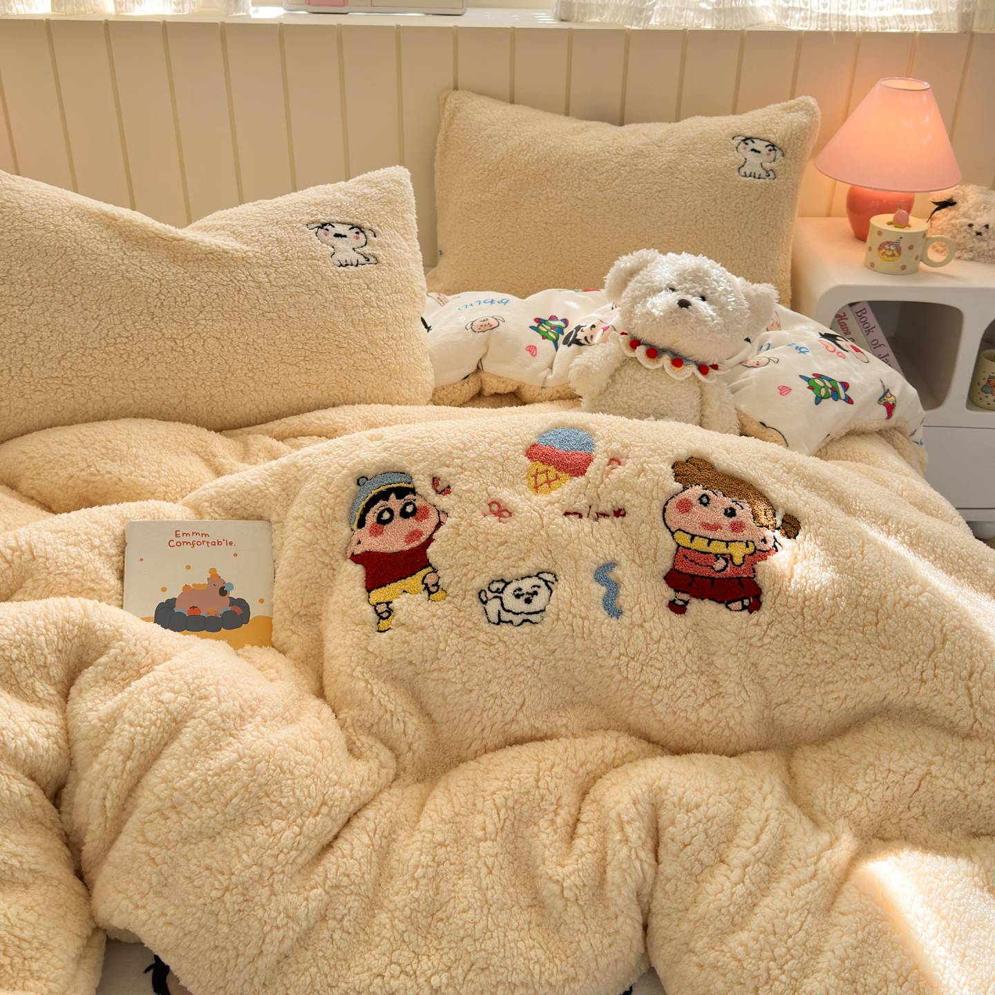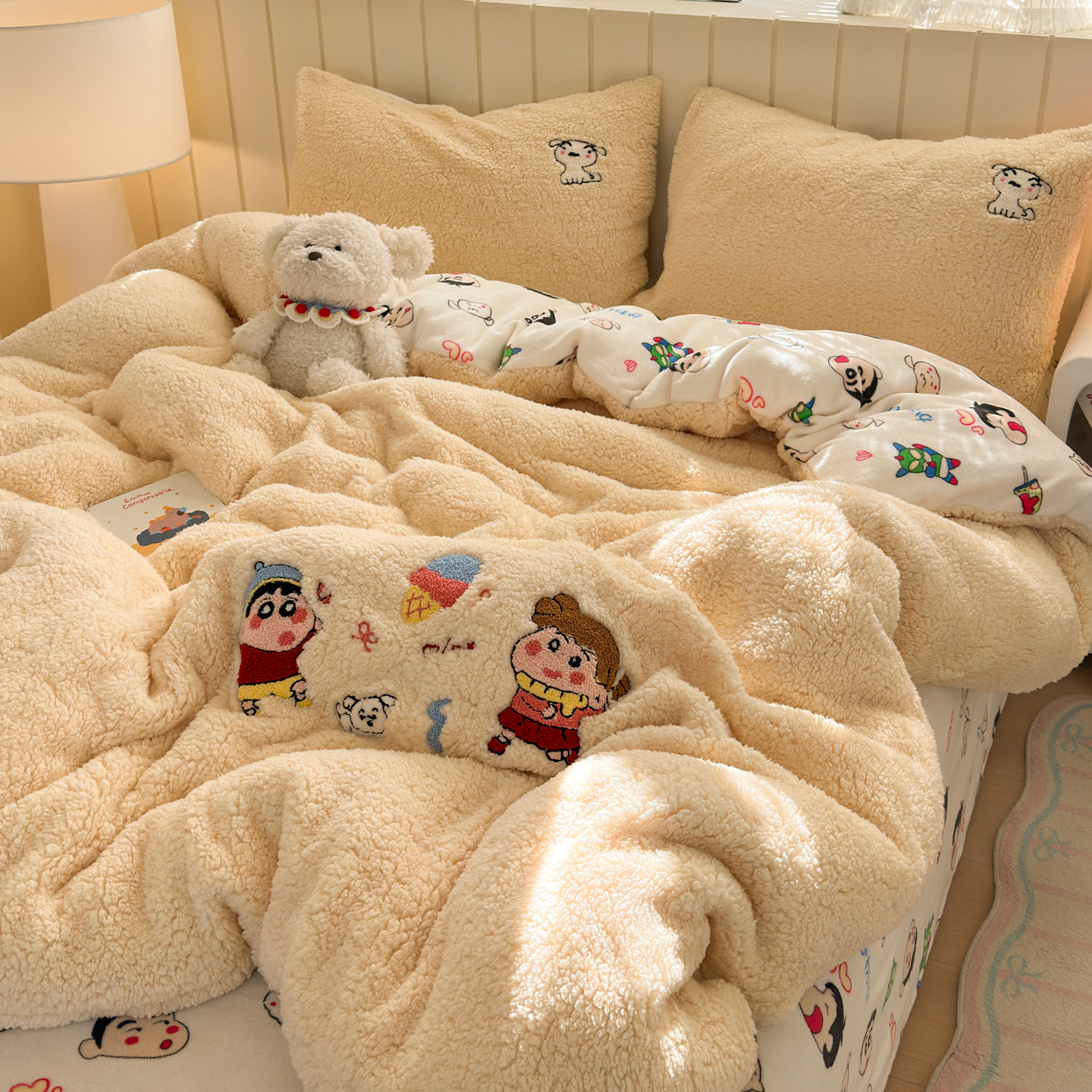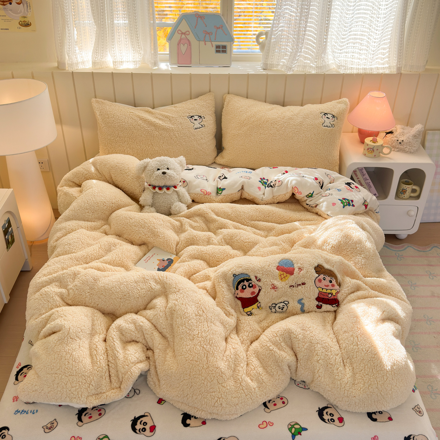 (总)一霖家纺 2025新款大版卡通牛奶绒四件套,搞怪新新紫,俏皮小新-黄,俏皮小新-蓝,甜心猫咪,星空小新