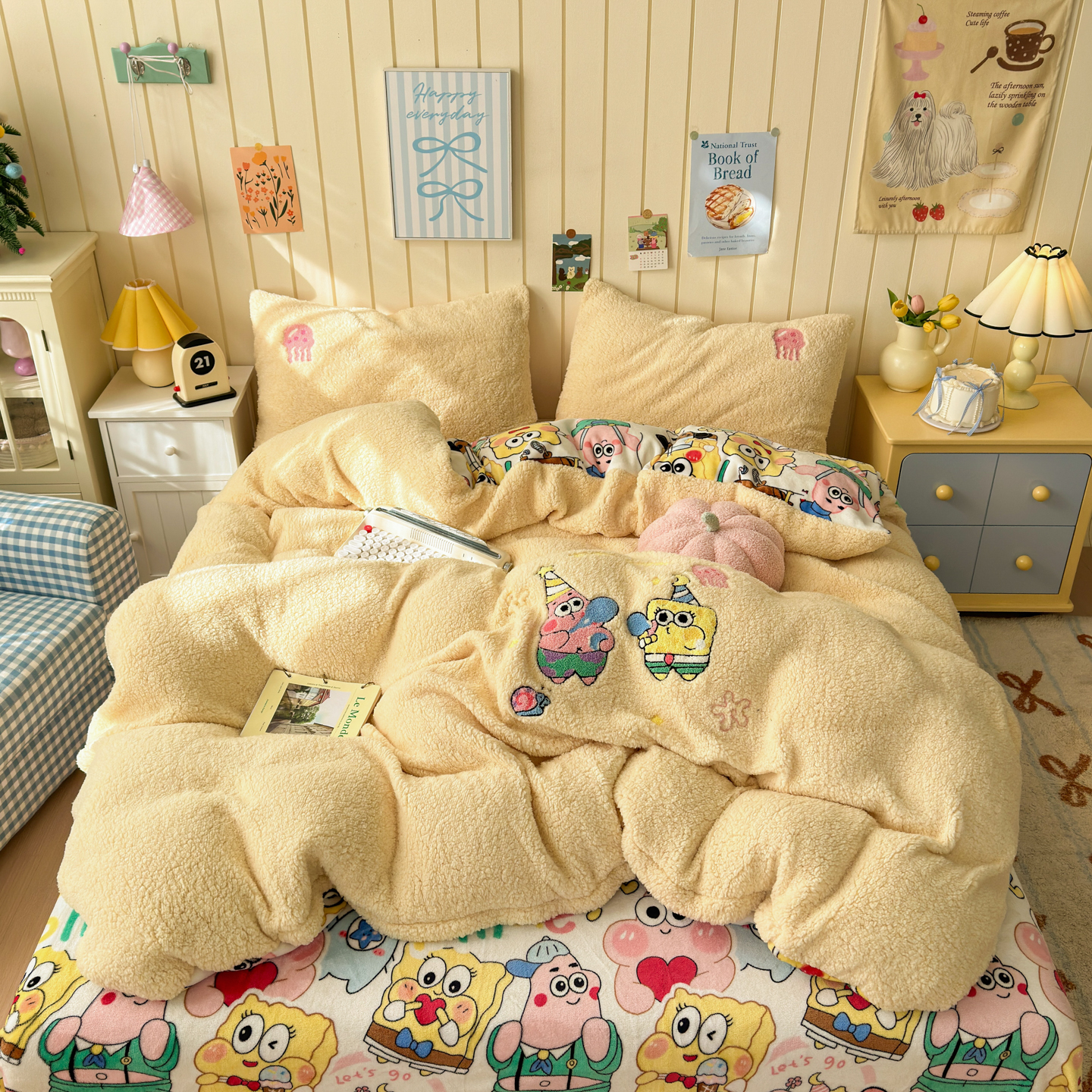 (总)一霖家纺 2025新款高克重羊羔毛毛巾绣四件套,新新与葵葵,圣诞小狗,吹泡泡的海宝黄,羊羔毛-黑皮KT,羊羔毛-苹果猫