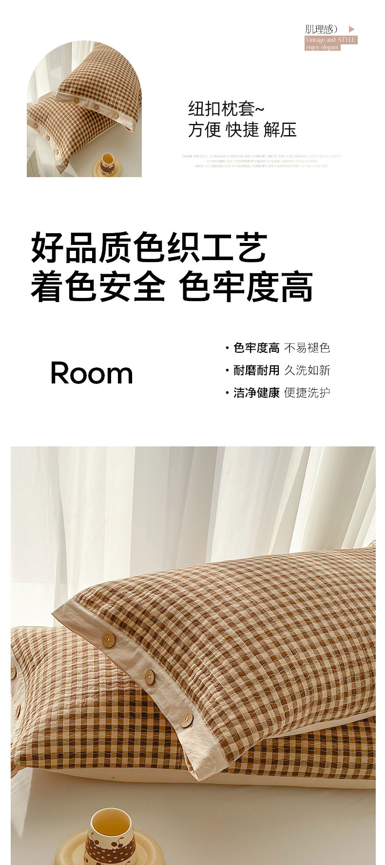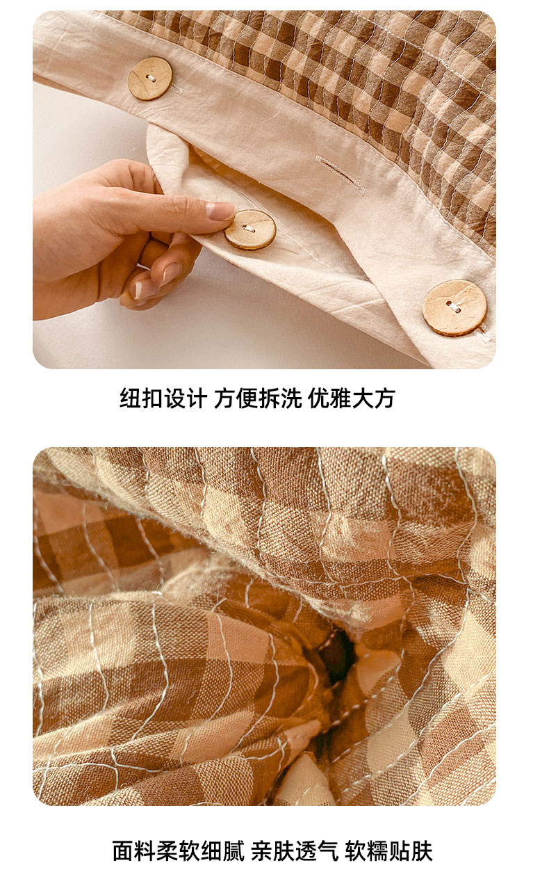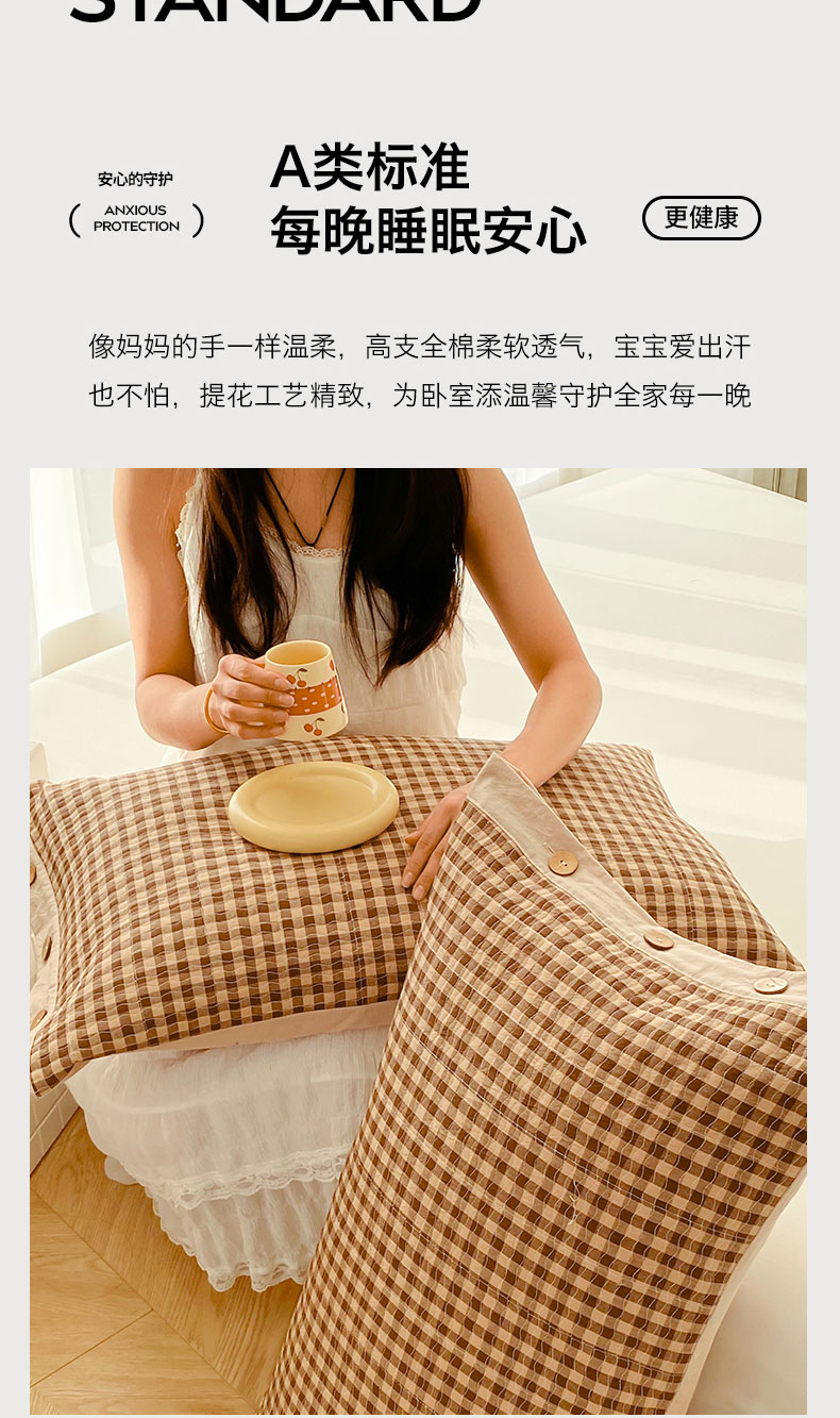 商品名称:美宜家 2026新款全棉水洗高密色织夹棉纺缝枕套高端全棉枕芯保护套 3.邂逅咖