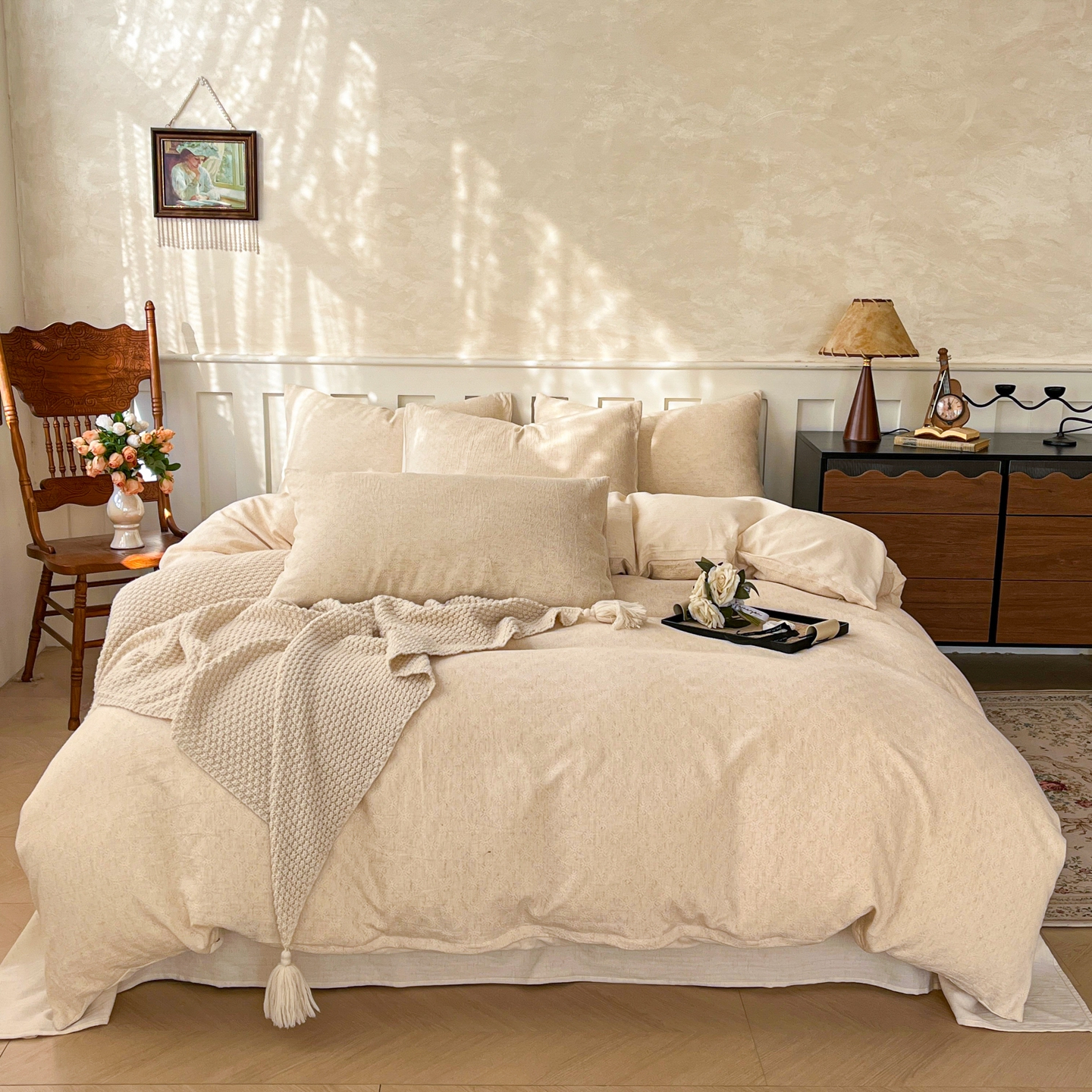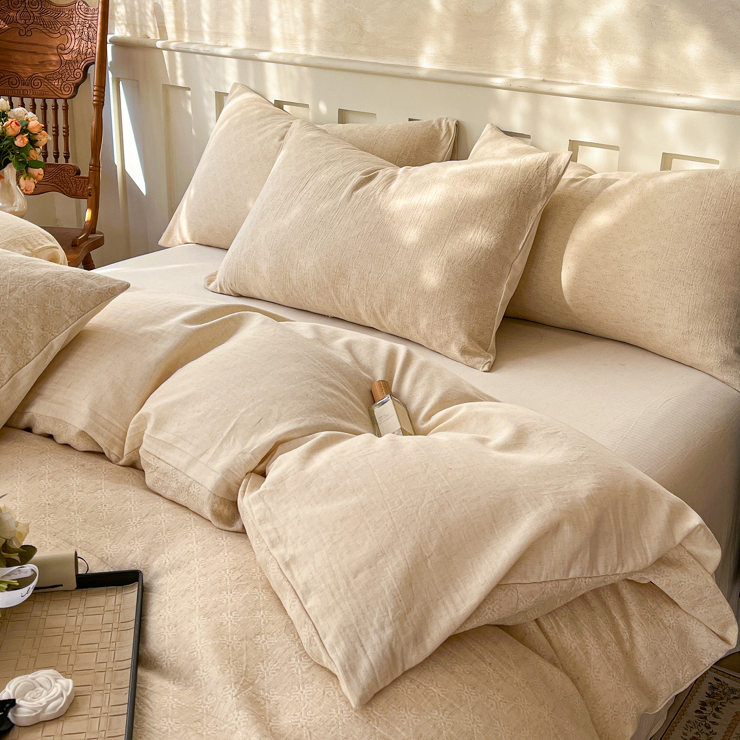 当前位置: 91家纺网 > 商品网购 > 床品套件 > 四件套 > 全棉普通四件套 > 金丝鸟家纺 2026春夏新款全棉纯棉棉麻提花四件套 花时代