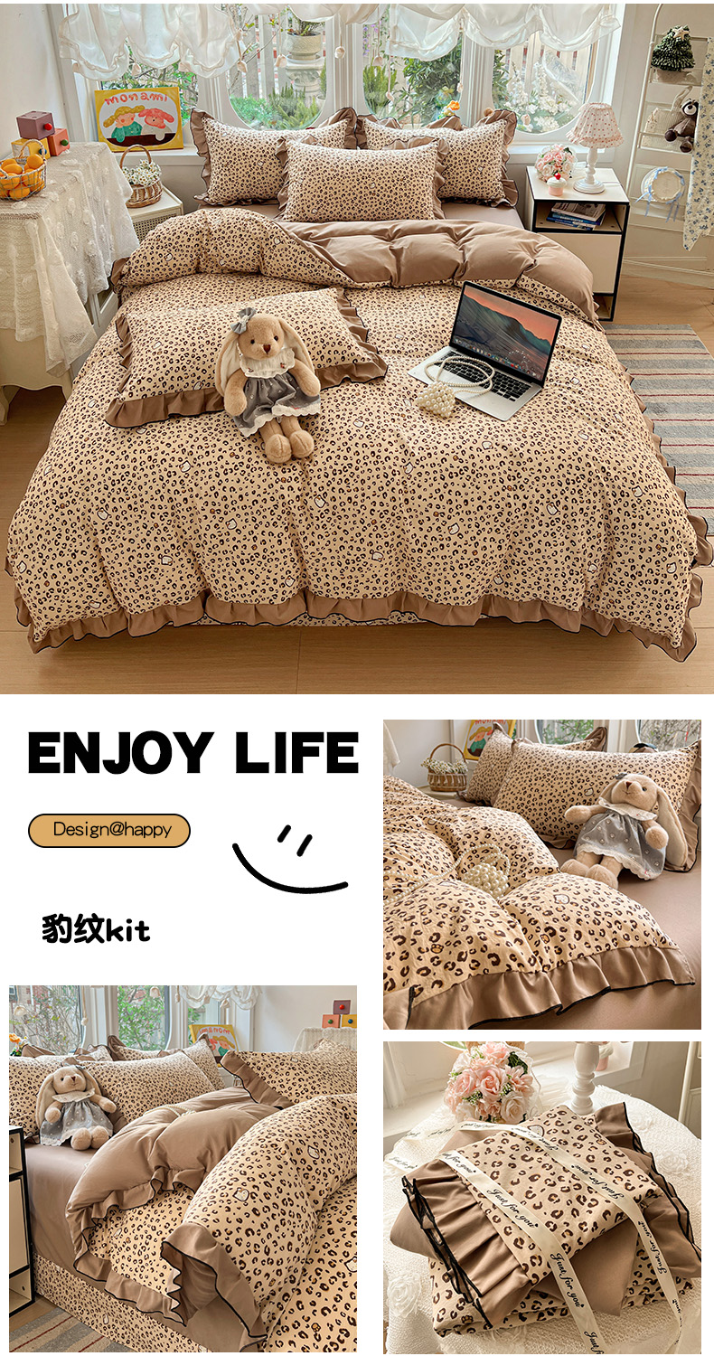 莱越家纺 2026新款A类仿棉四件套古法水洗棉法式工艺花边四件套 豹纹kit