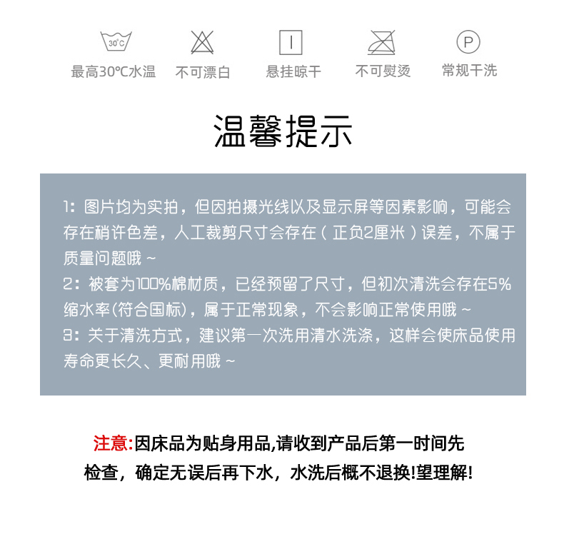 3、通州区市场监督局友情提醒,近期涉及到床上用品不褪色不掉毛不缩水的投诉和以世界知名品牌图案为面料的床品举报较多。请各商家自检自查,对照整改或进行下架处理。