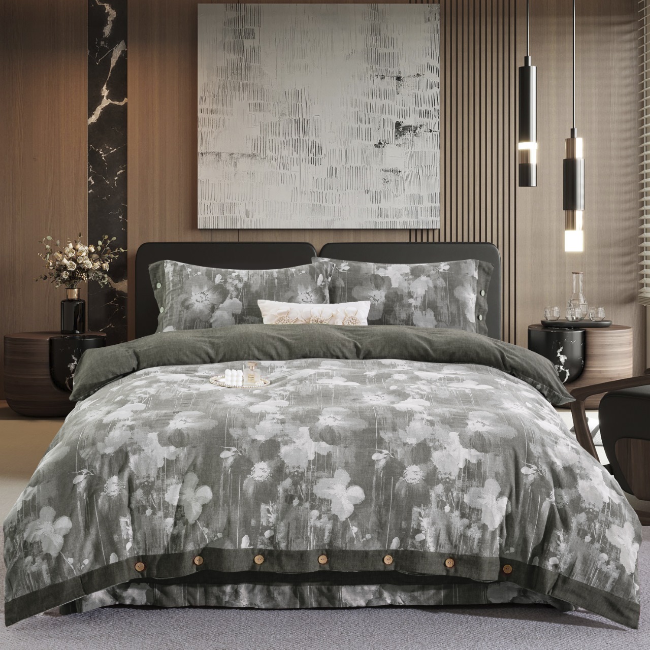 (总)仰望棉麻双层纱供应链 2026新款全棉色织提花纽扣款四件套-花都,花都-豆沙,花都-灰,花都-咖,花都-绿