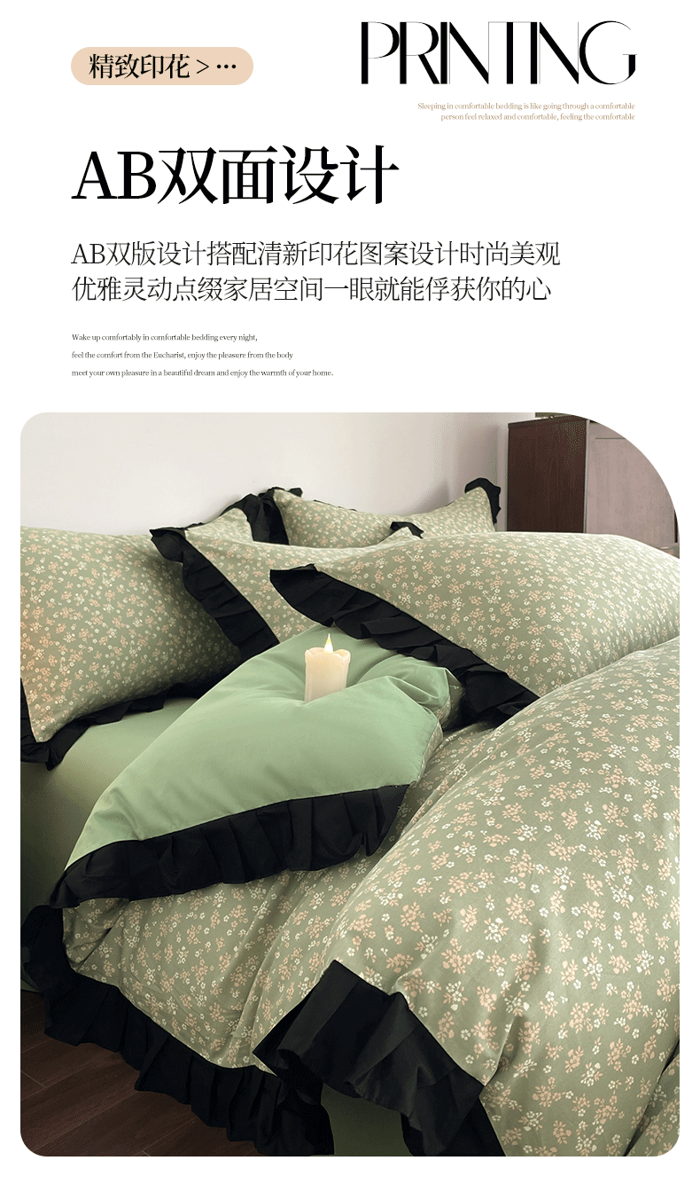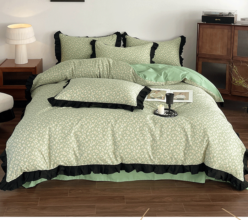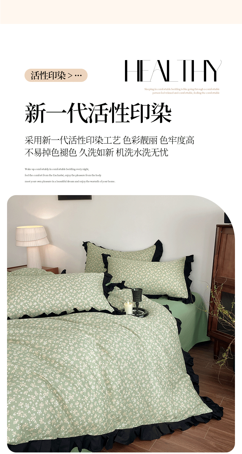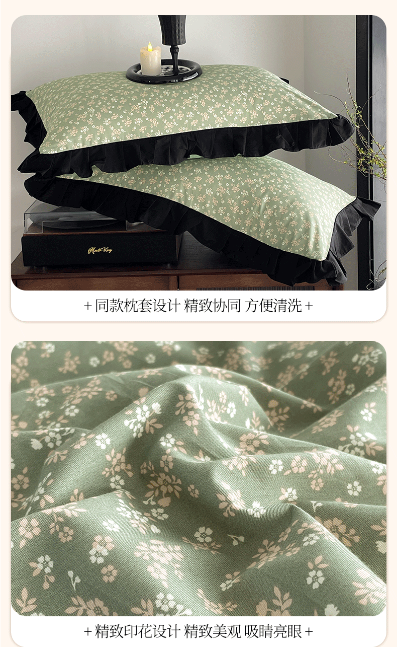 商品名称:羚羊语家纺 2026新款全棉法式赫本风花边四件套40支纯棉轻法式13372小清新喷气印花四件套被套床单床笠三件套 青禾枕梦
