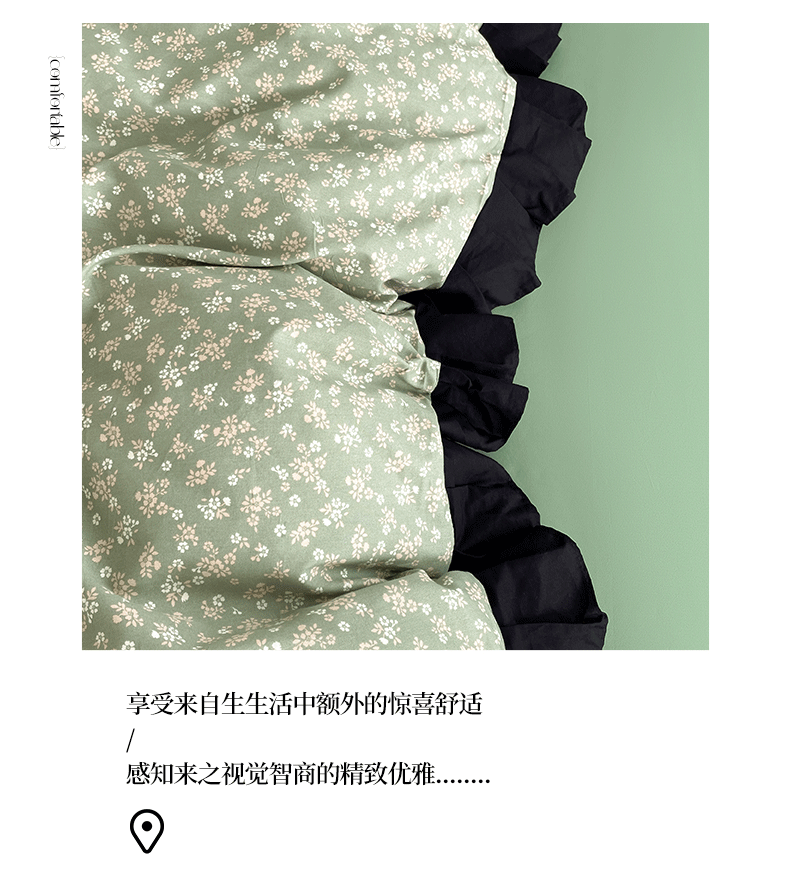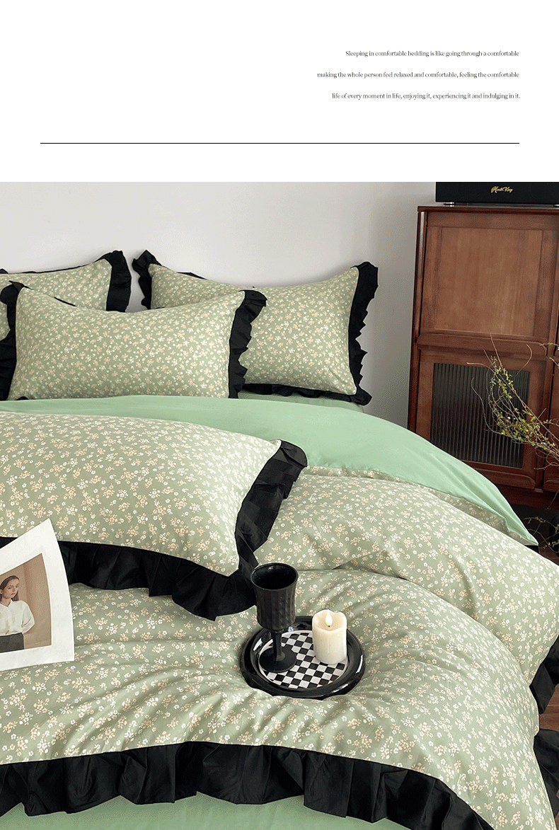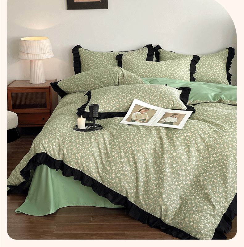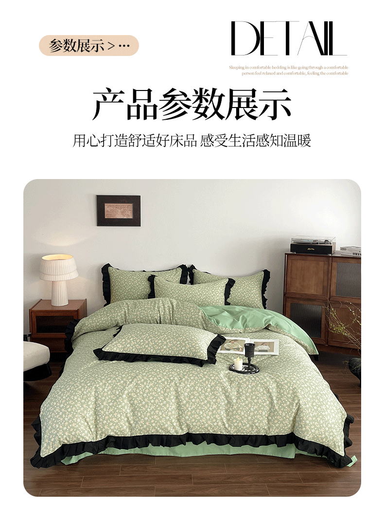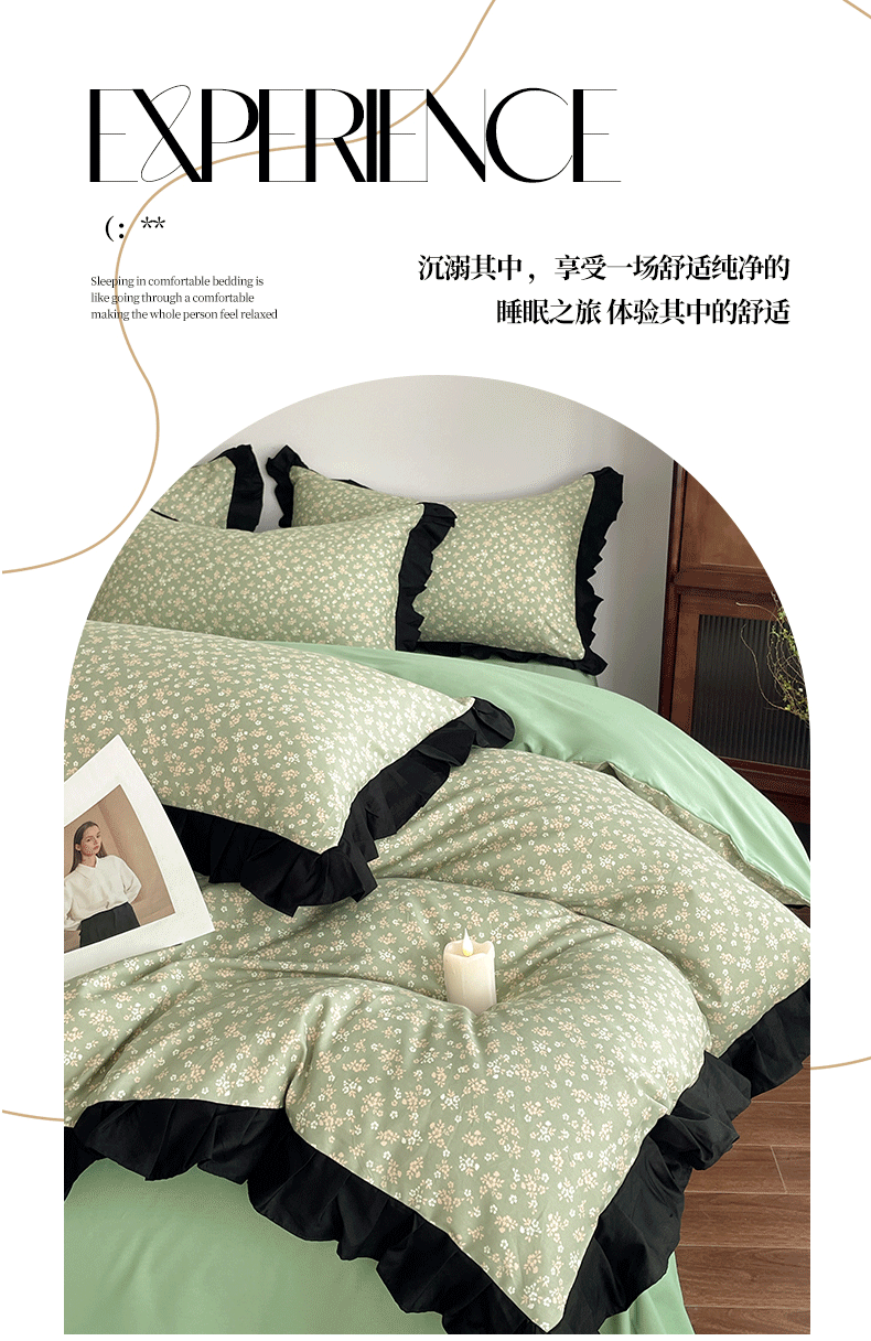 商品名称:羚羊语家纺 2026新款全棉法式赫本风花边四件套40支纯棉轻法式13372小清新喷气印花四件套被套床单床笠三件套 青禾枕梦
