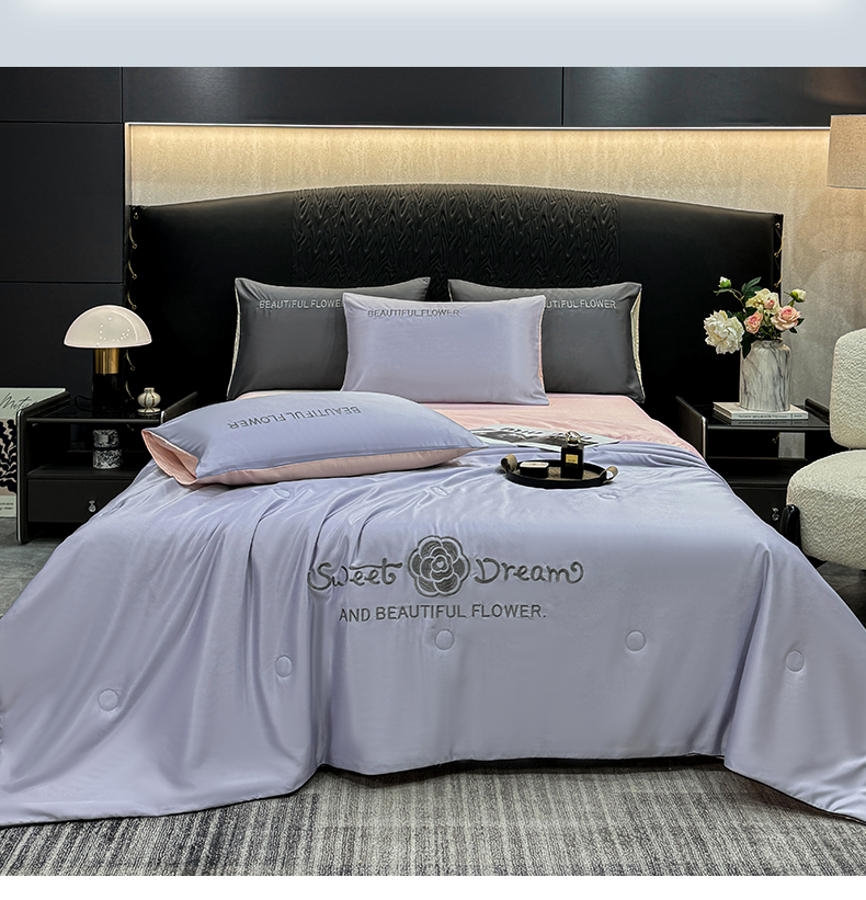 • 91家纺网 家纺一手货源 找家纺 欢乐季 2026新款A类水洗冰丝山茶花刺绣夏被夏凉被空调被四件套 香芋紫+樱花粉