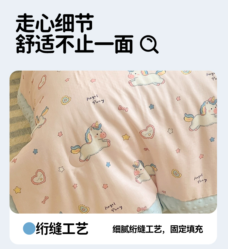 当前位置: 91家纺网 > 商品网购 > 被子 > 夏被 > 盛秋家纺 2026新款A类水洗棉豆豆夏被系列二 独角兽粉+天空蓝