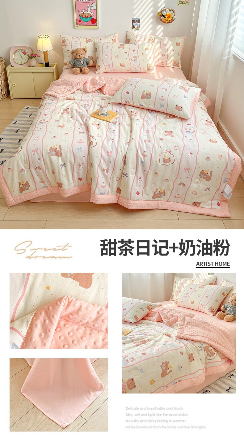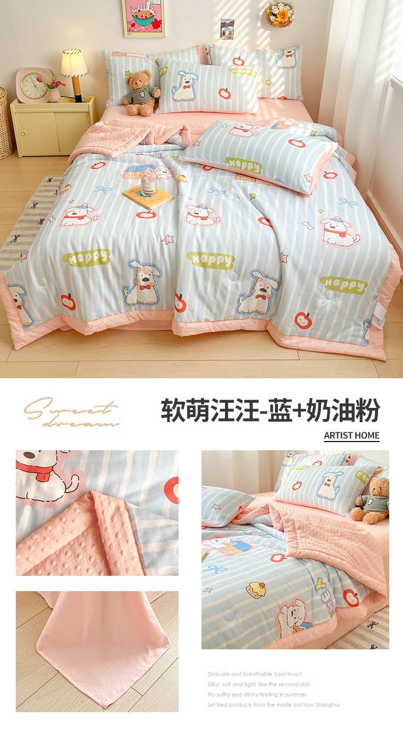 (总)盛秋家纺 2026新款皱皱纱印花夏被-萝拉,生日派对+清新绿,格子花园+奶油粉,格子铺粉+天空蓝,花丛小熊+奶油粉,可可颂蓝+天空蓝,恐龙游记+天空蓝,快乐时光+深咖,麻薯团+米驼,派对狗+深咖,森林小象+奶油粉,小狗来信+奶油粉,小伙伴+米驼,小熊小花+麦绿,修勾咖+米驼