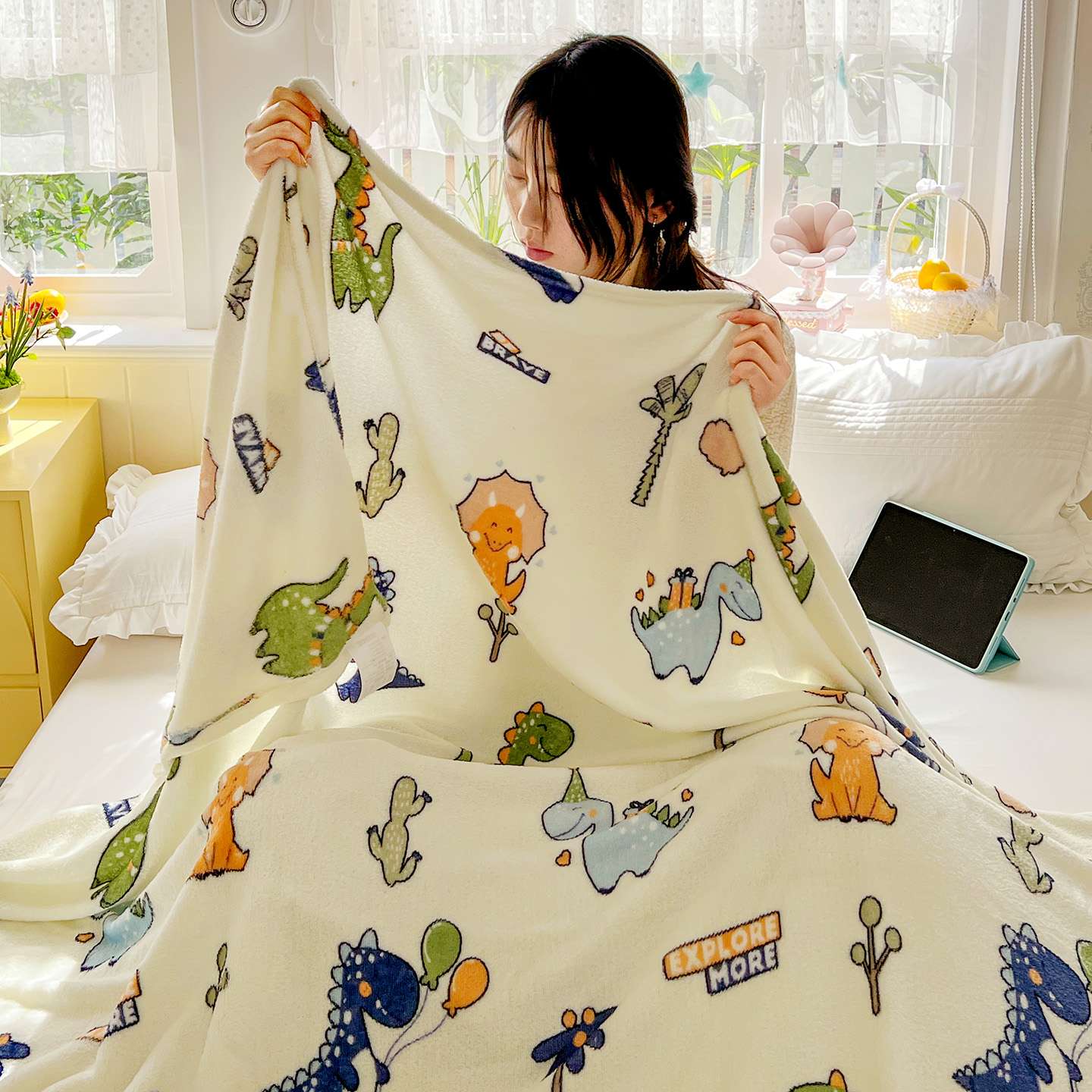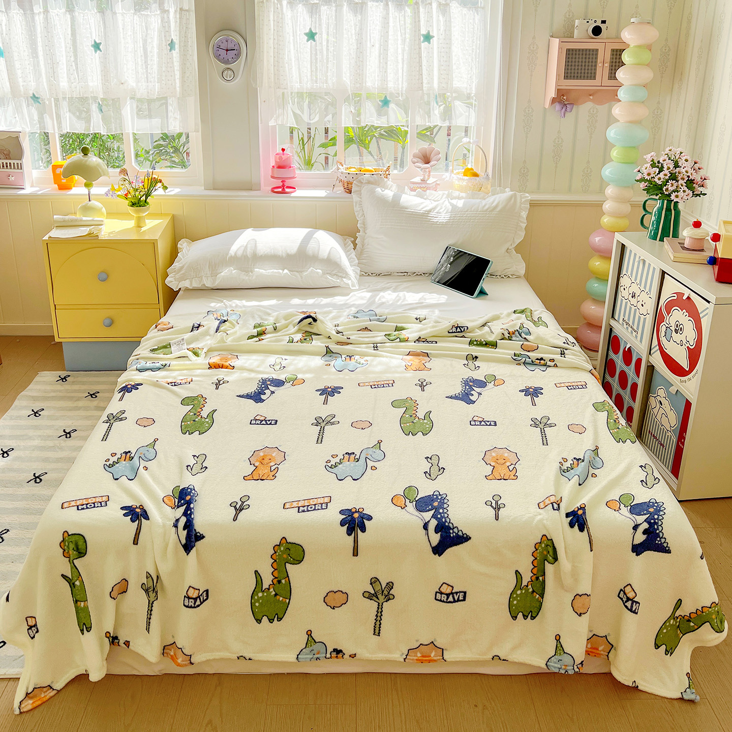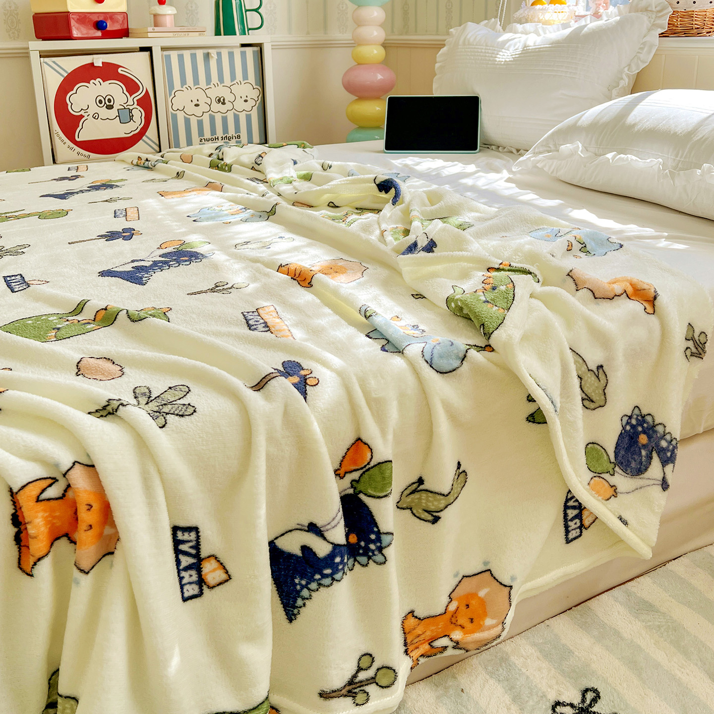 悦织湾家纺 2026新款印花法兰绒毛毯牛奶绒盖毯春秋空调毯儿童床单小被子 恐龙宝贝