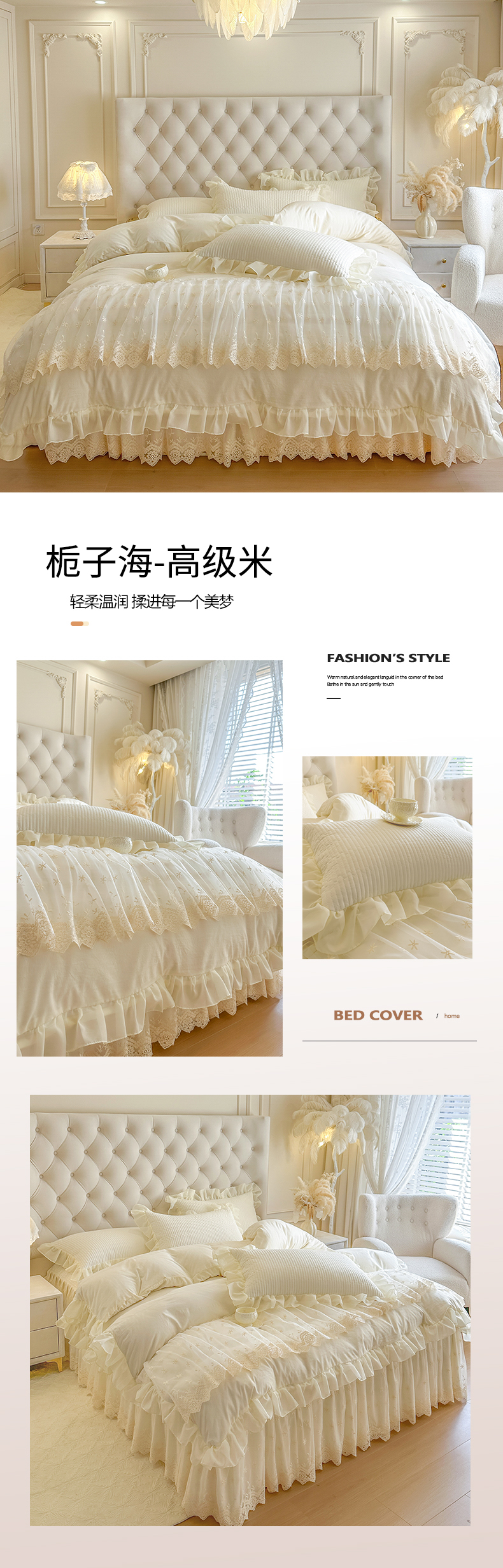 商品名称:瑞宝 2026新款泡芙棉花边床裙四件套-栀子海 栀子海-玉色