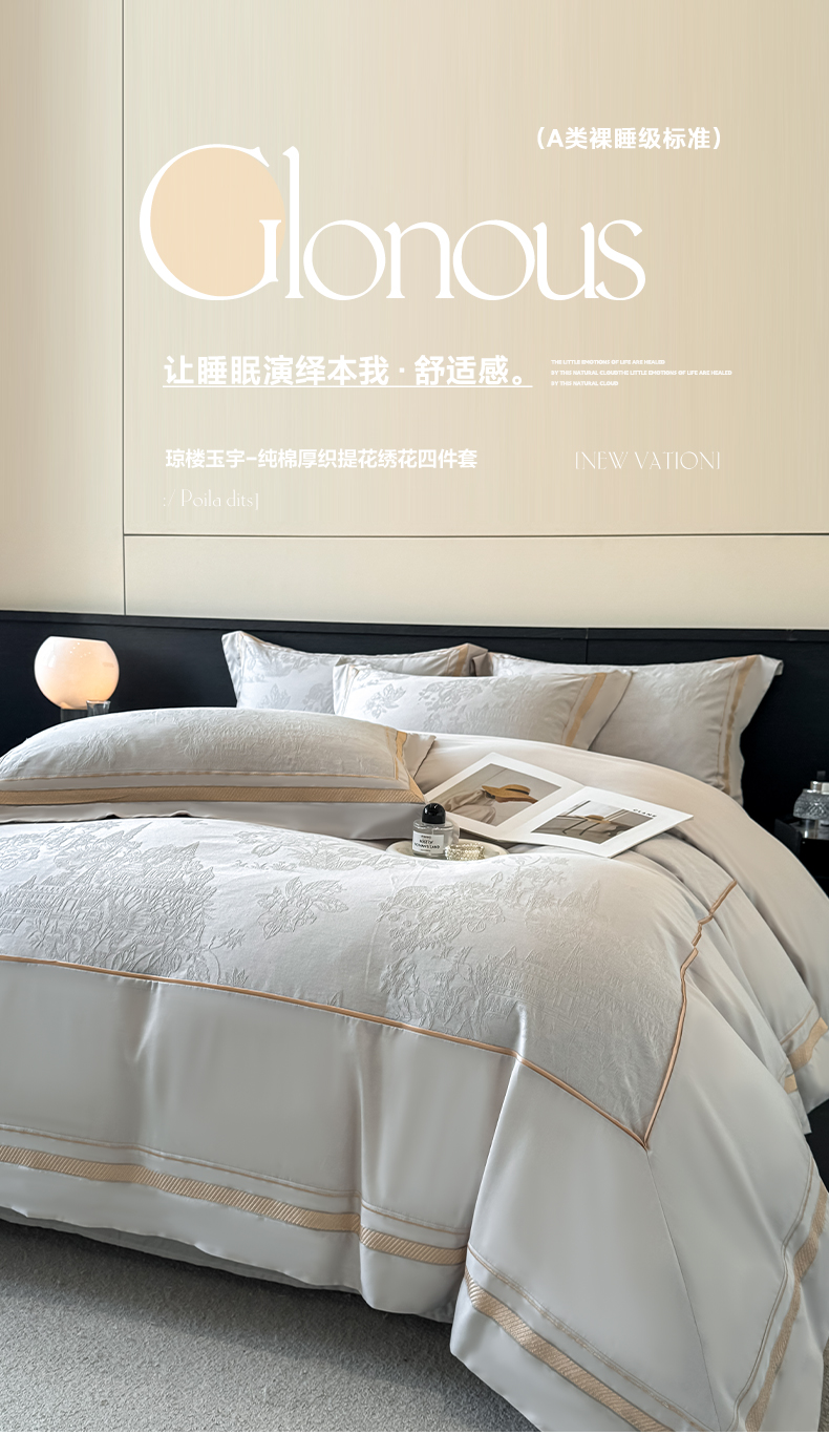 当前位置: 91家纺网 > 商品网购 > 床品套件 > 四件套 > 全棉普通四件套 > 博纳家纺 2026春夏新款60支全棉纯棉厚织提花绣花宽边高级简奢纯棉四件套-琼楼玉宇 琼楼玉宇-炫彩银