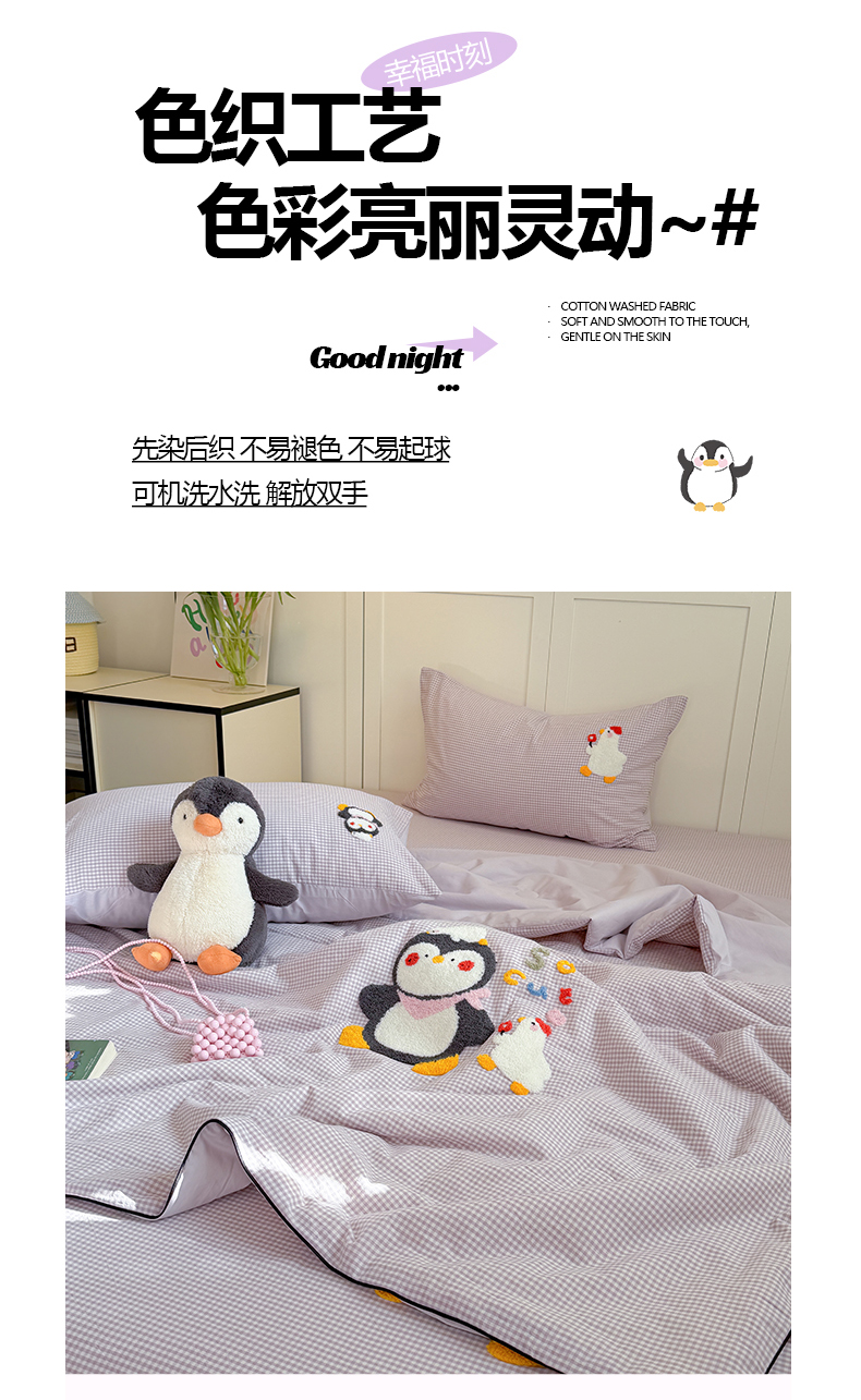 • 91家纺网 家纺一手货源 找家纺 (总)暖生活 2026新款全棉纯棉色织水洗棉毛巾绣床笠三件套,组合图仅做展示不可下单,KT日记,蓝鲸梦,墨镜小狗,下雨天,小企鹅,阅读星人