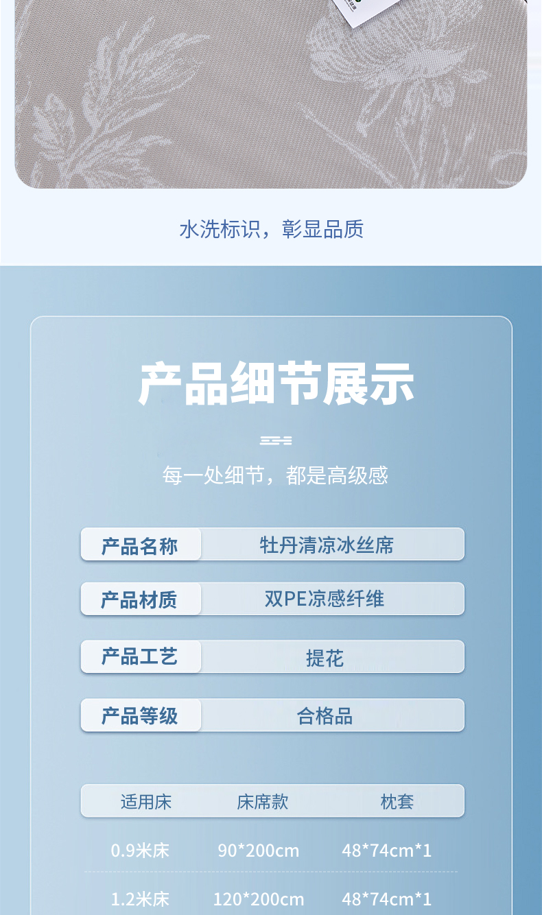 商品名称:小牛席业 2026新款牡丹清凉大提花冰丝席凉席席子 灰色