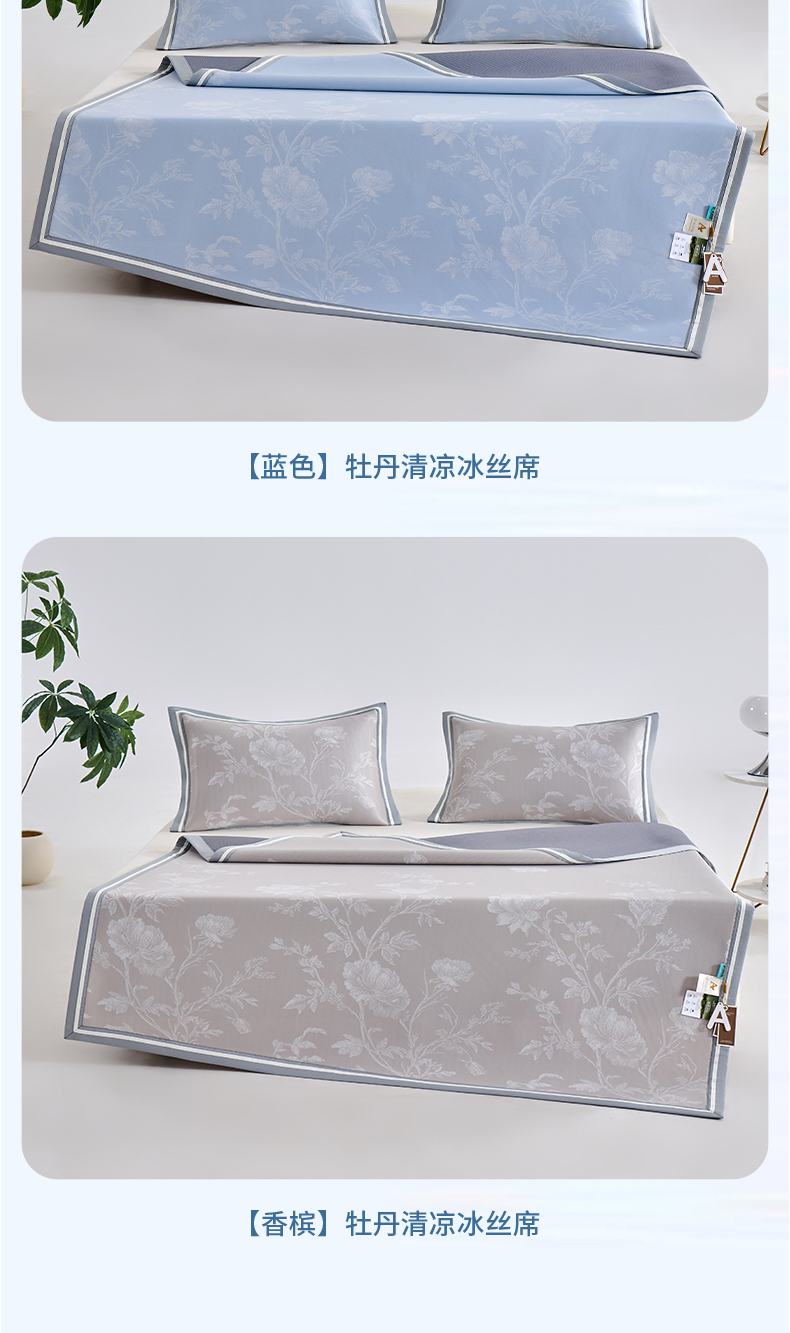 (总)小牛席业 2026新款牡丹清凉大提花冰丝席凉席席子,粉色,灰色,蓝色,香槟