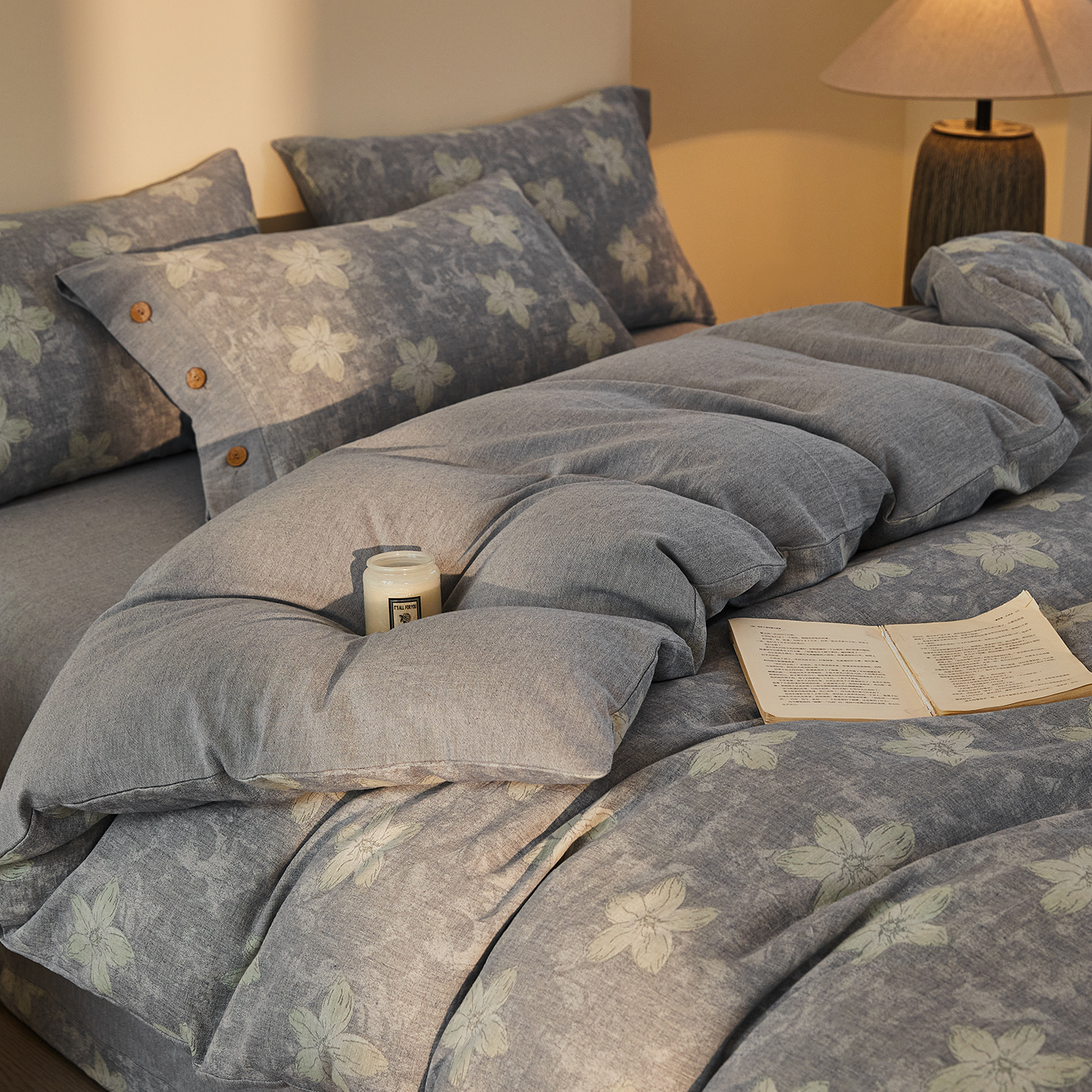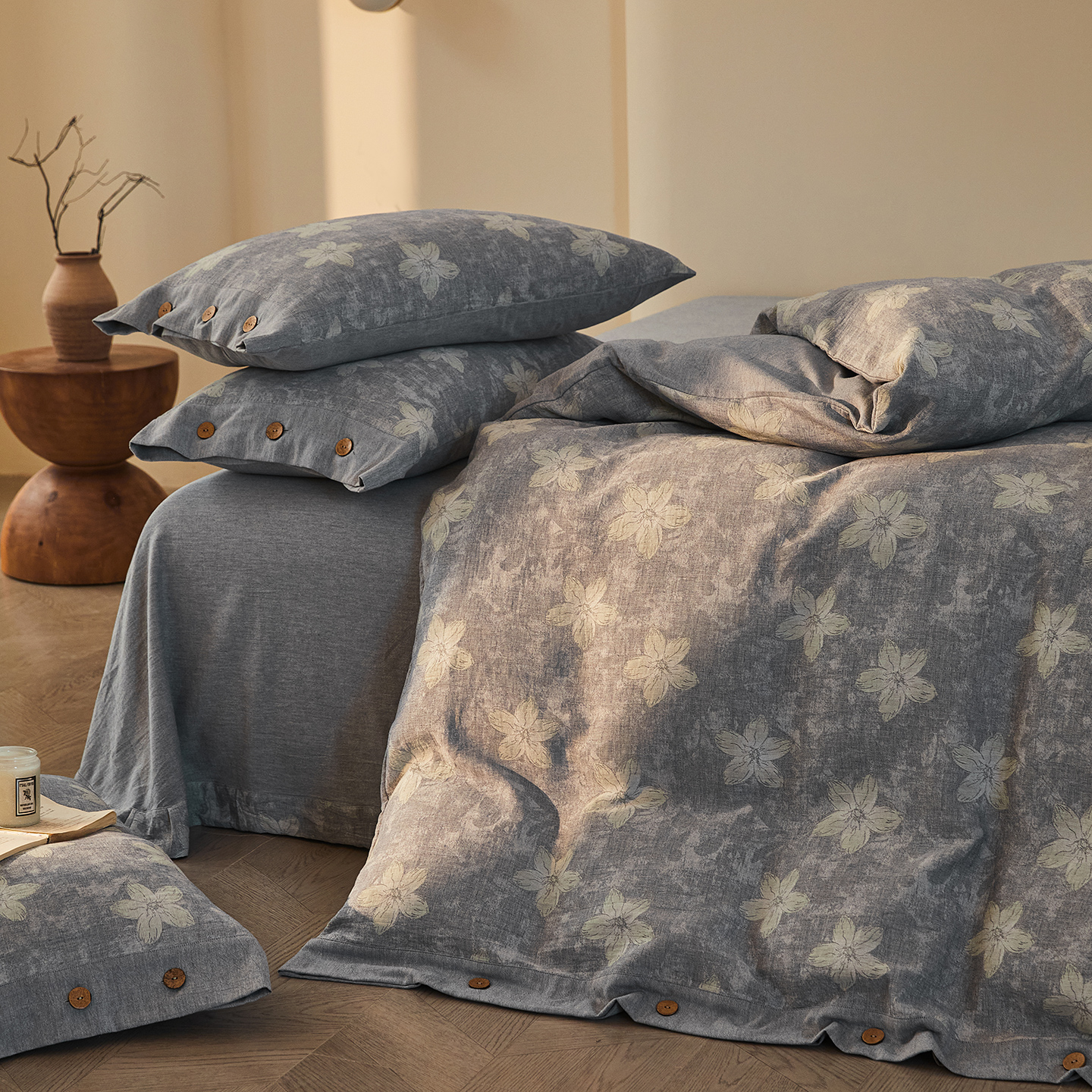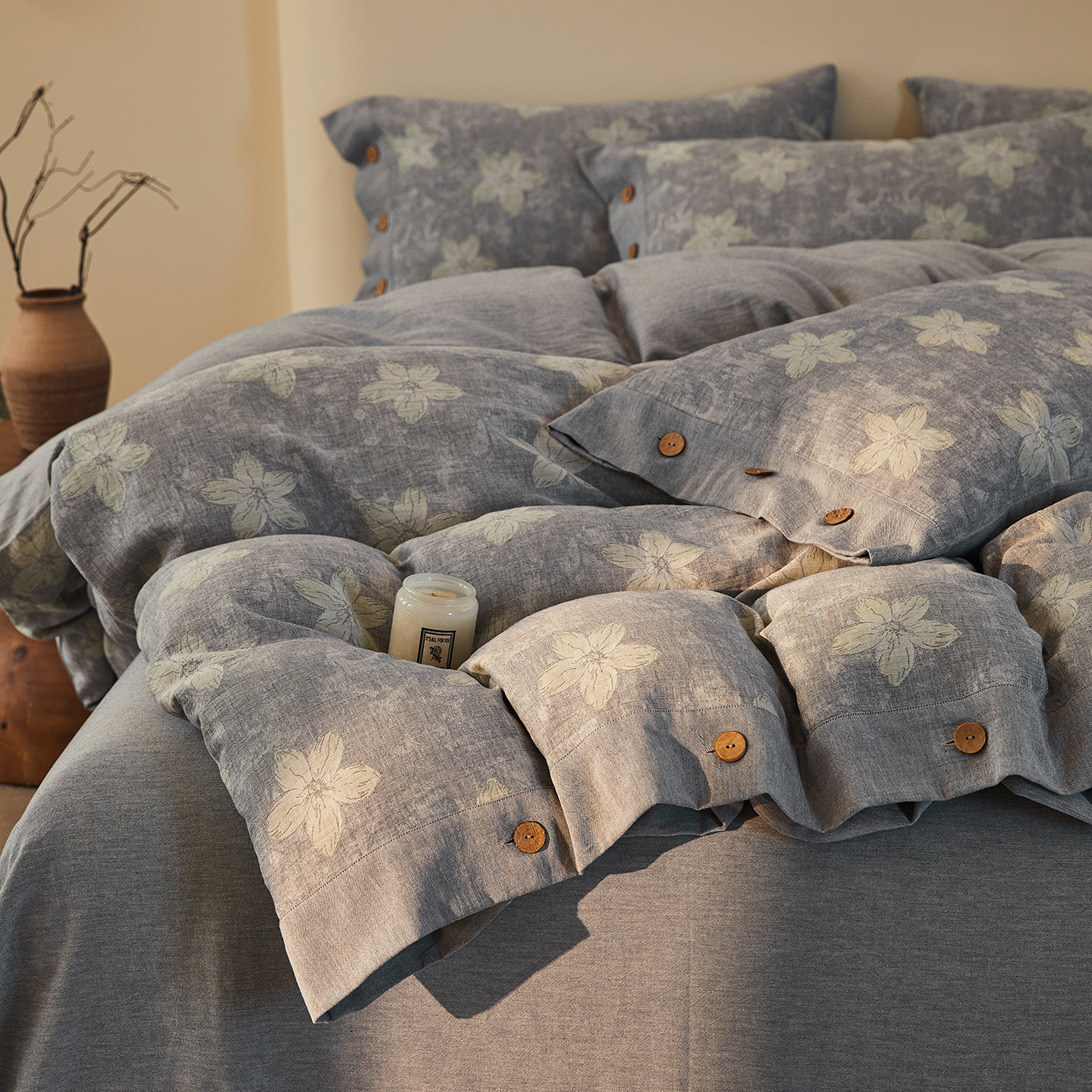 商品名称:仰望棉麻双层纱供应链 2026新款艺语一花三色全棉色织提花双层纱纽扣款四件套 艺语-浅灰