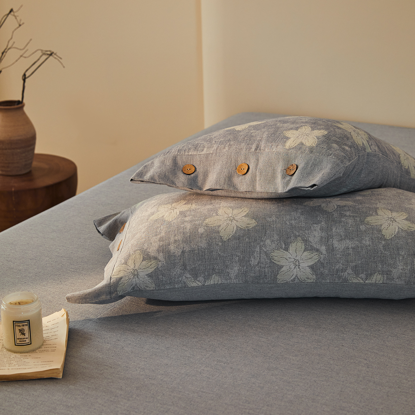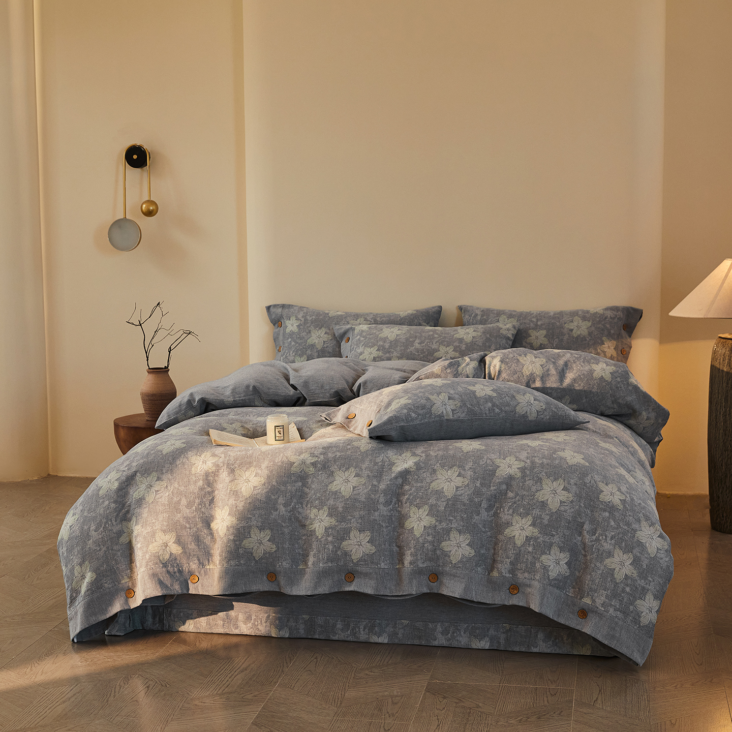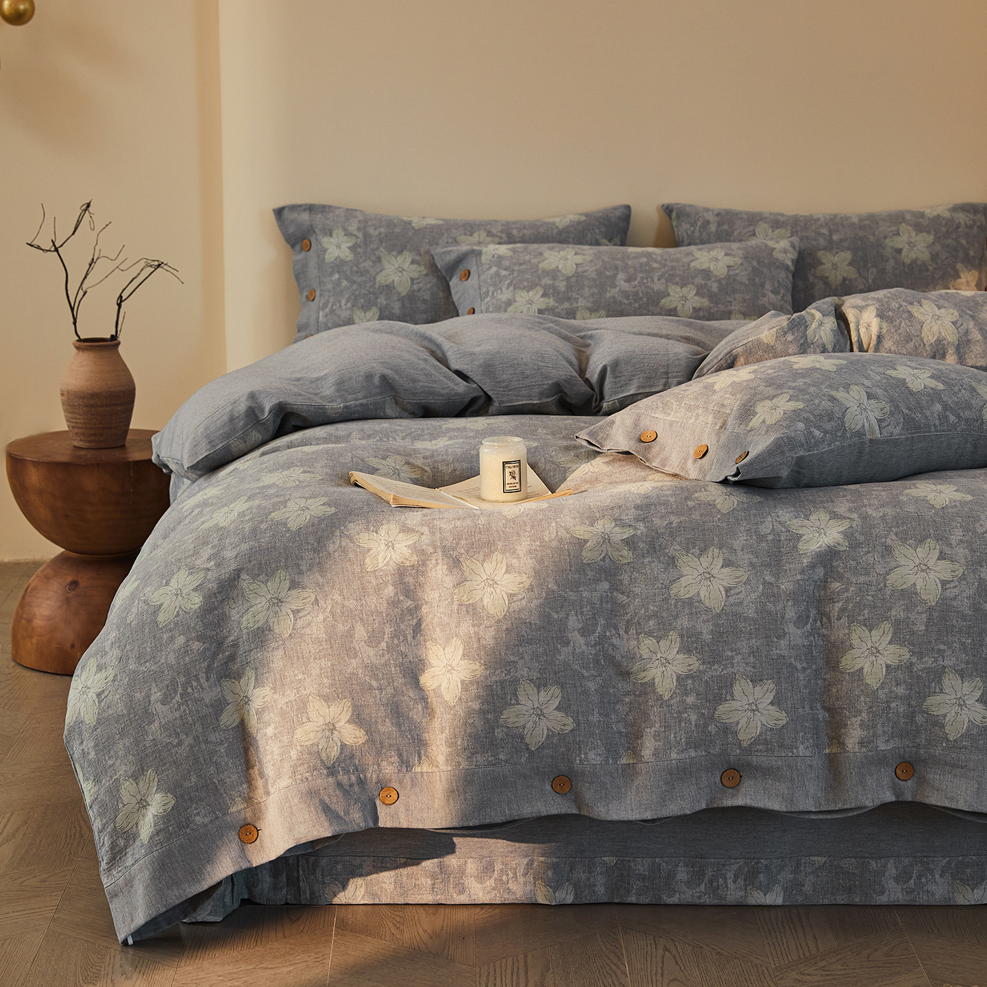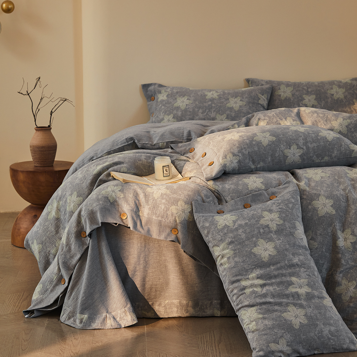 商品名称:仰望棉麻双层纱供应链 2026新款艺语一花三色全棉色织提花双层纱纽扣款四件套 艺语-浅灰