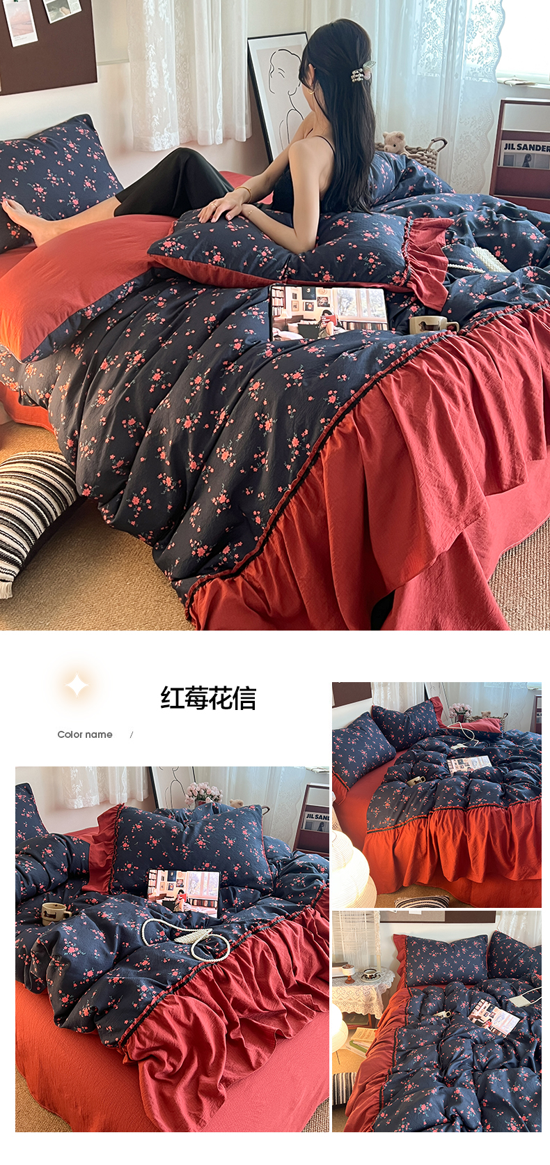 (总)晨曦家纺 2026新款韩系法式慵懒氛围感印花泡芙花边四件套,红莓花信,布朗花影,可可花舞,森系精灵,雾灰庄园