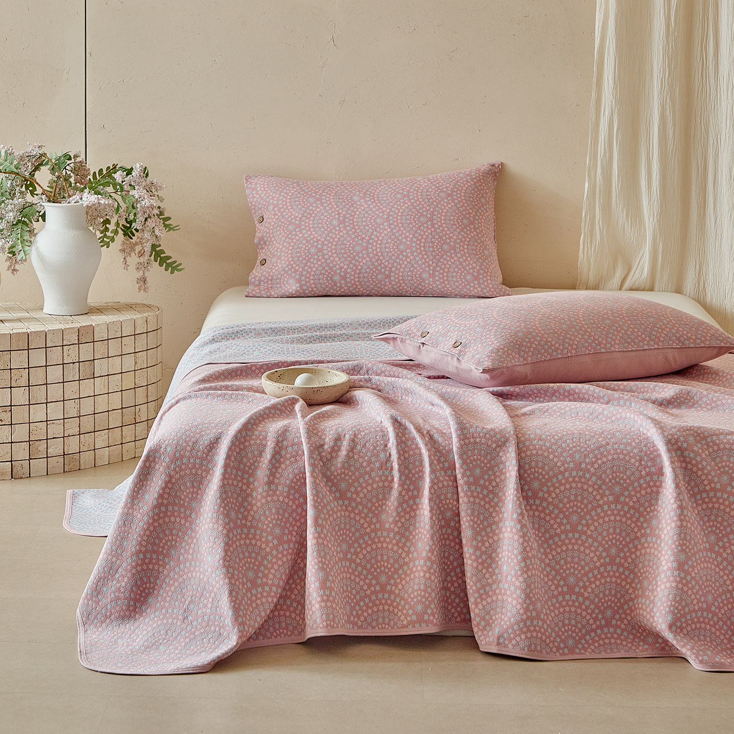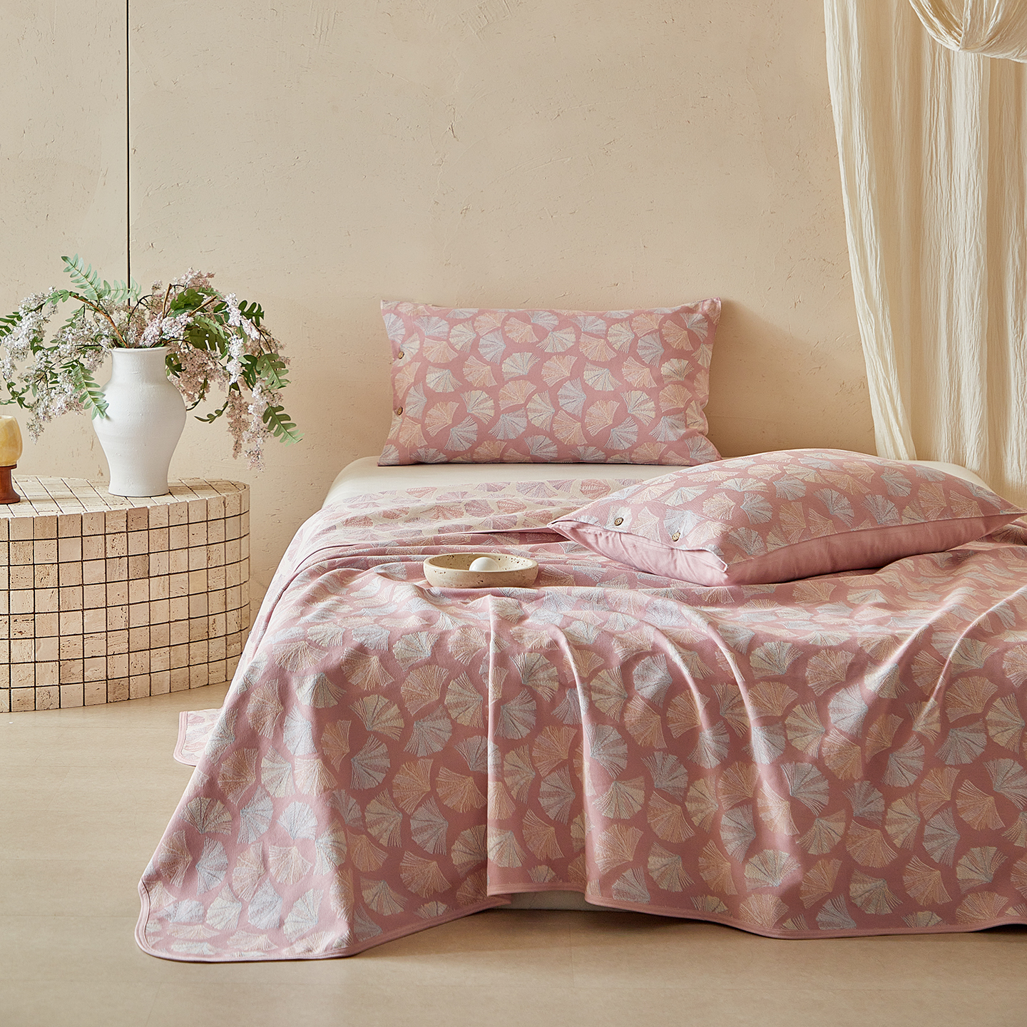 商品名称:孑寐家纺 2026新款100%纯棉色织双面大提花老粗布凉席三件套 金栗叶影-浅粉