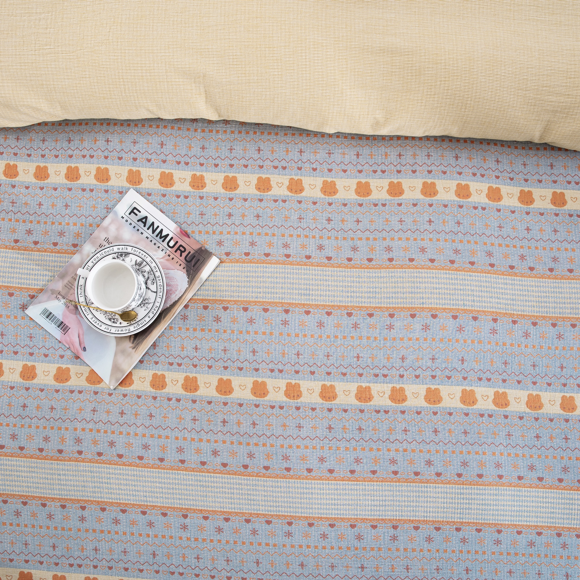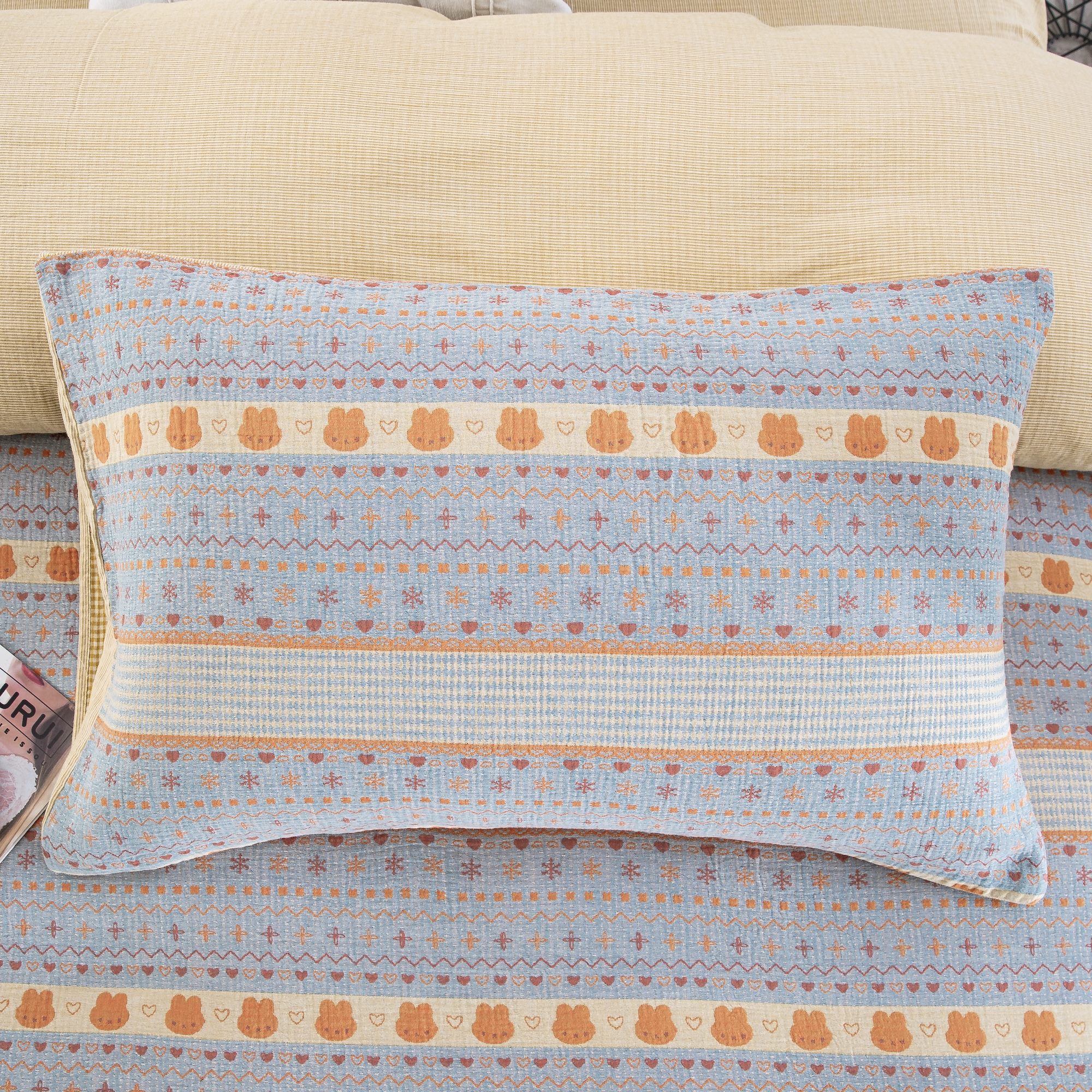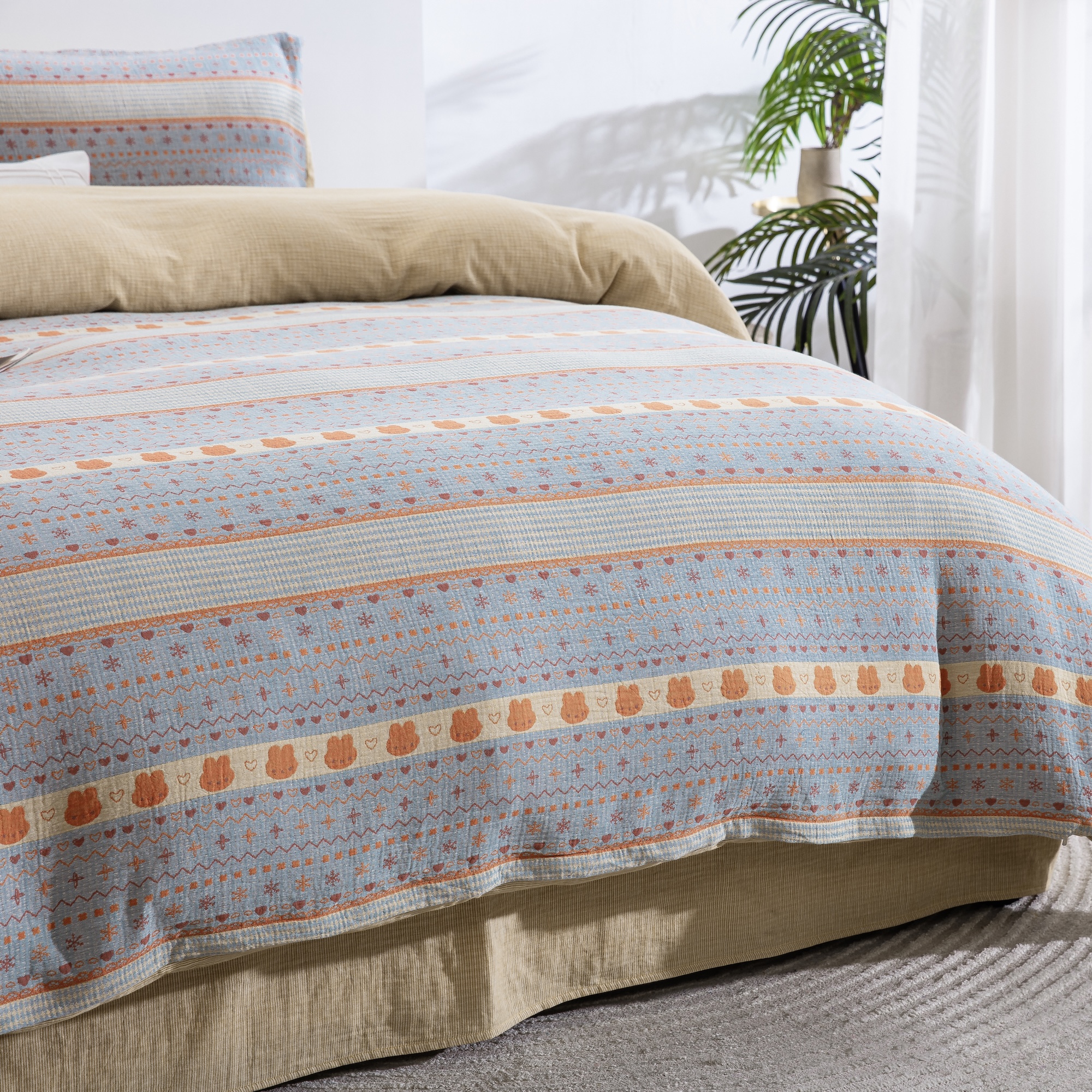 商品名称:(总)仰望棉麻双层纱供应链 2026新款全棉色织提花双层纱四件套-奶糖兔