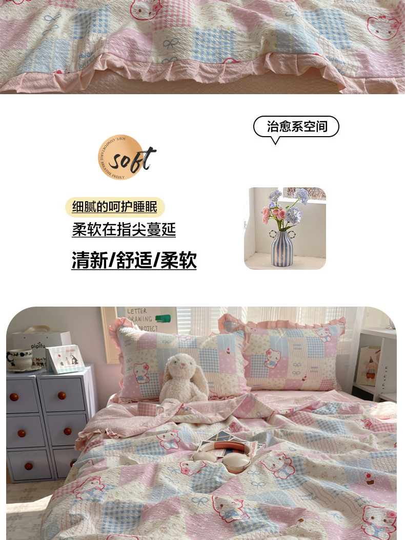 迪梦姿家纺 2026新款泡芙纱花边款夏被四件套 甜喵块块