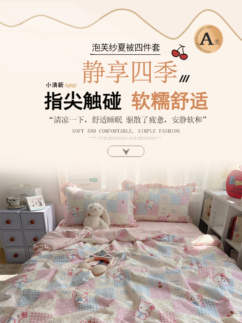 (总)迪梦姿家纺 2026新款高克重泡芙纱泡泡纱床盖款四件套系列,紫雾花蝶集,灰樱桃,春日甜桃心米,纯宅熊,猫咪集粉,躲猫猫,花野兔眠,旧街星星,莓系花伐,描线小猫咖,木马小花团,浅沙花影黄,浅沙花影蓝,田园兔,甜喵块块,甜心咖絮,甜心木马卷,兔仔花田,小兔裙边,星野蝴蝶结,悦悦小兔,只闻花香