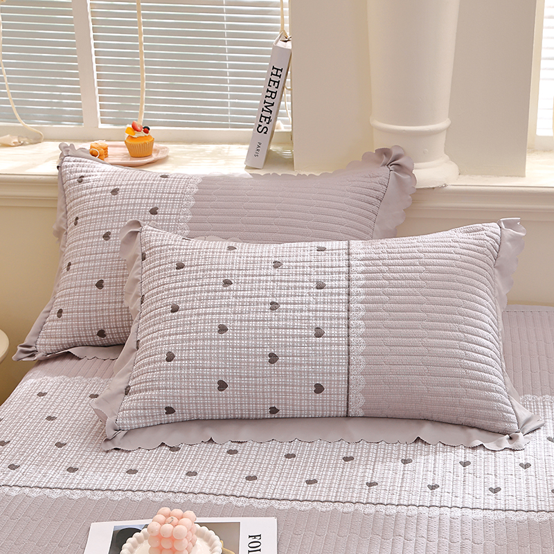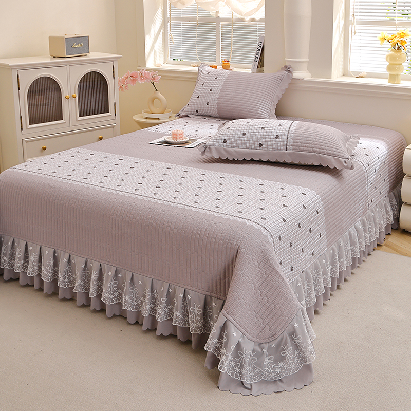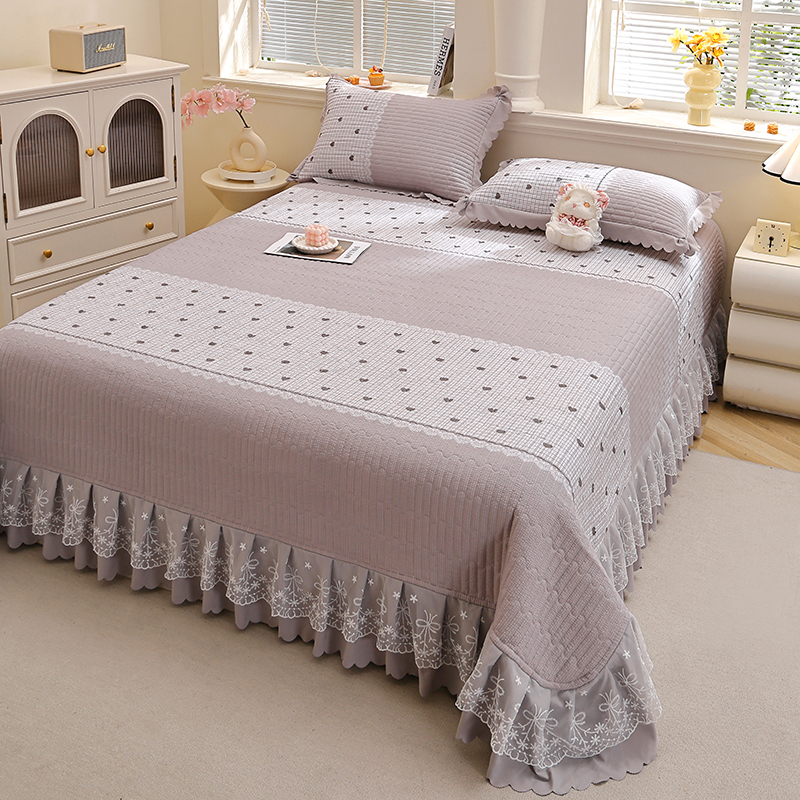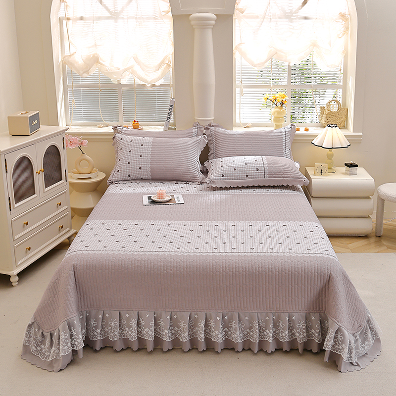 彩亿家纺 2026春夏新品四季床盖泡芙棉双层纱蕾丝床裙加厚床单 甜心灰