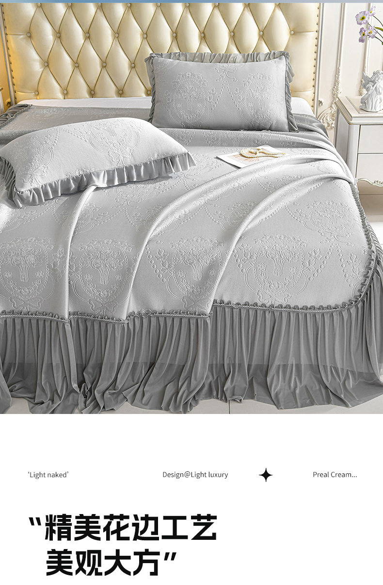 (总)畅畅家纺 2026新款锦氨夏被PE凉感豆豆凉席绣花三明治复合床裙三件套四件套,格韵-粉-床裙款,格韵-灰-床裙款,格韵-蓝-床裙款,格韵-绿-床裙款