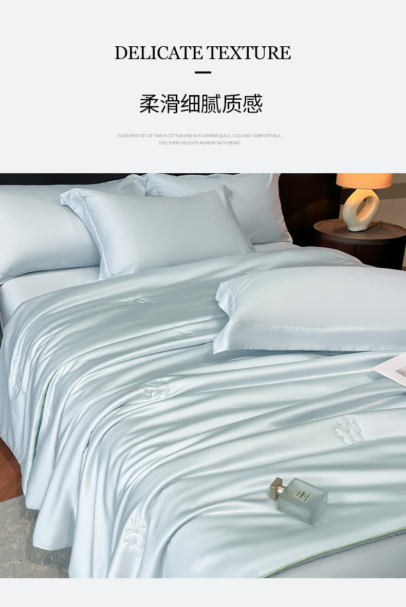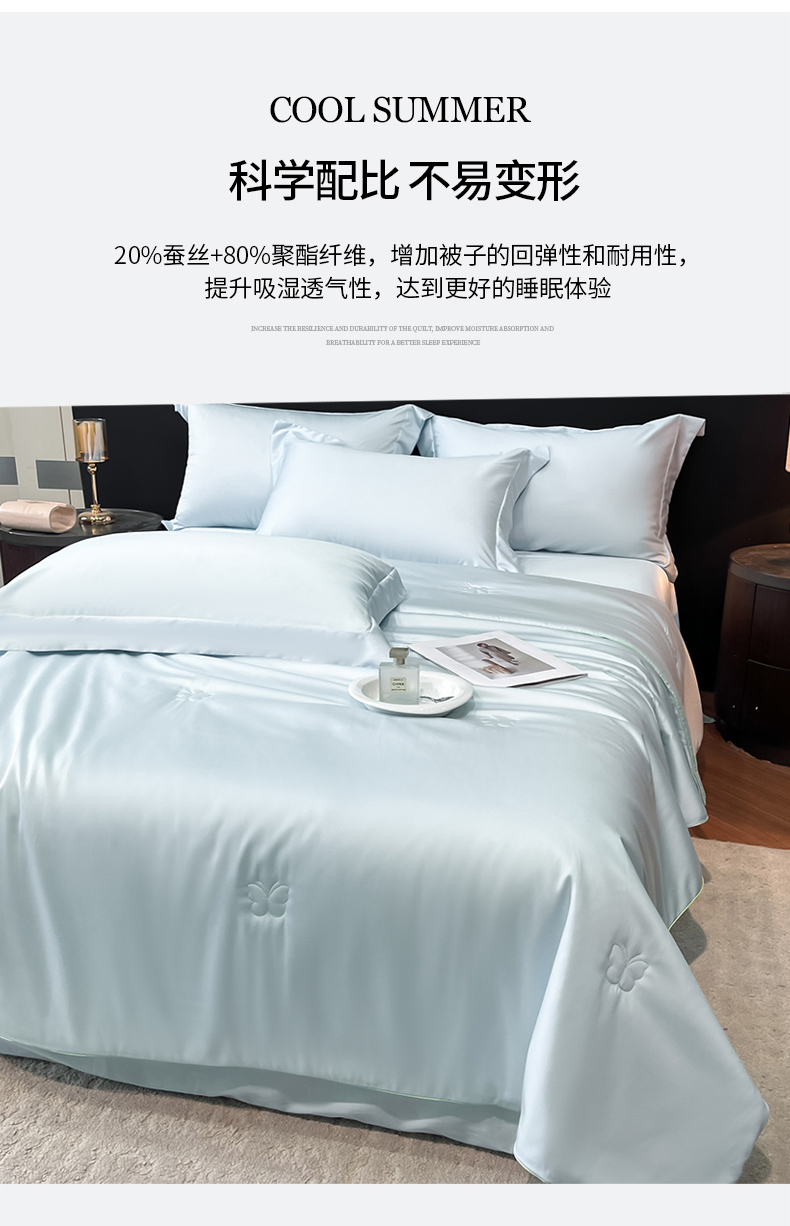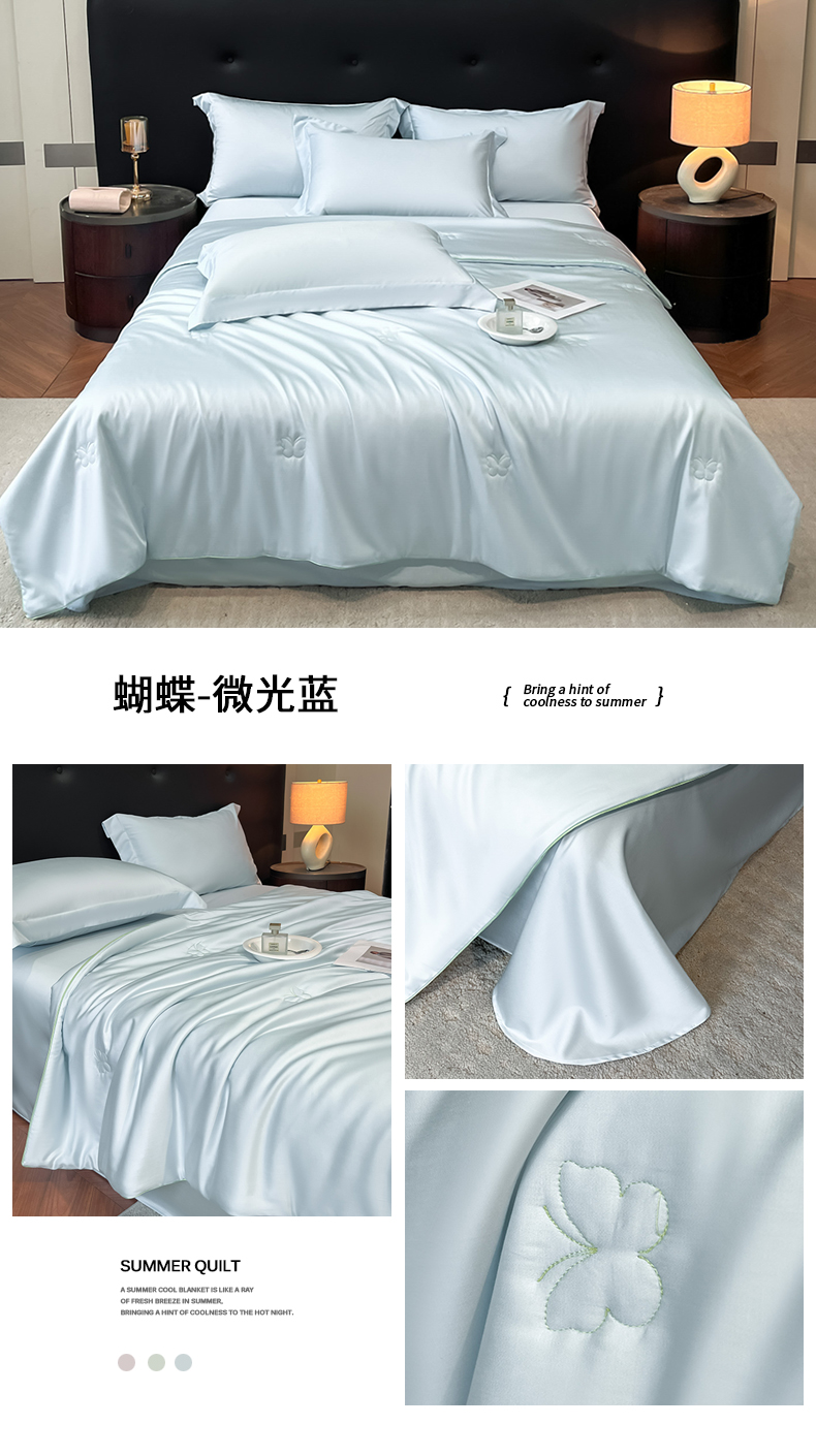 当前位置: 91家纺网 > 商品网购 > 被子 > 莱赛尔夏被 > 新方向 2026新款A类20%蚕丝天丝棉夏被四件套蝴蝶系列 蝴蝶-微光蓝