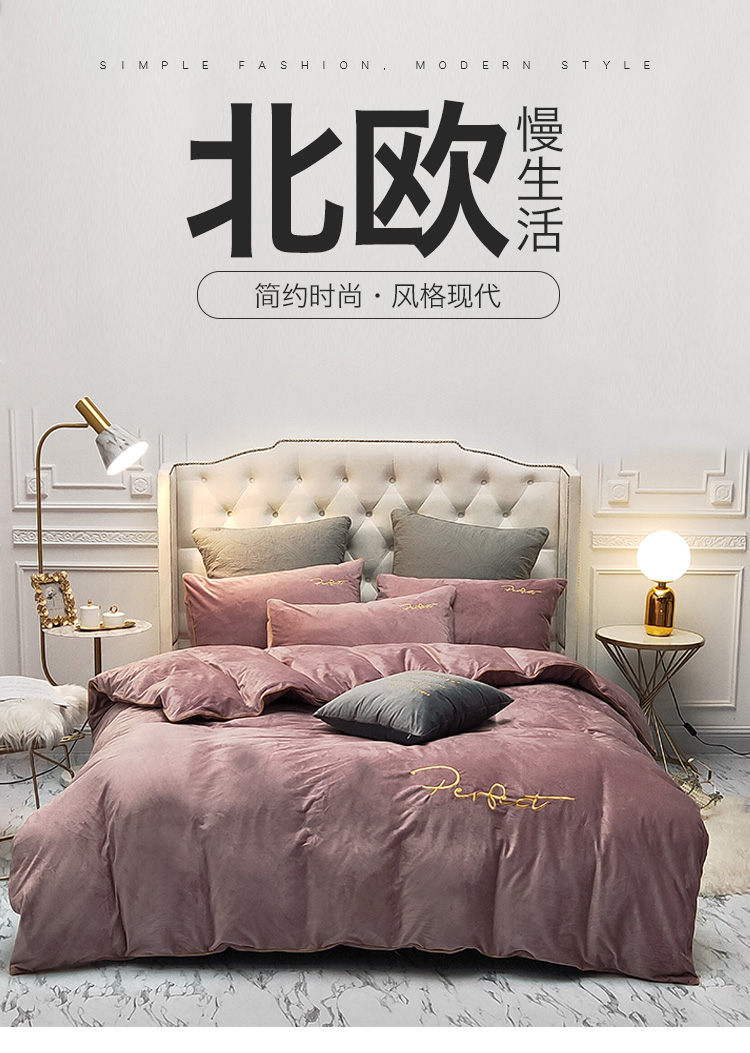 米奈 2020北欧水晶绒四件套法莱绒四件套滚边绣花罗恩 豆沙