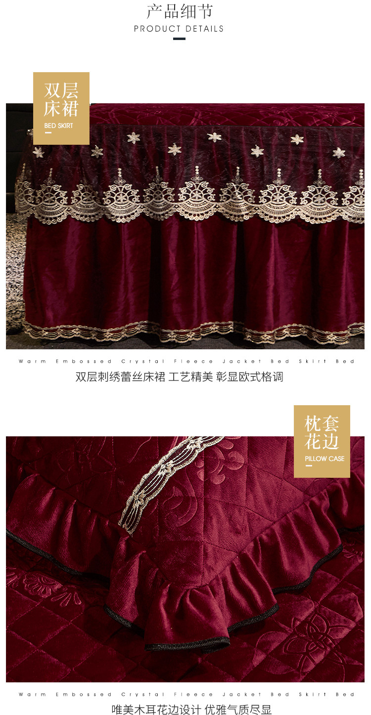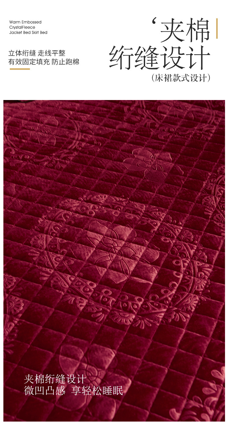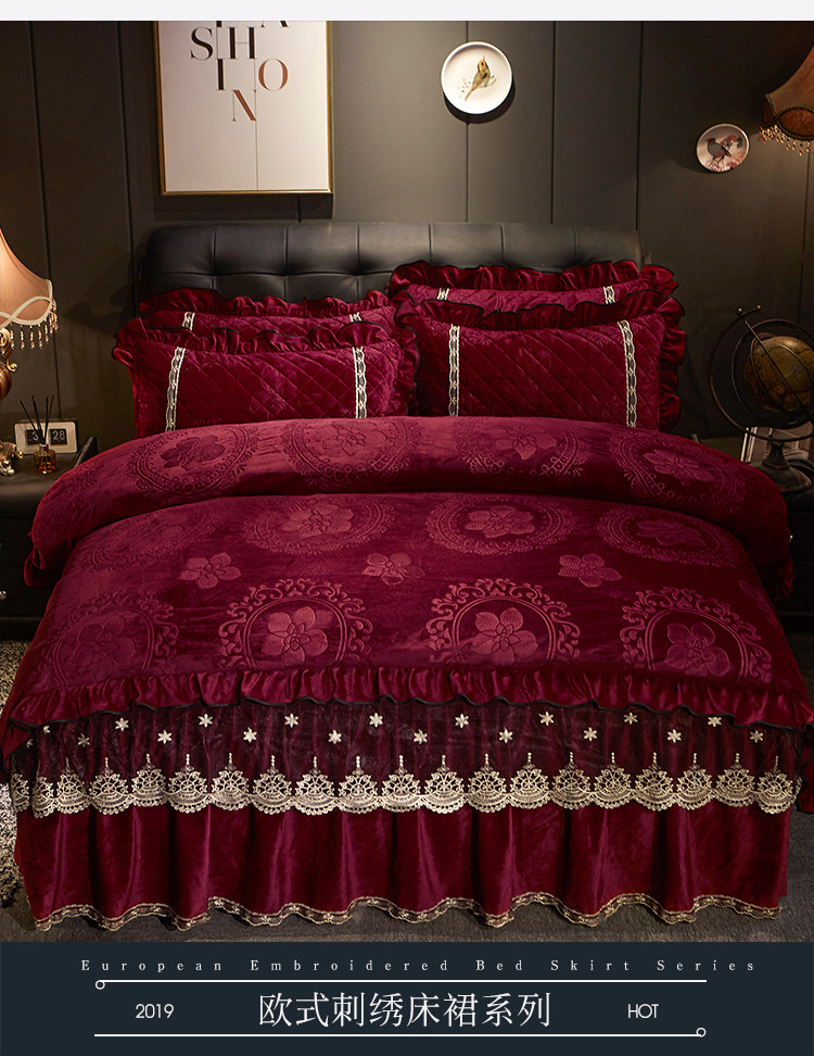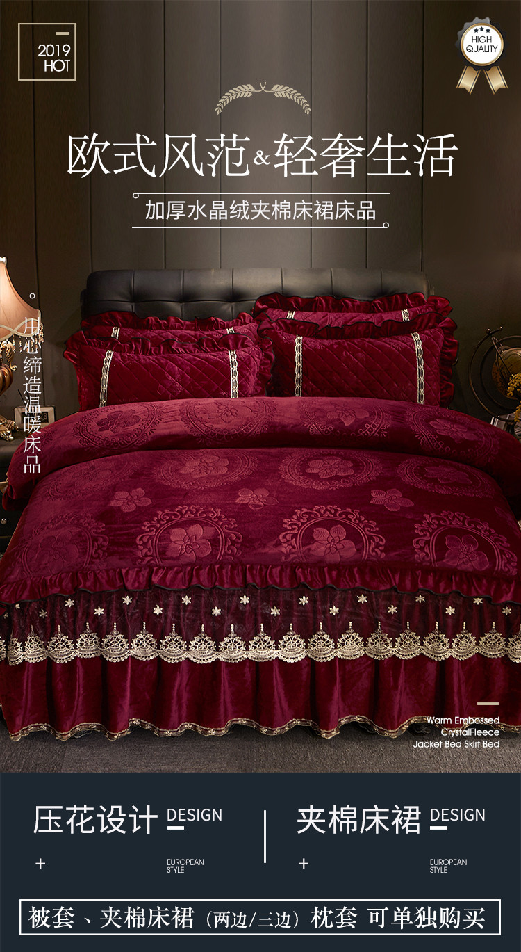 商品名称:宜凡家纺 2019新款水晶绒夹棉床裙四件套 花之都-酒红