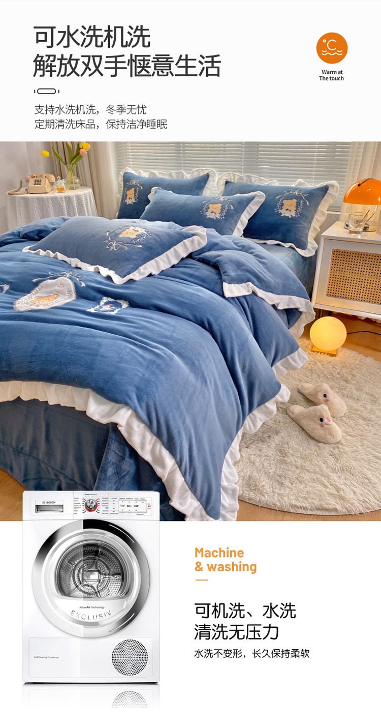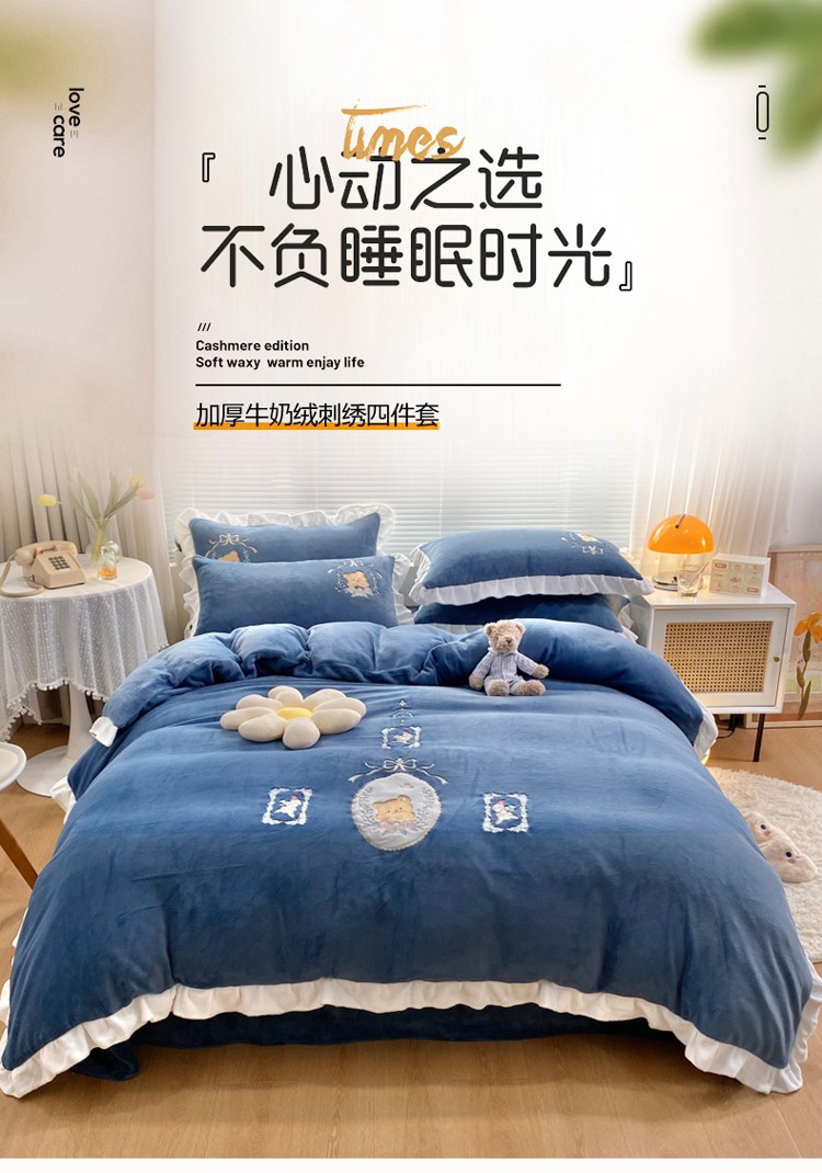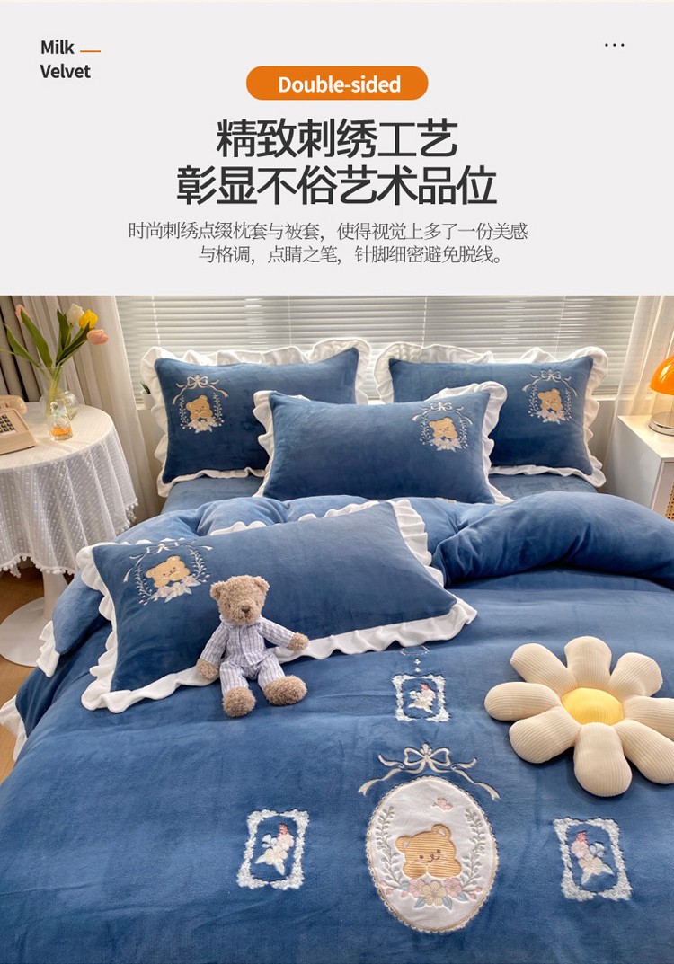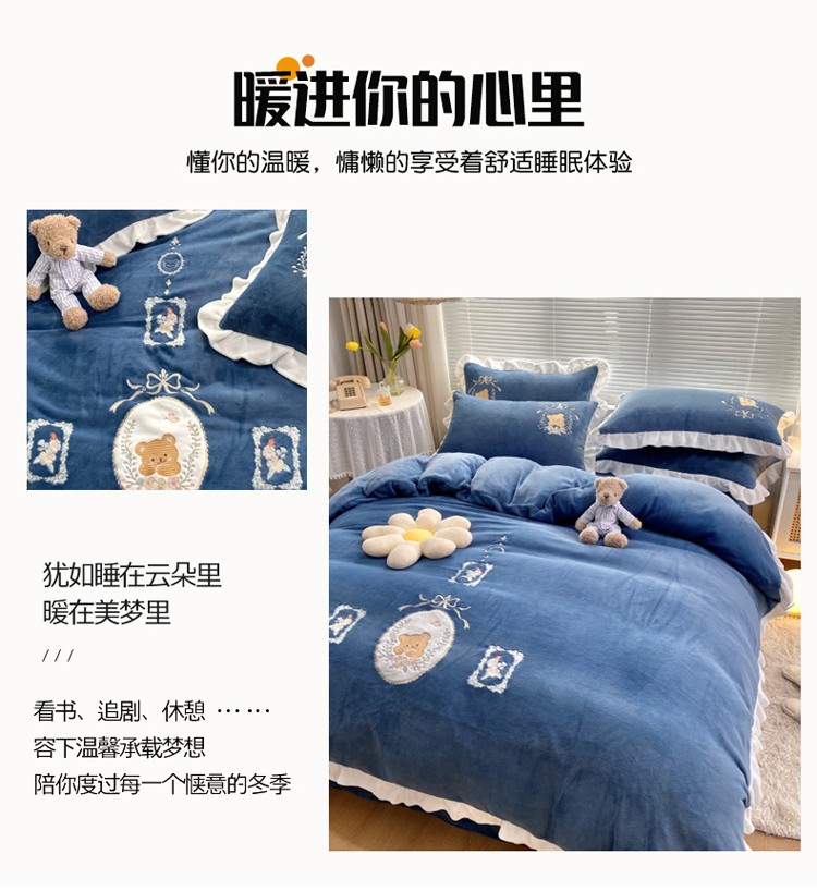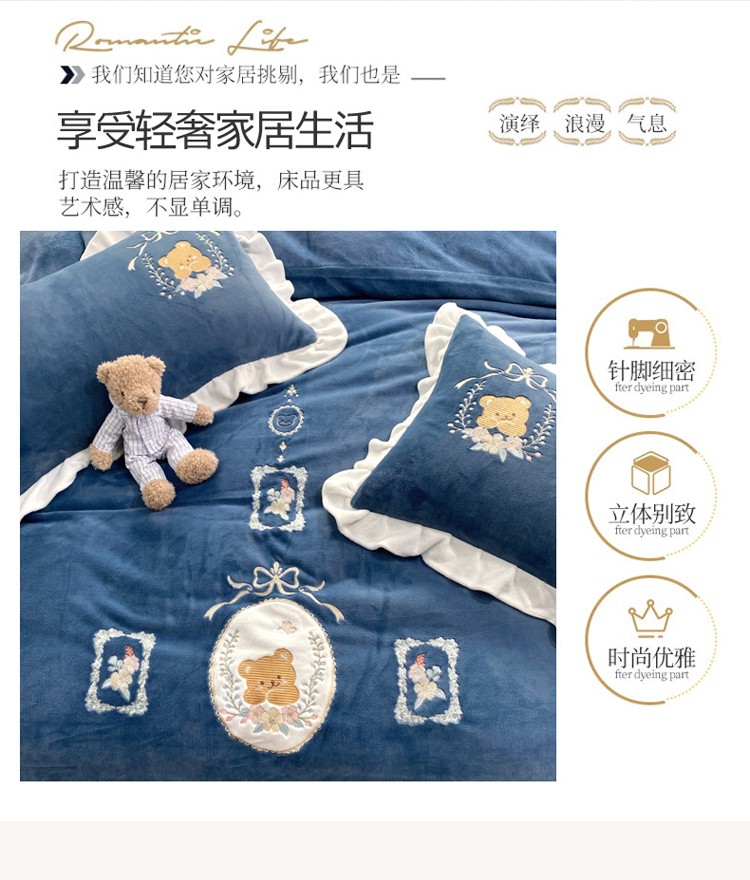 星尚 高品质牛奶绒绣花四件套加厚法莱宝宝婴儿绒-乖乖熊 莫蓝