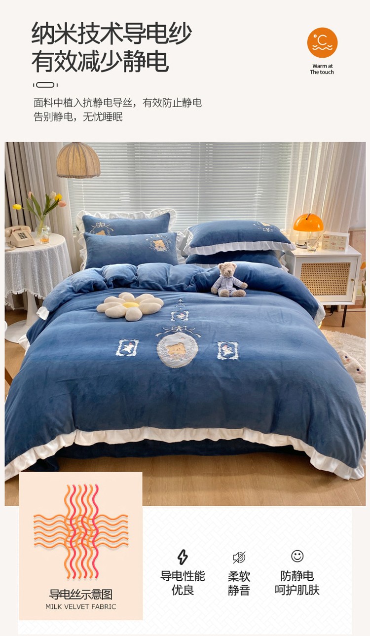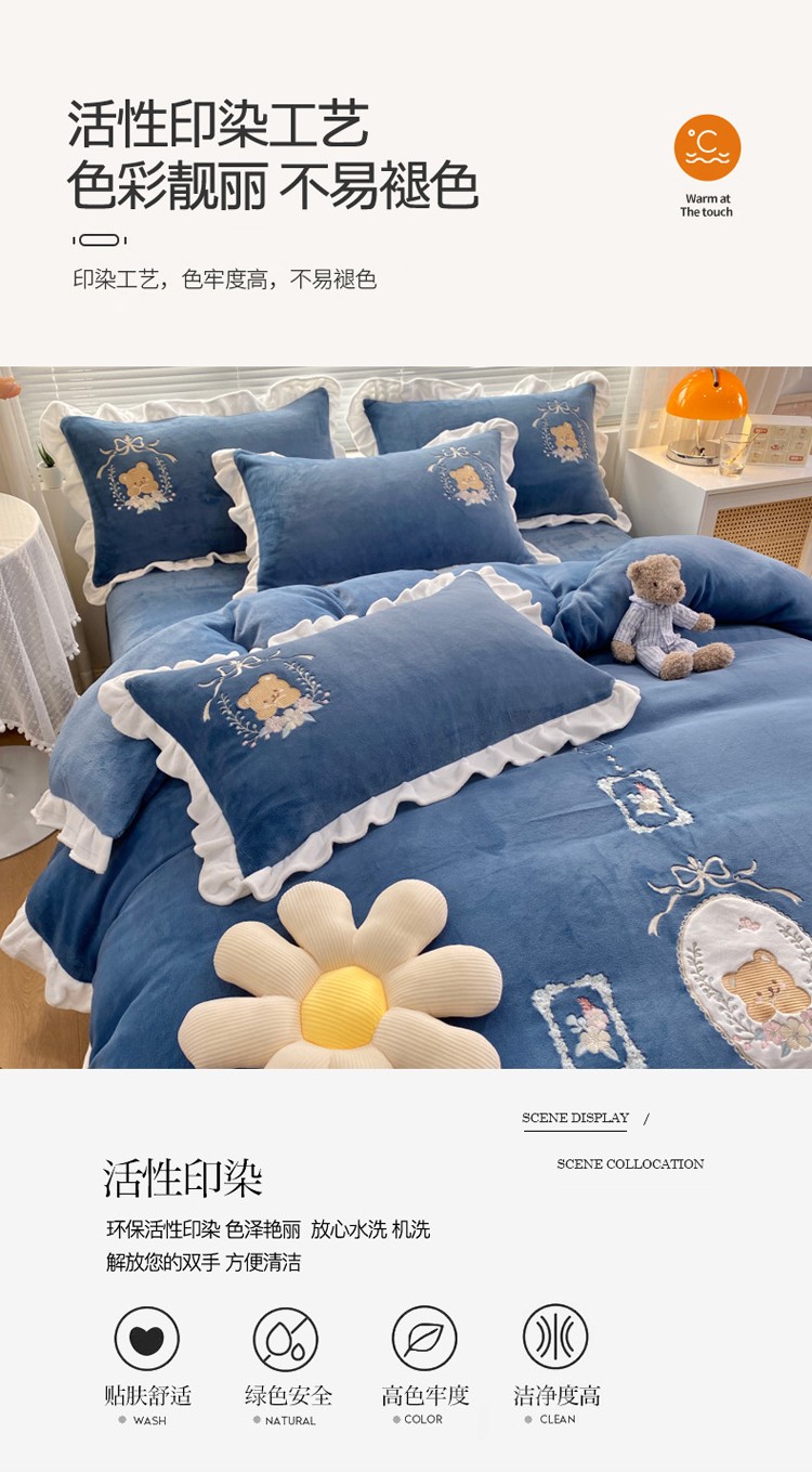 商品名称:星尚 高品质牛奶绒绣花四件套加厚法莱宝宝婴儿绒-乖乖熊 莫蓝