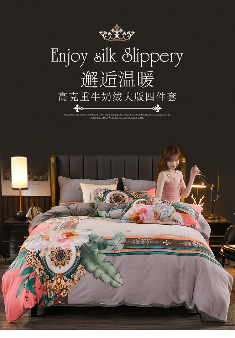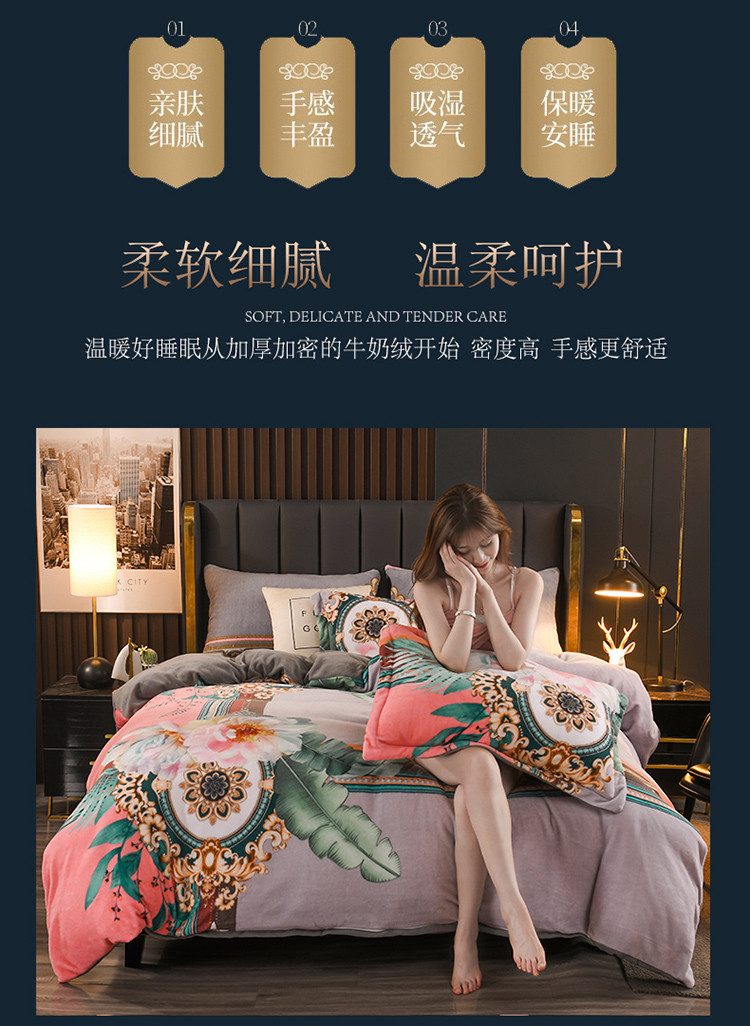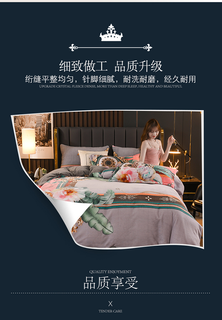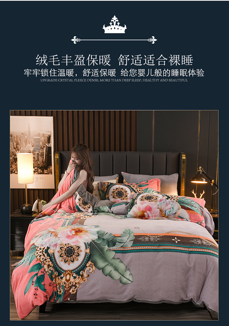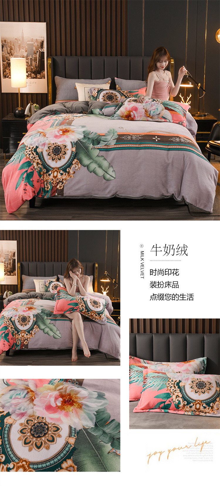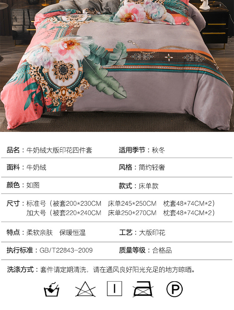 商品名称:席佬大 2025新款直播款大版印花牛奶绒四件套 绿叶牡丹