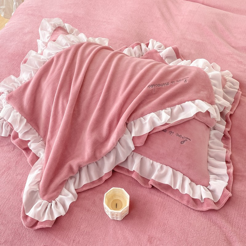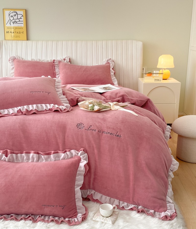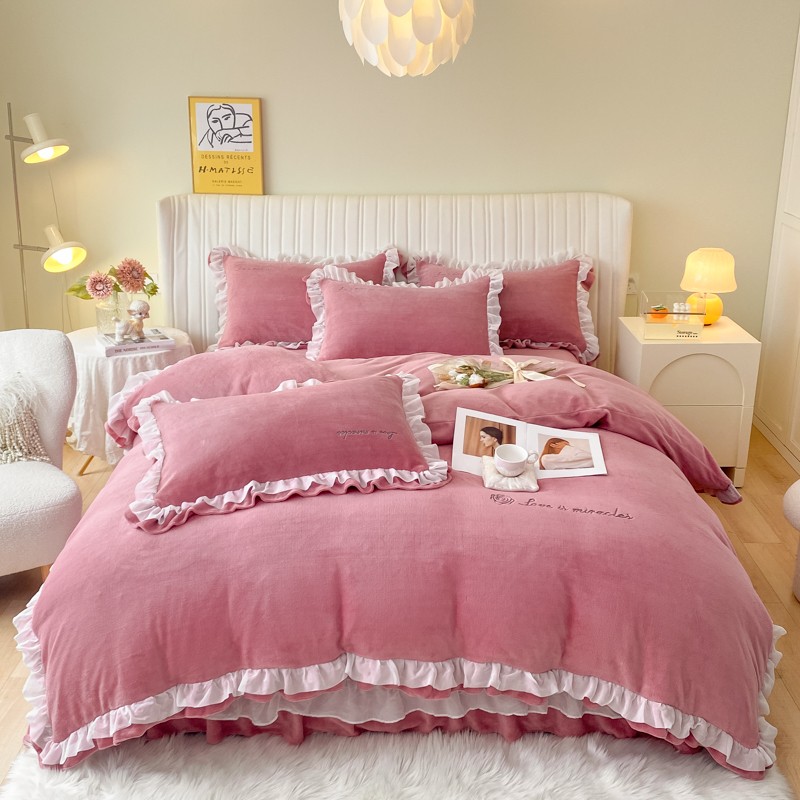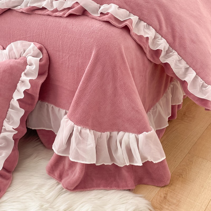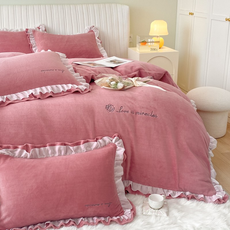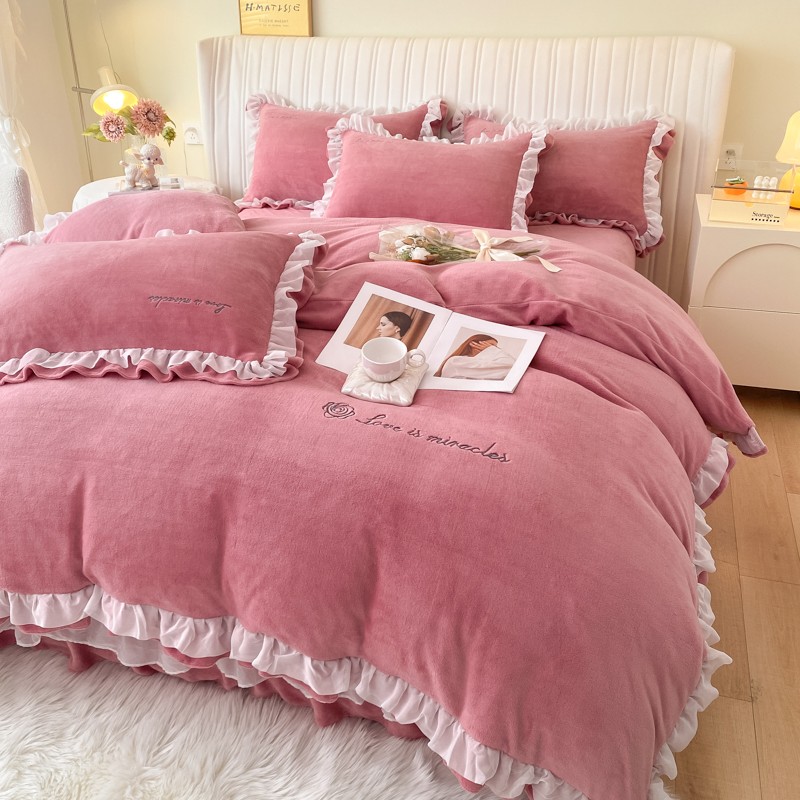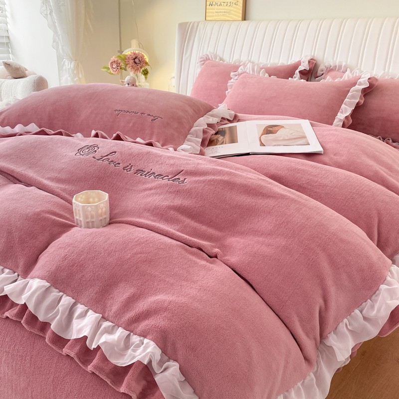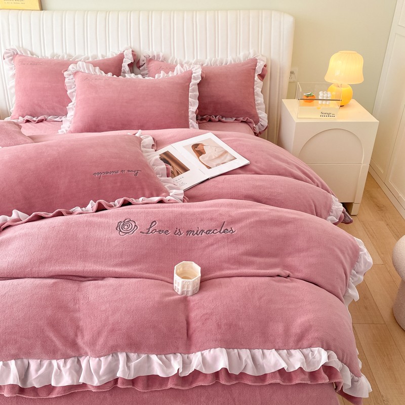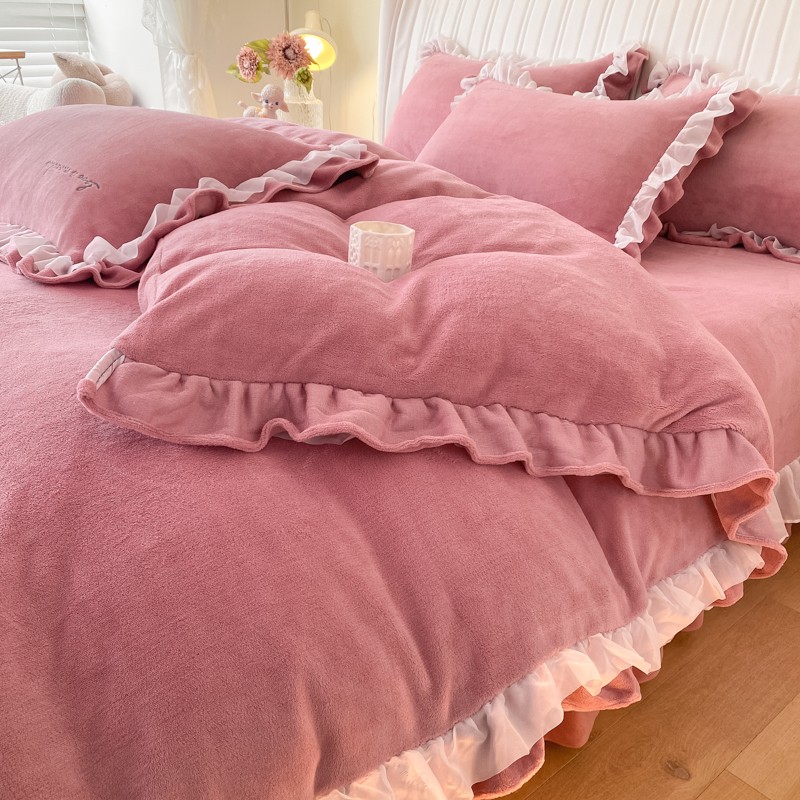 商品名称:金丝鸟 2022新款200克韩式公主风花边款牛奶绒四件套 豆沙