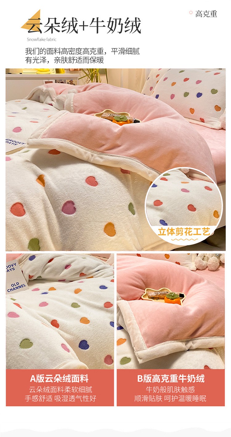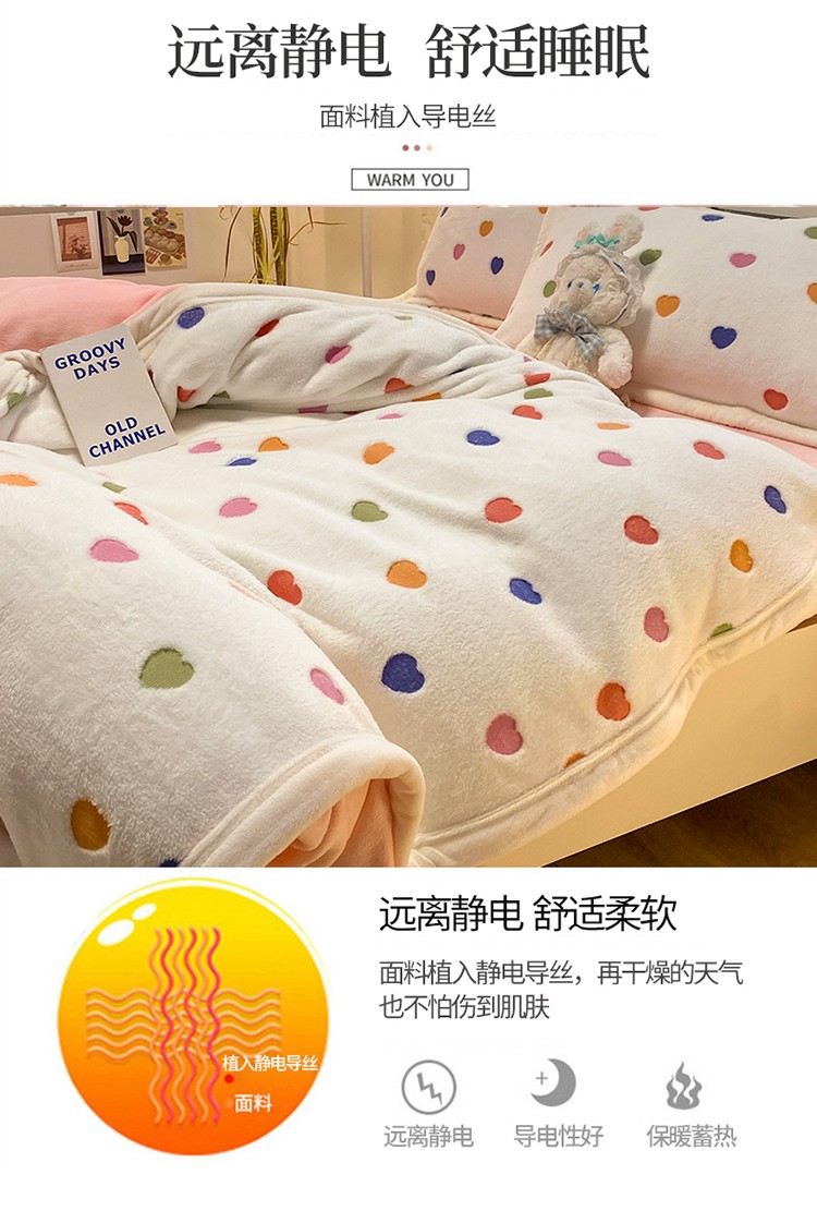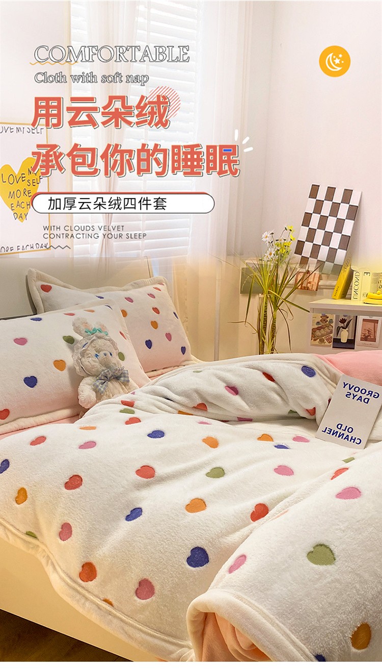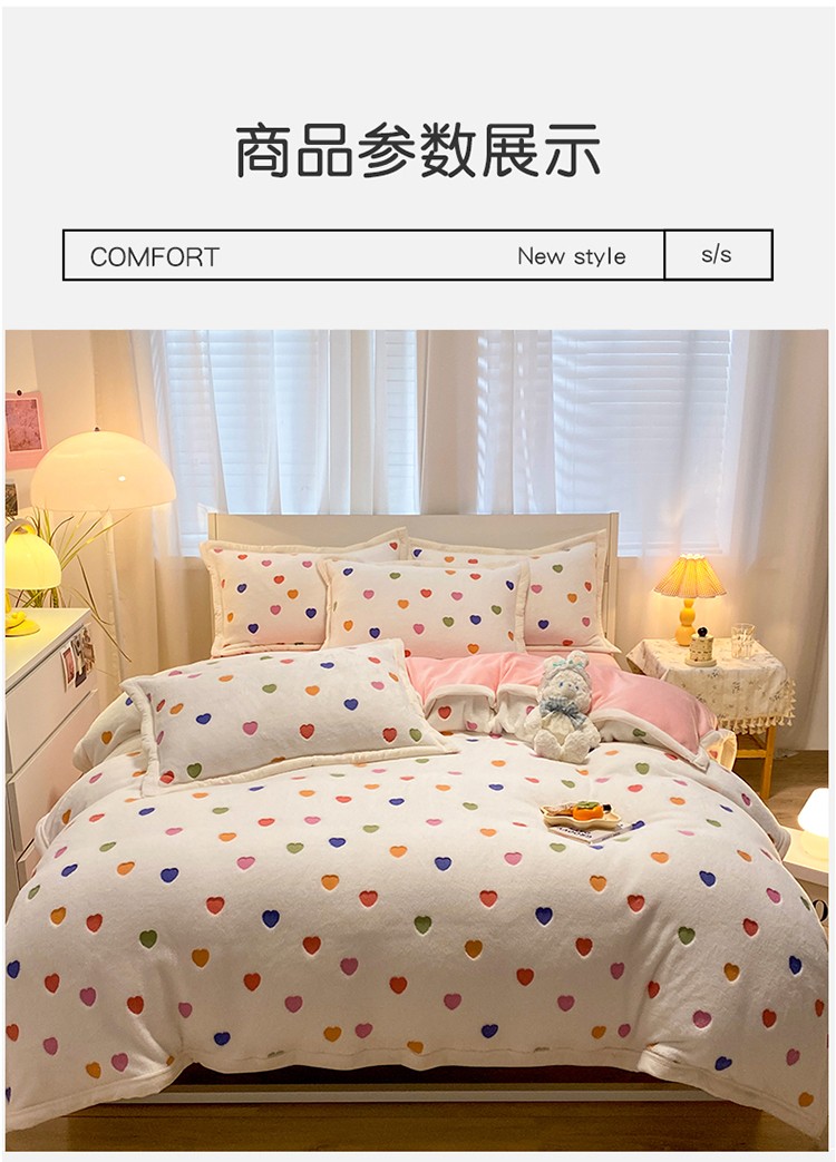 商品名称:川悦生活 2022小清新牛奶绒纯色印花云朵绒四件套 多彩心心